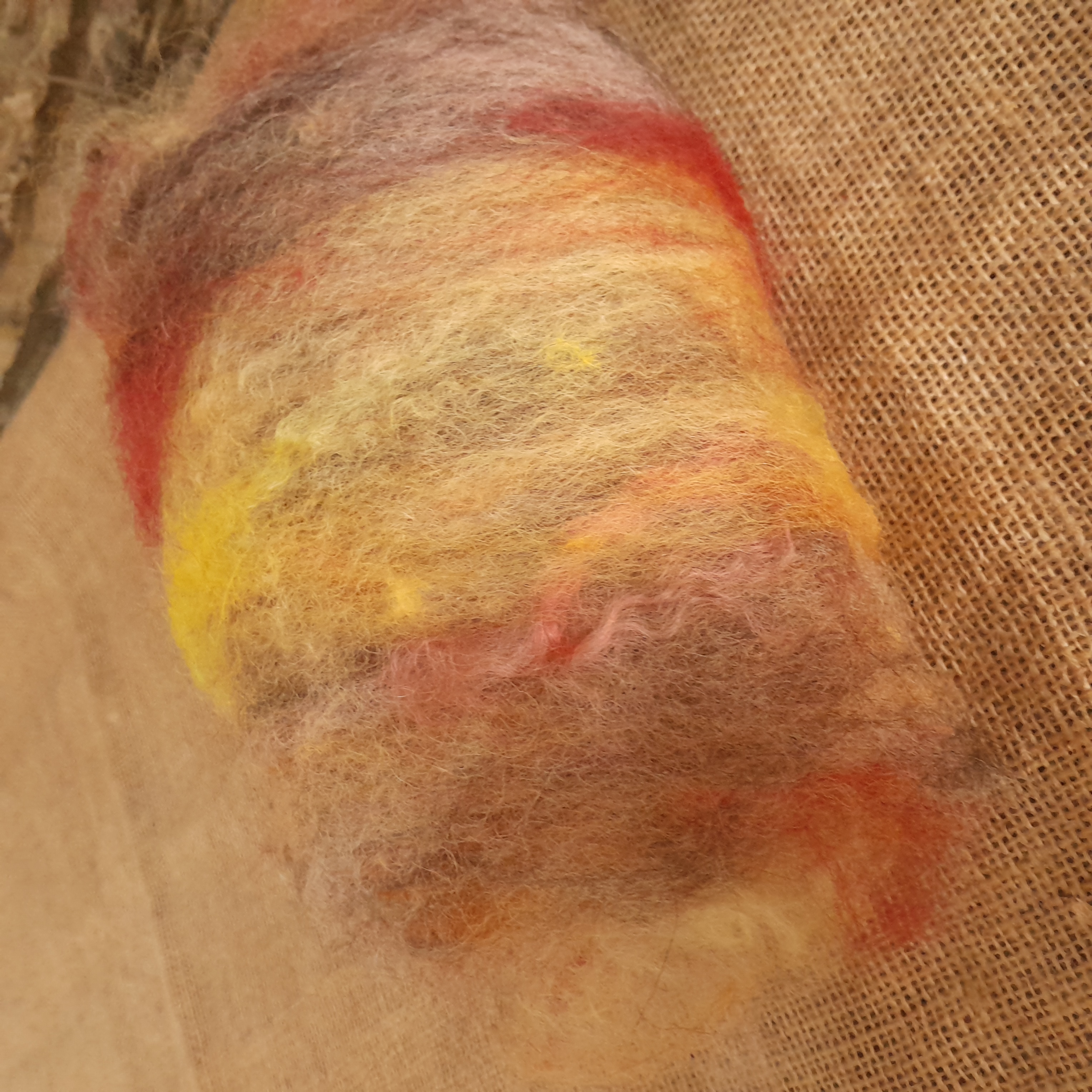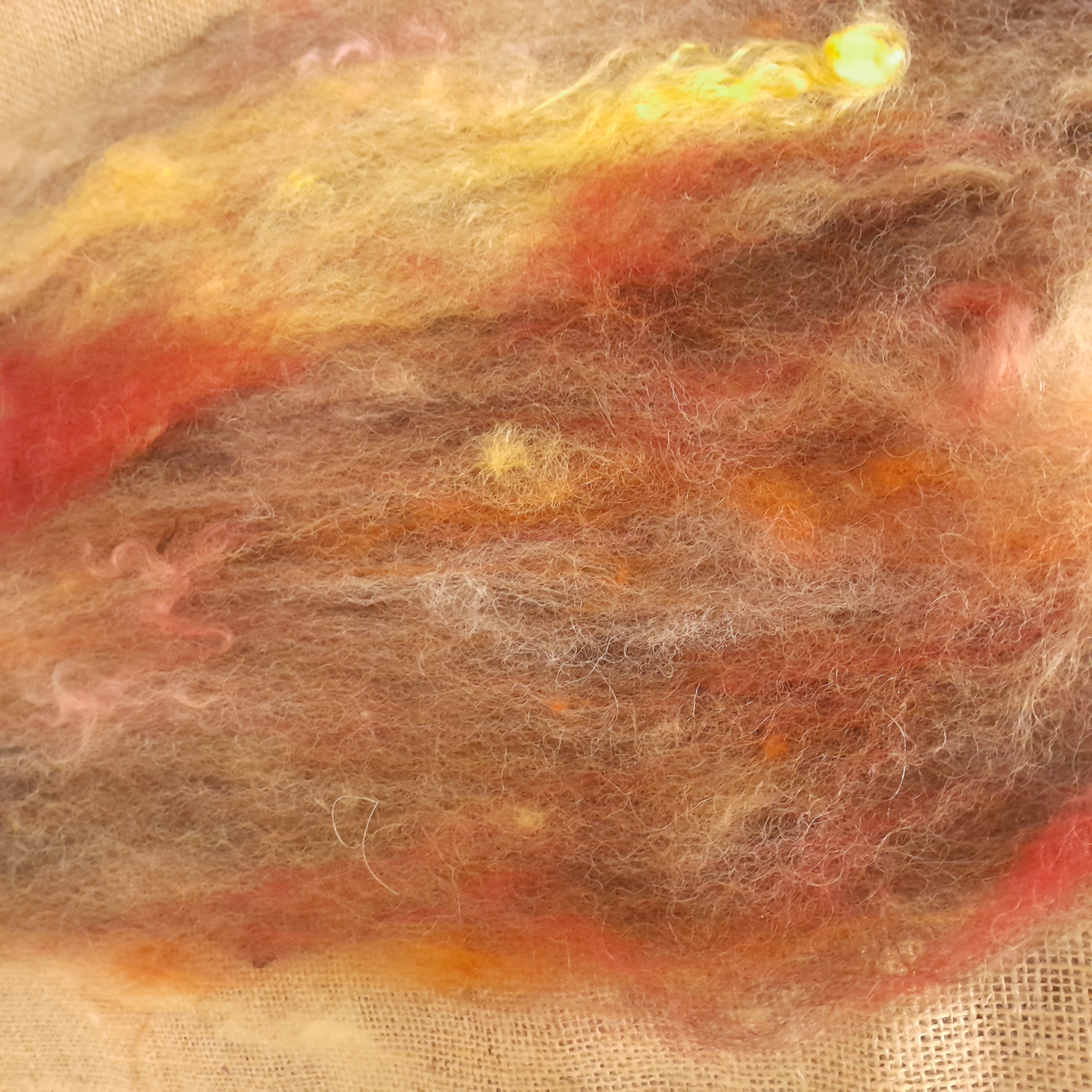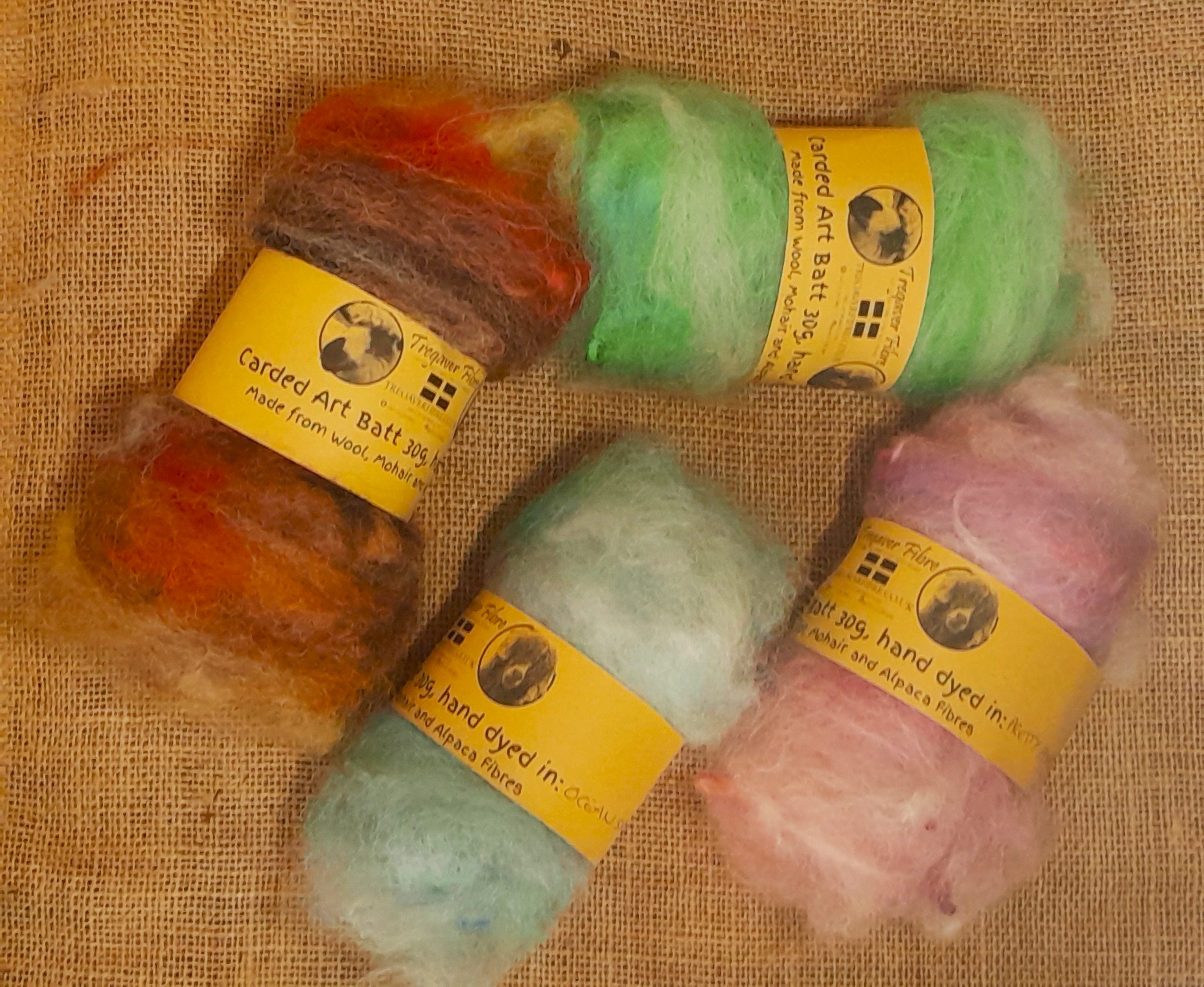 Our carded art batts have been handmade on our drum carder. They are made from our own various types of hand dyed wools and fibres. These have all been lightly carded so there are still some natural textures that can be found in the batt - for instance, you'll notice a few curly teeswater locks in the batts, some blue faced leicester tiny curls, and some valais waves - our batts have been created to have a mix of breeds of wool sheep in, to allow for ease of felting, and some also contain some mohair and alpaca, for a touch of luxury!