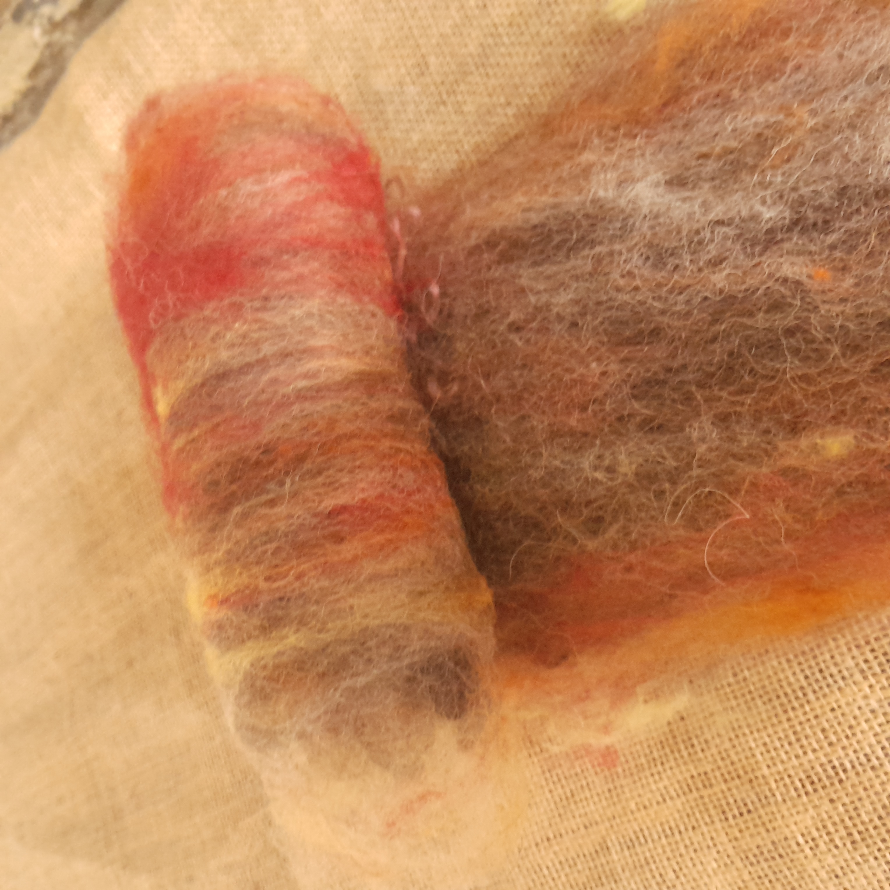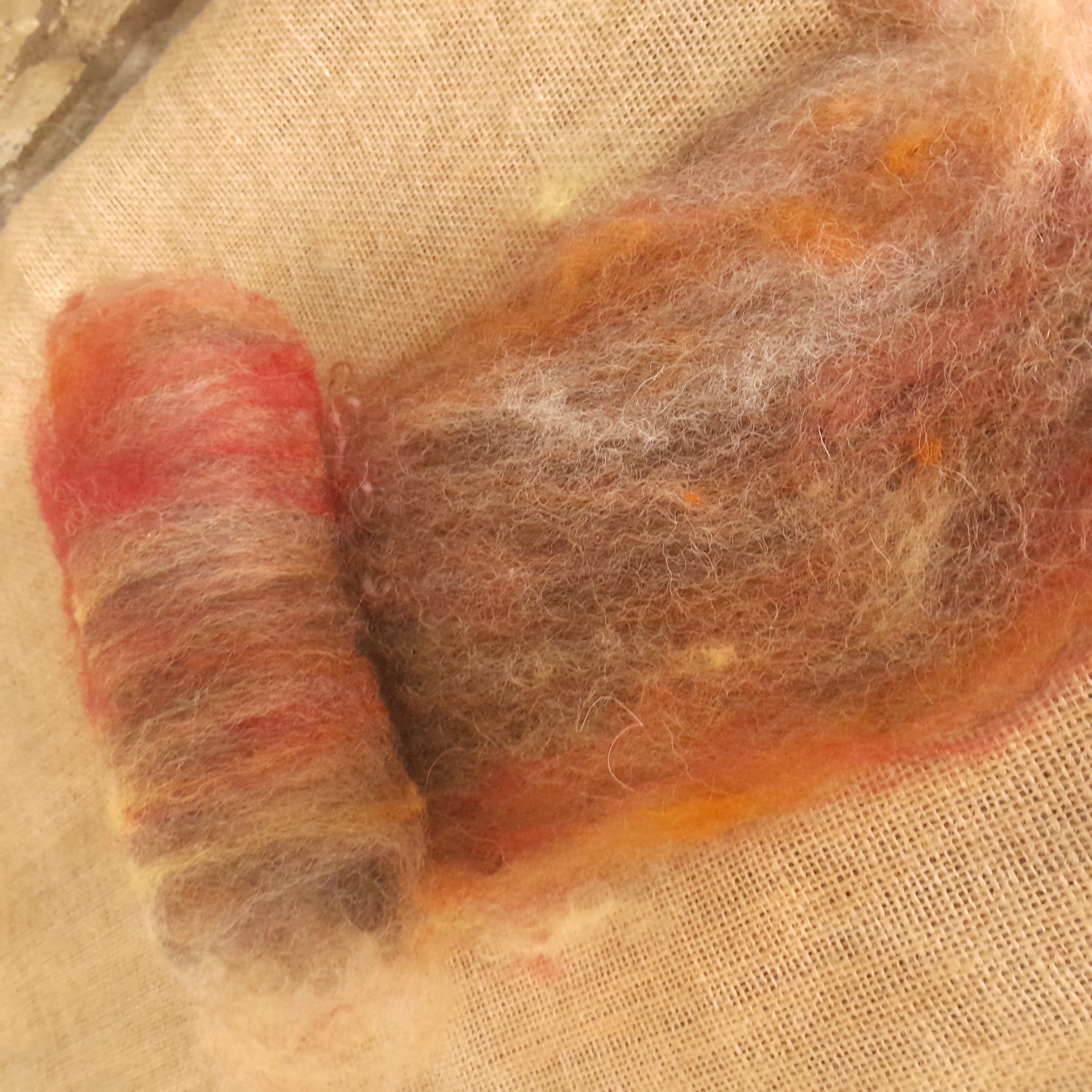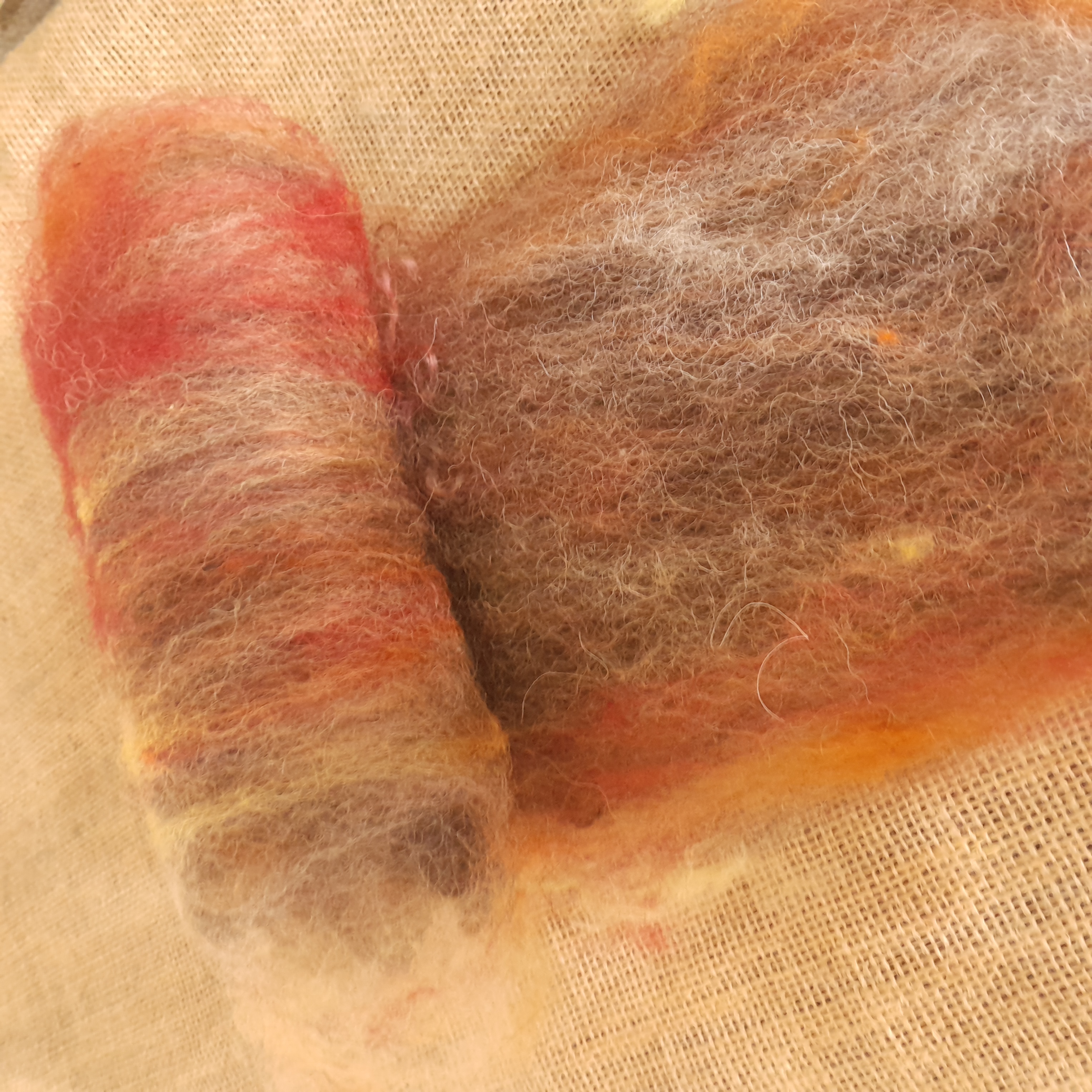 Our carded art batts have been handmade on our drum carder. They are made from our own various types of hand dyed wools and fibres. These have all been lightly carded so there are still some natural textures that can be found in the batt - for instance, you'll notice a few curly teeswater locks in the batts, some blue faced leicester tiny curls, and some valais waves - our batts have been created to have a mix of breeds of wool sheep in, to allow for ease of felting, and some also contain some mohair and alpaca, for a touch of luxury!