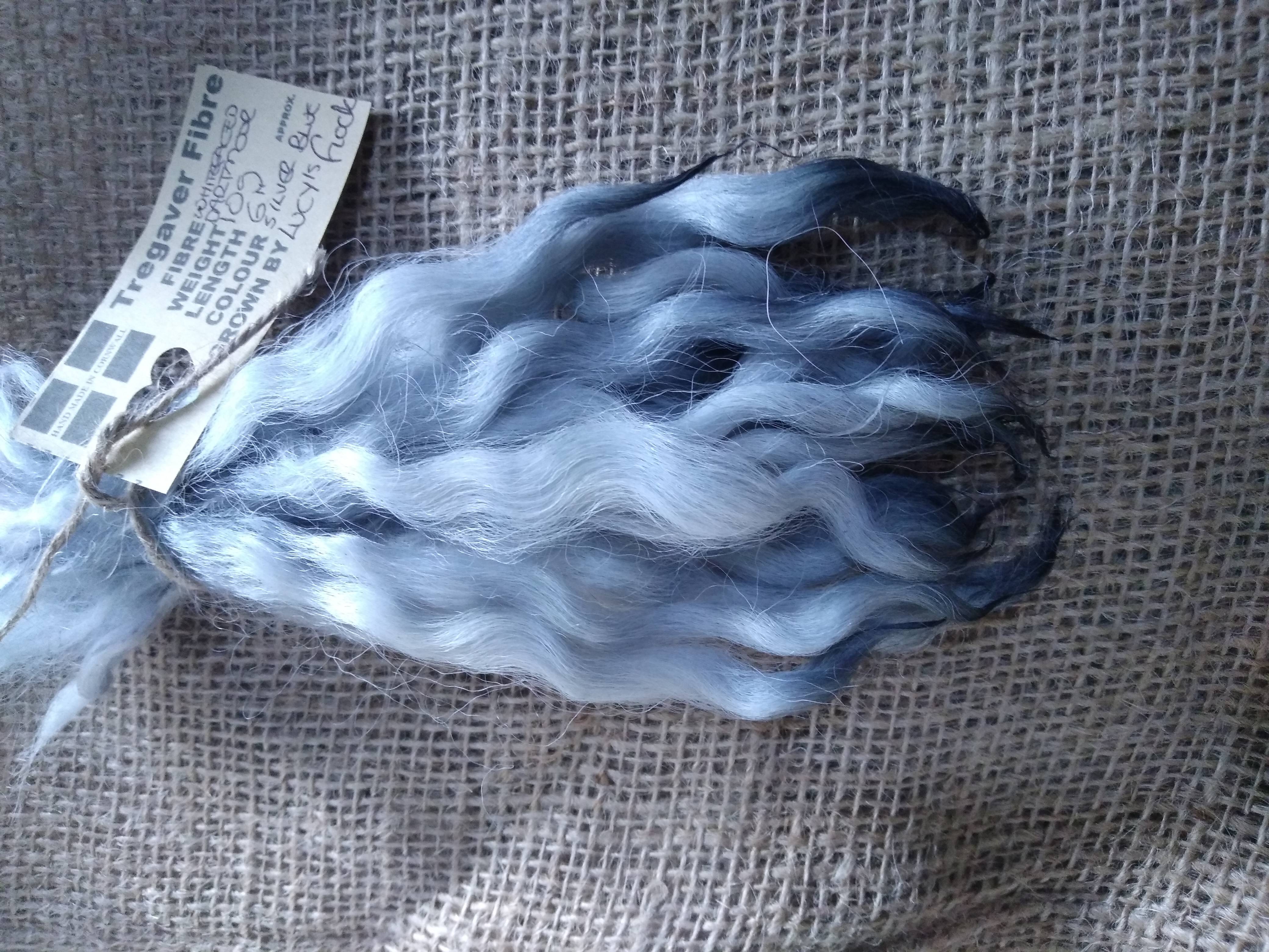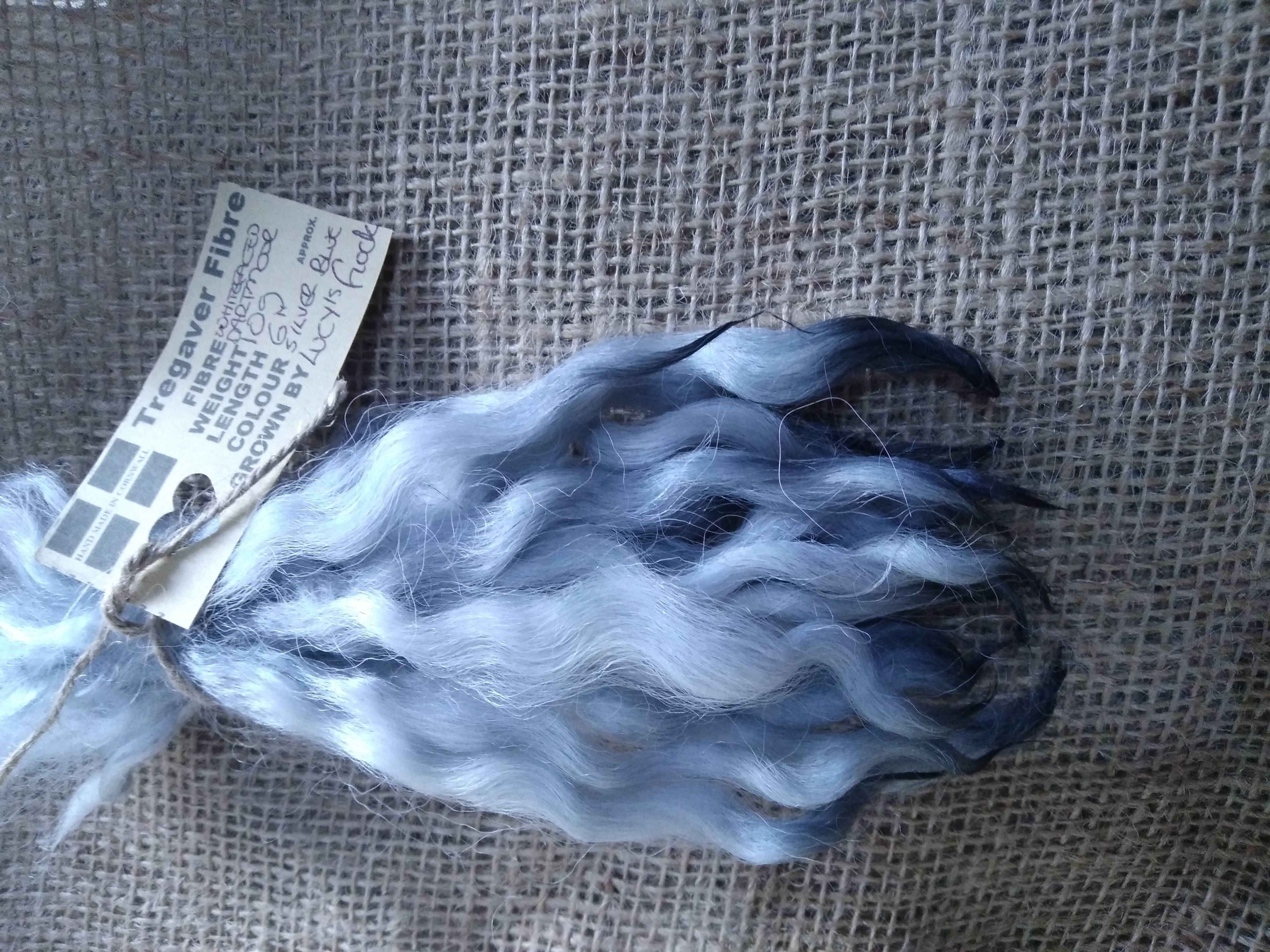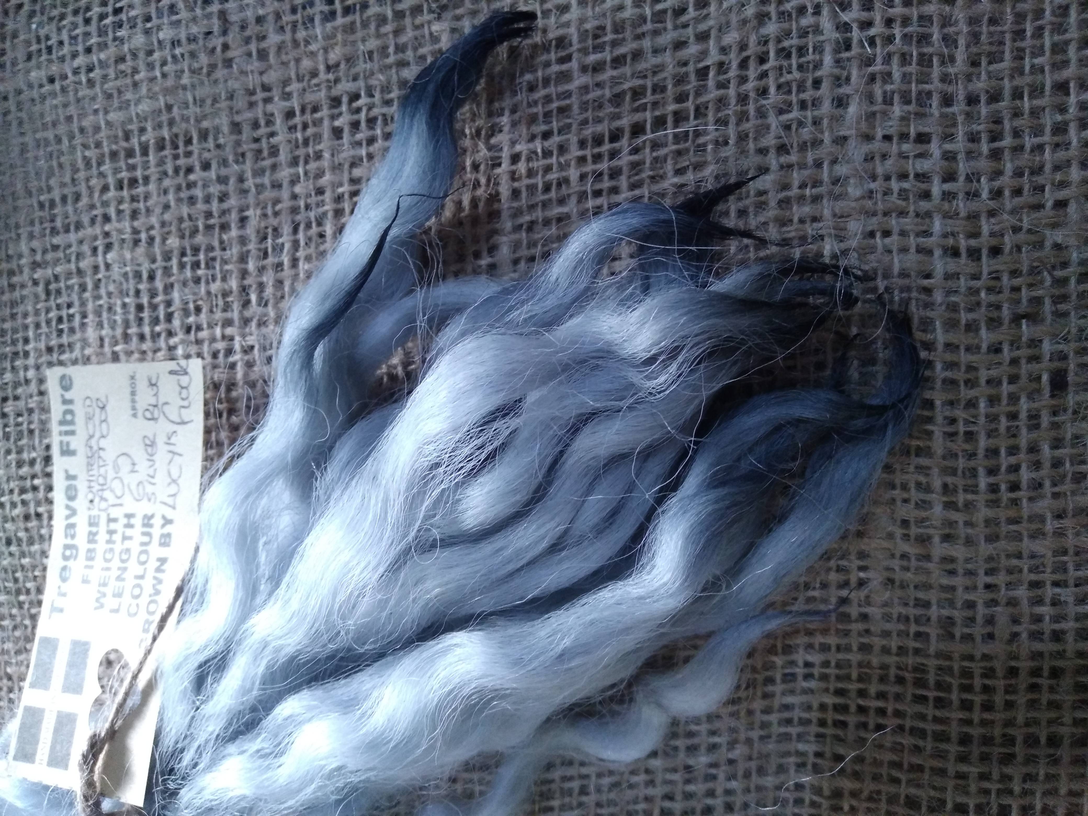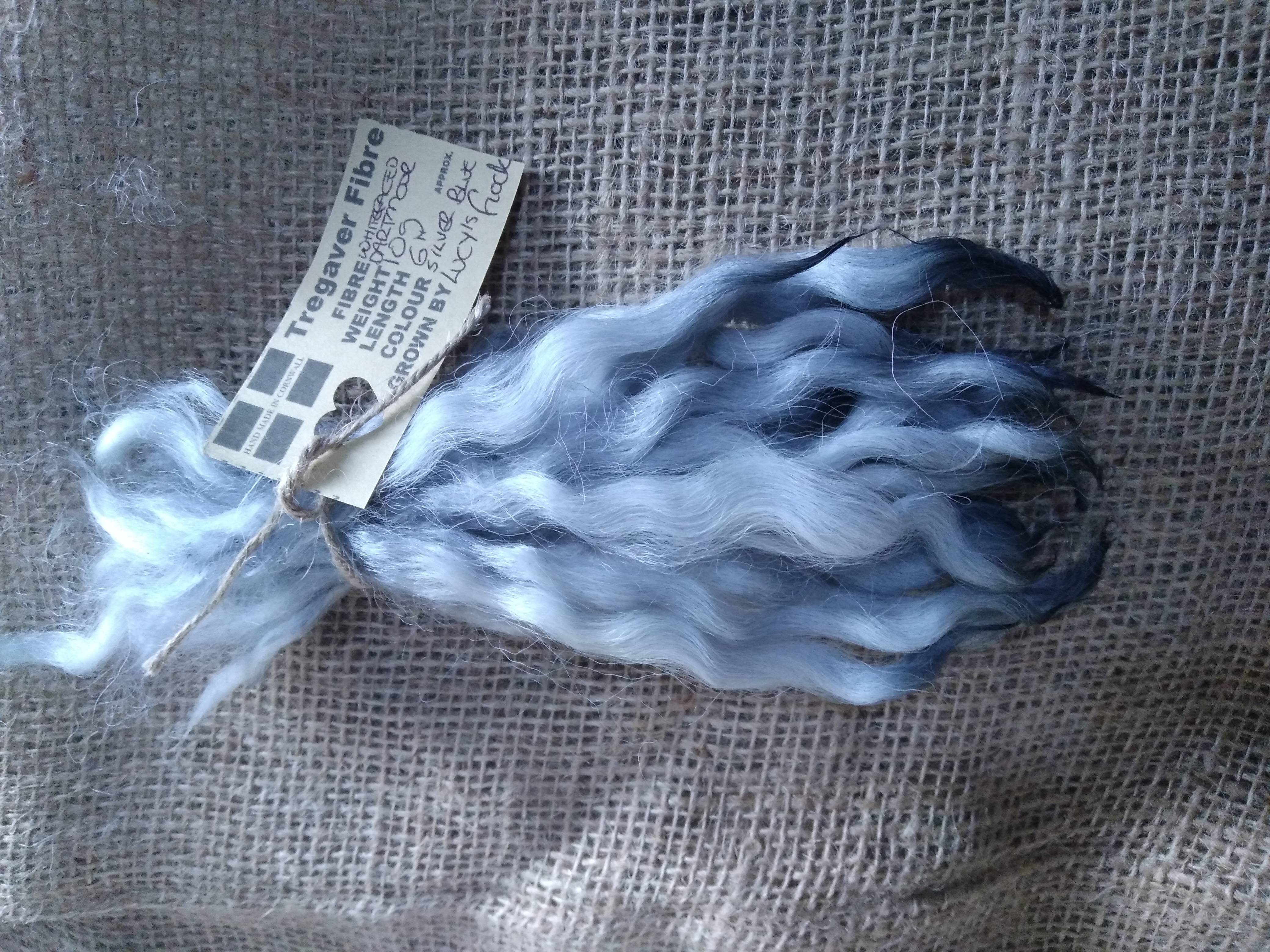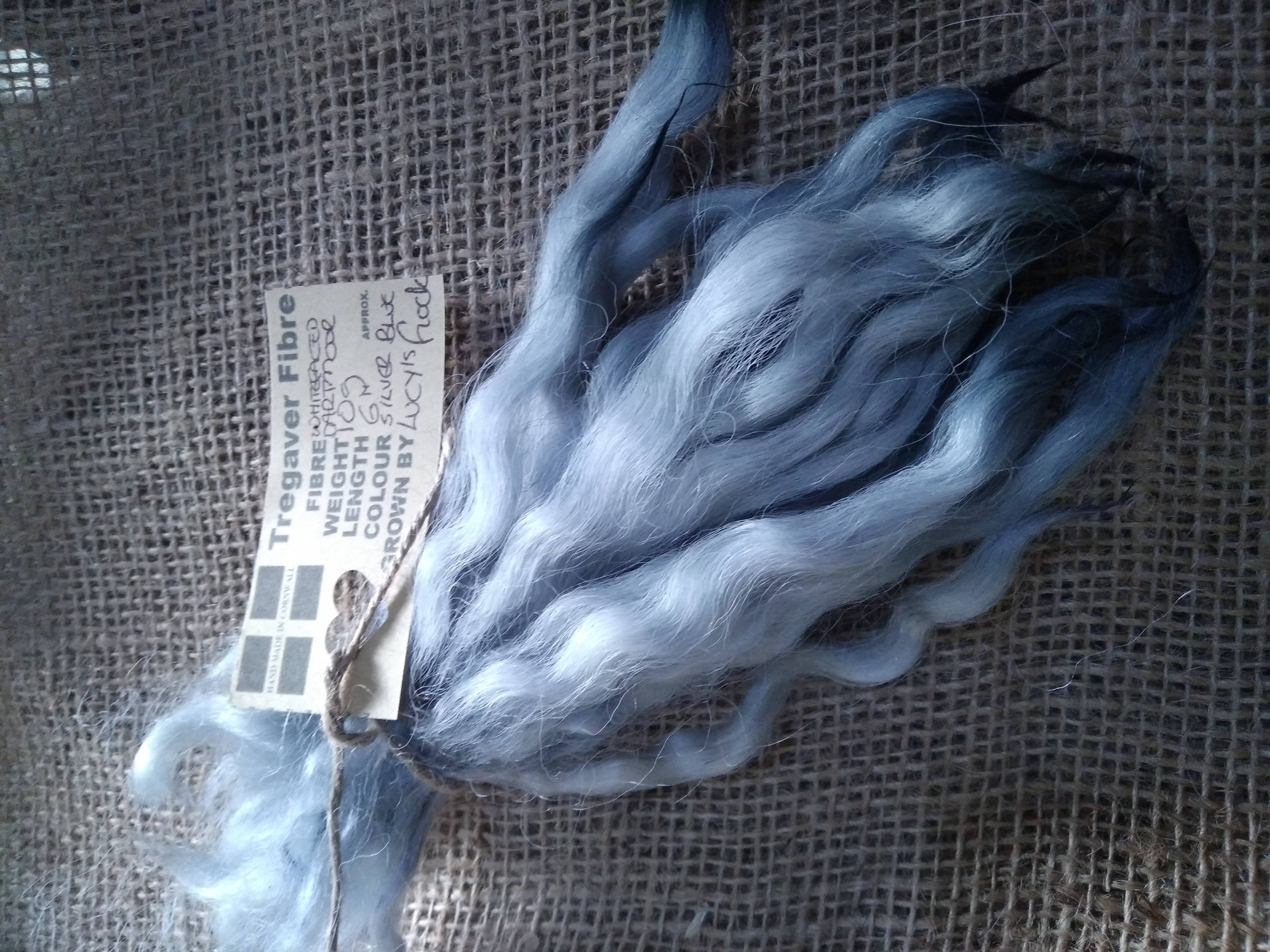 These have been 100% hand processed (very well washed by hand multiple times) and are dyed in a light silvery blue mix.