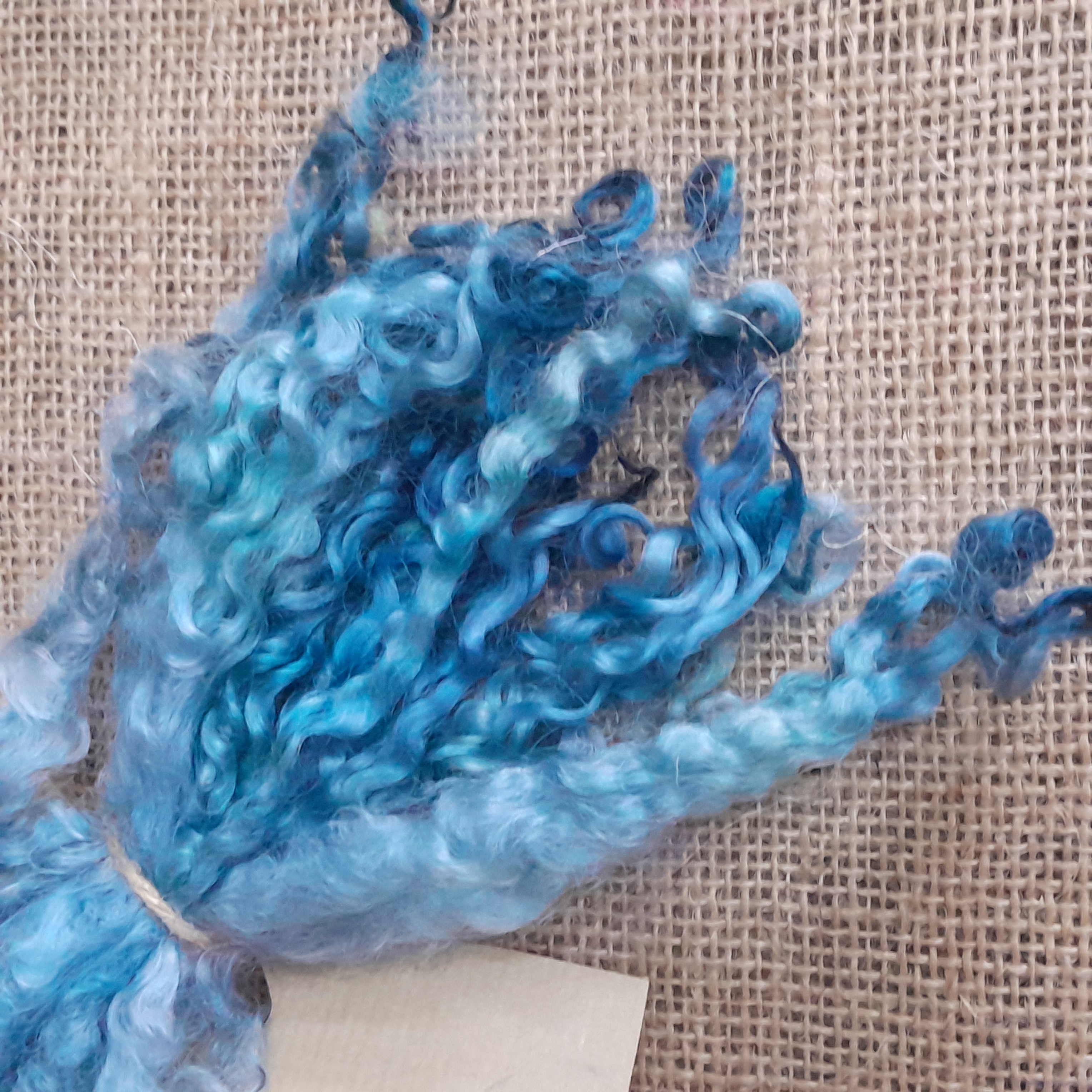 These locks have a lovely mix of blue tones with soft silvery highlights that really shift depending on the light. No two bunches look exactly the same, which makes them extra special to work with. The curls are long, bouncy, and full of movement, perfect if you love wool with character.