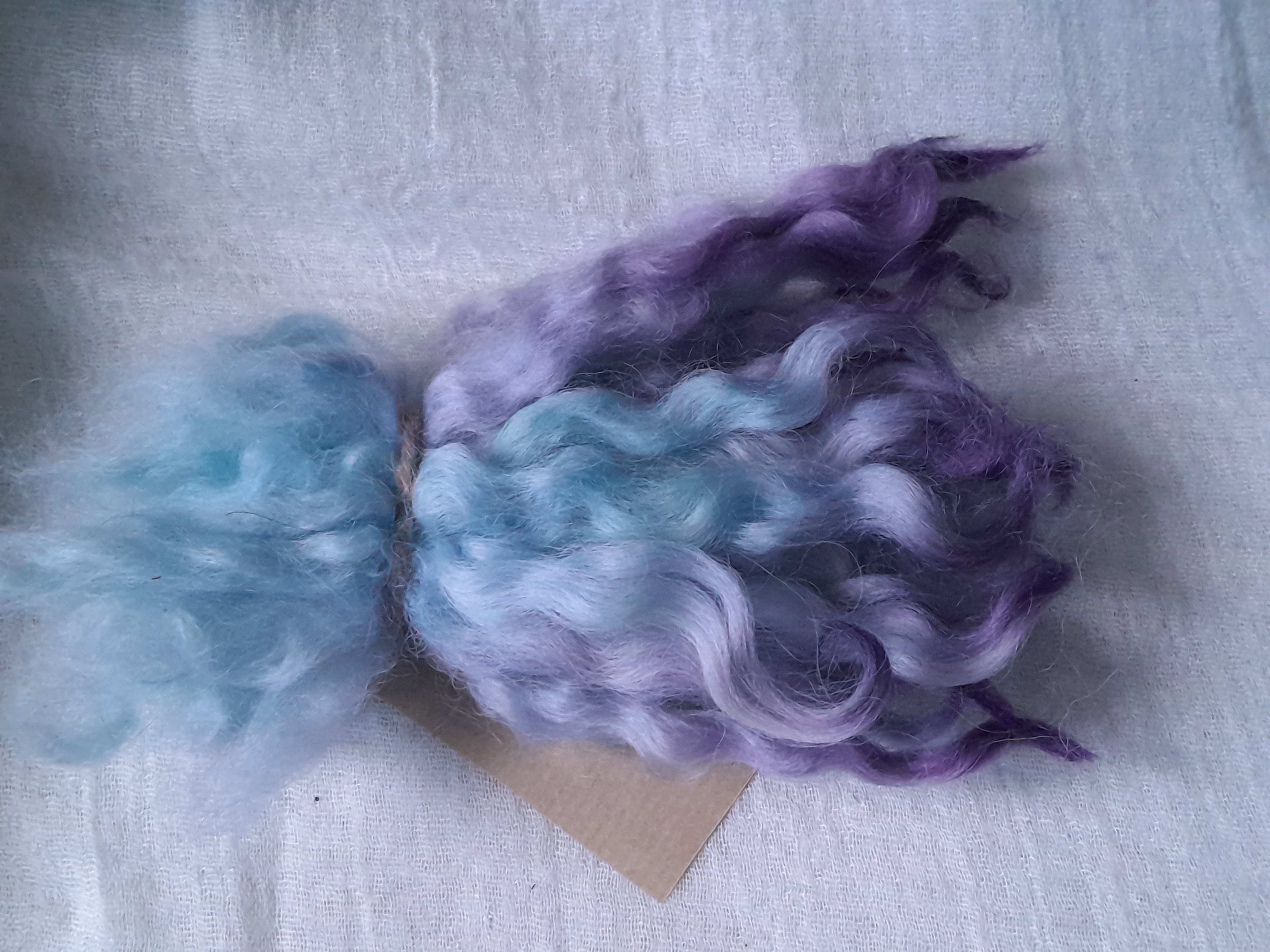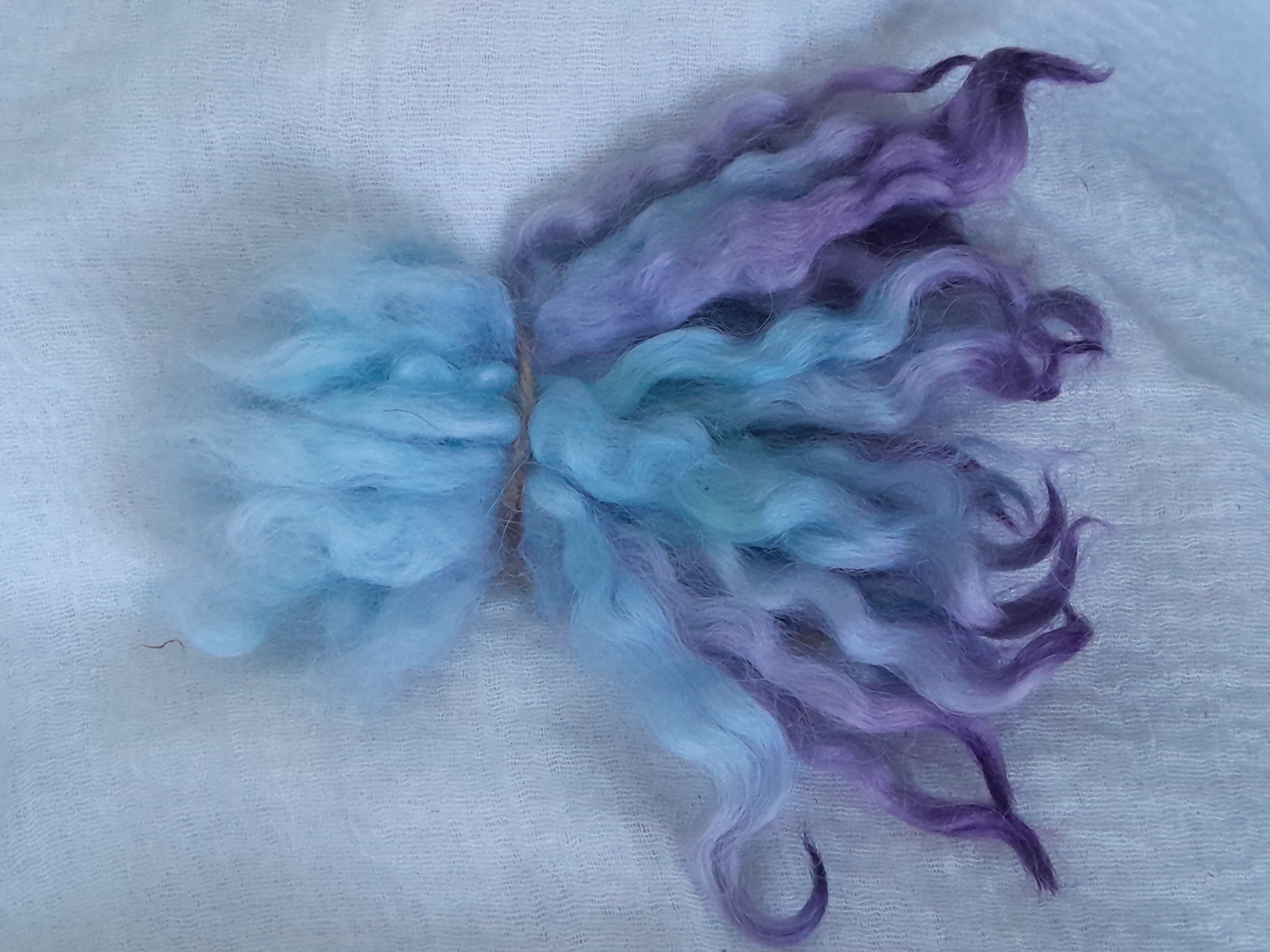 The vibrant blend of blue and purple will add a splash of colour to any project, whether you're creating unique doll hair, embellishing your felting creations, or adding texture to your textile art. The natural curl of these wool locks gives your projects a whimsical and playful look, making them perfect for everything from dolls to decorative pieces.