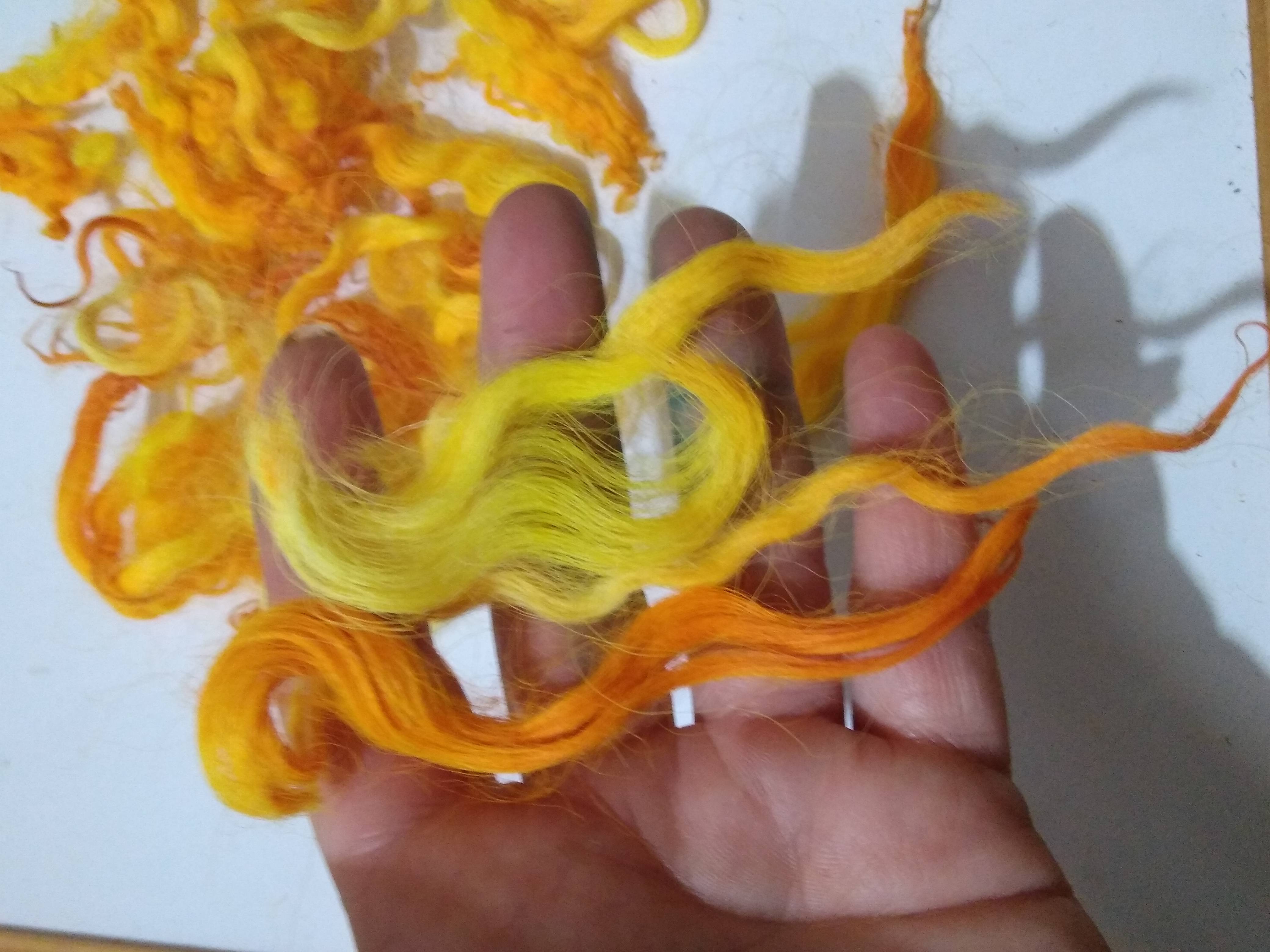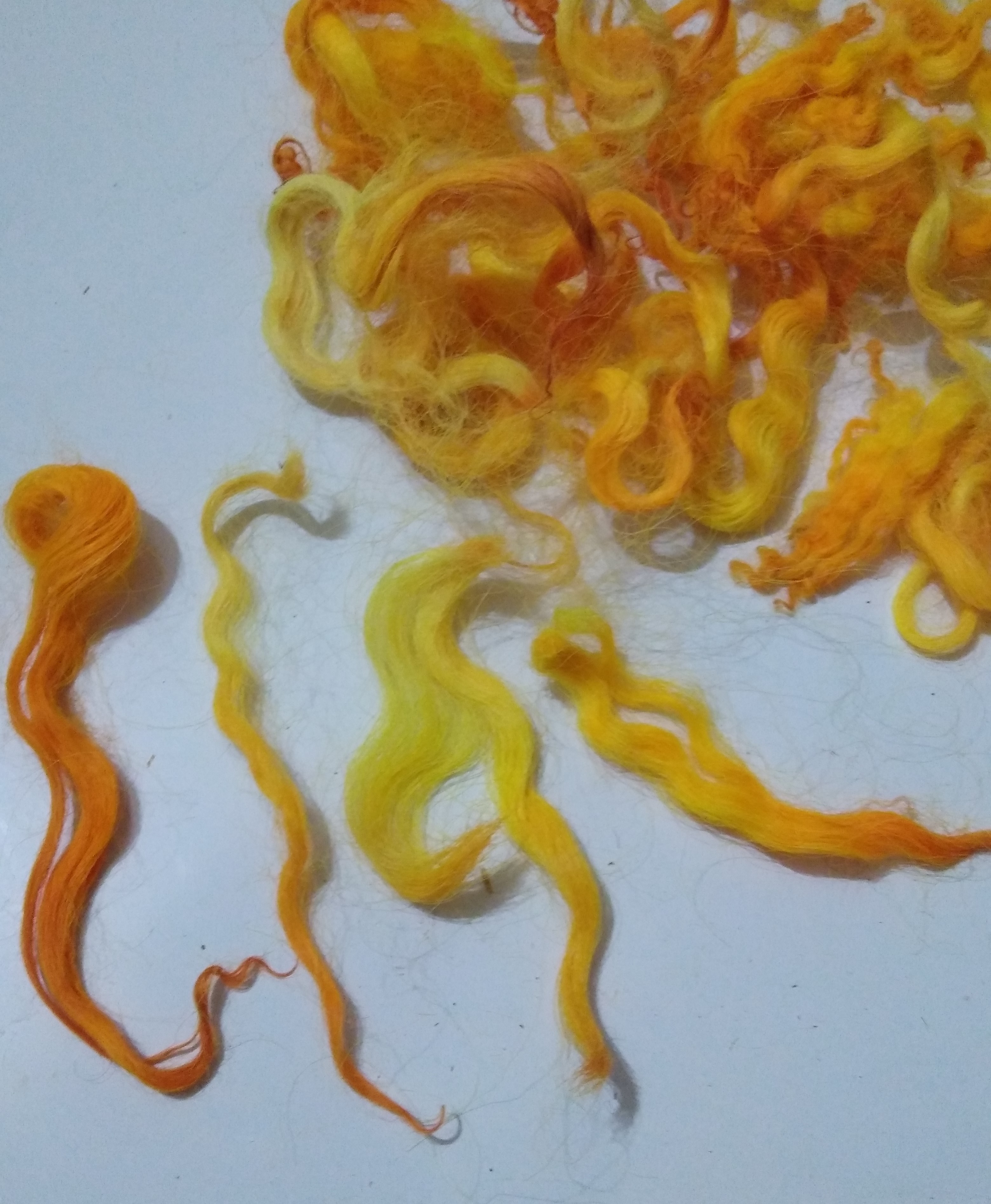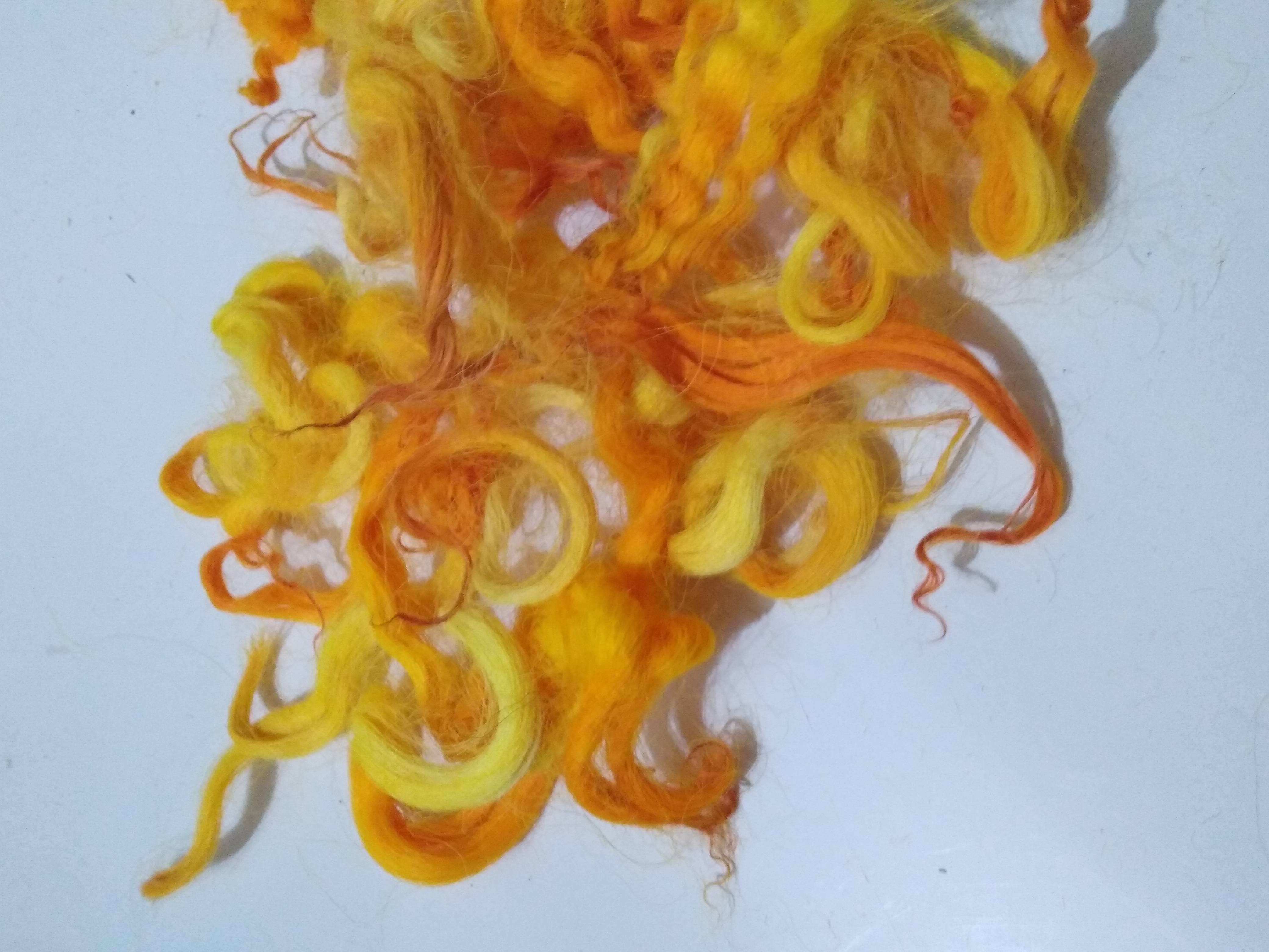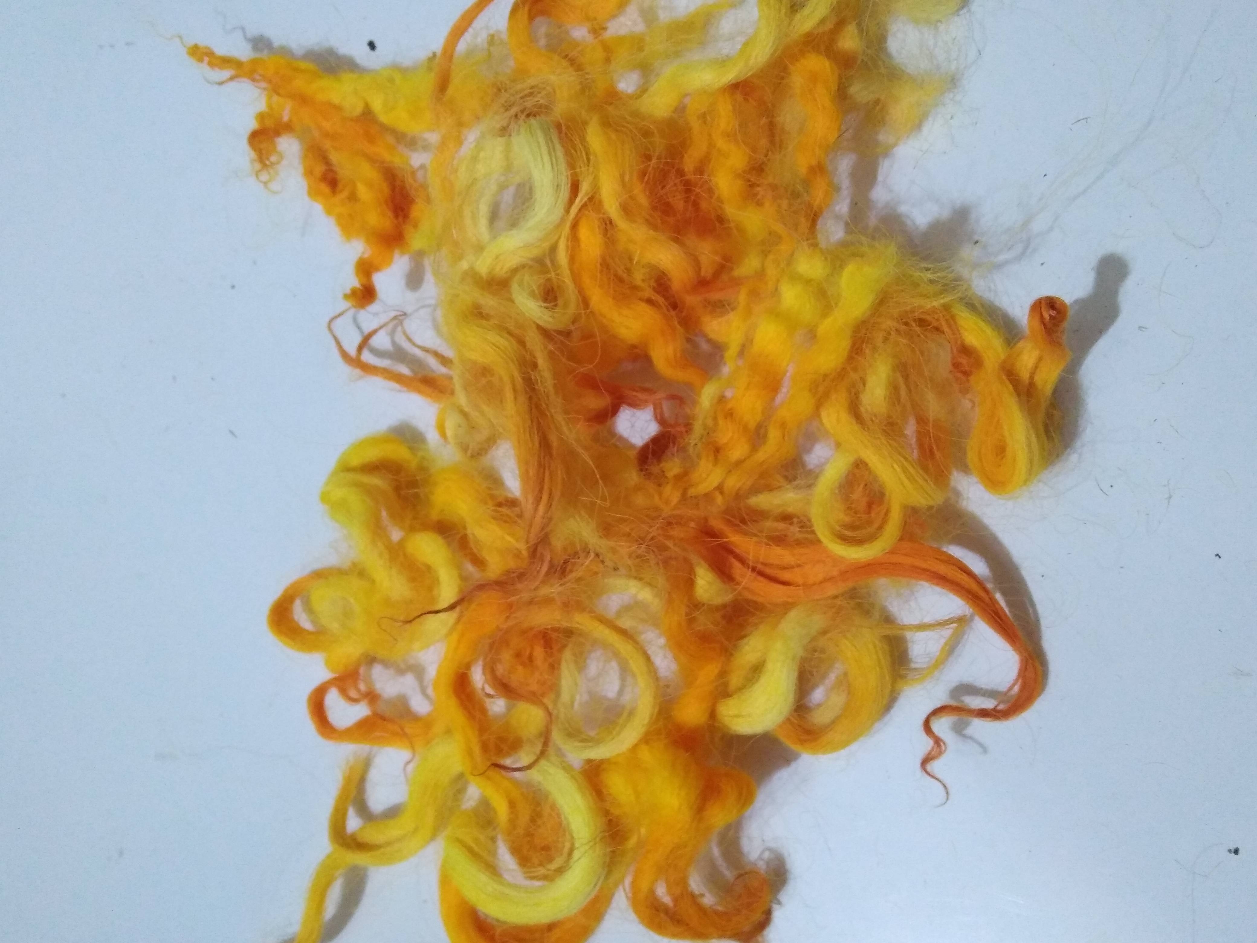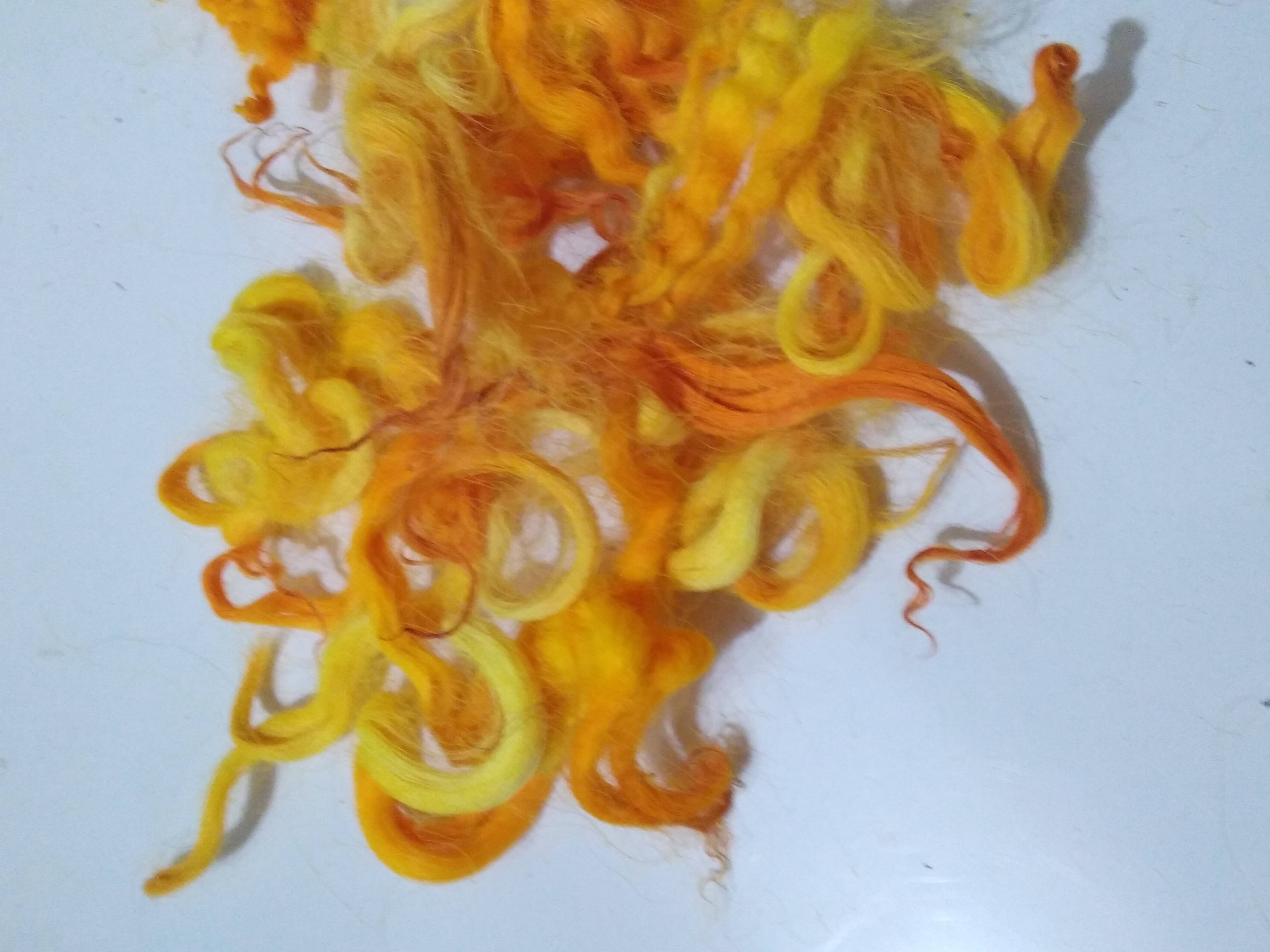 This fibre has been 100% hand processed (very well washed by hand multiple times) and is has been hand dyed in a mixture of bright orange and yellow tones.