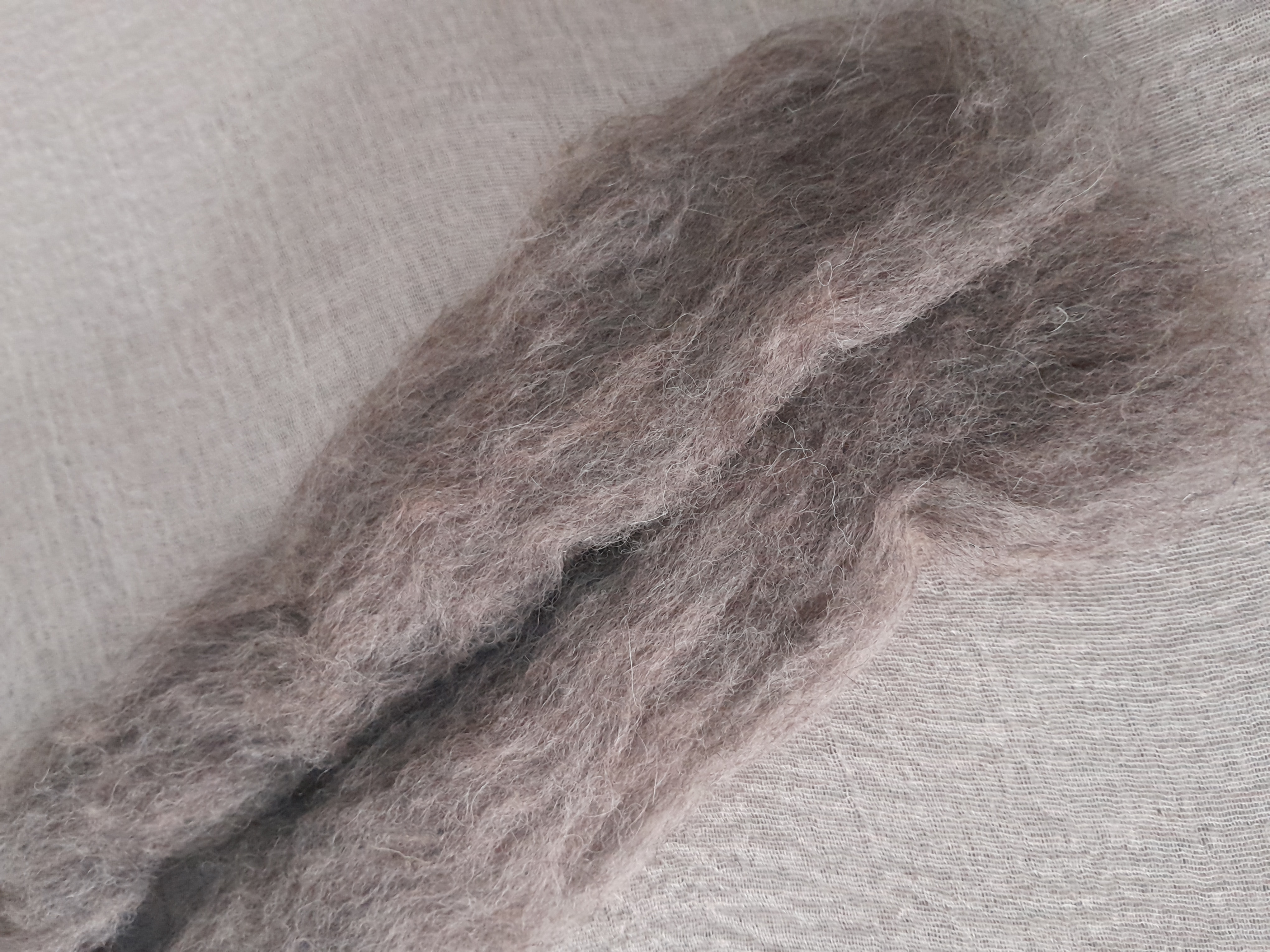 They are mixed natural fibres which have been been scoured (professionally cleaned), and it may have a very small amount of VM which is easily removed. It's made up from a mixture of natural fibres, such as wool, mohair and alpaca which have all been blended to create this gorgeous, lightweight and fluffy sliver.