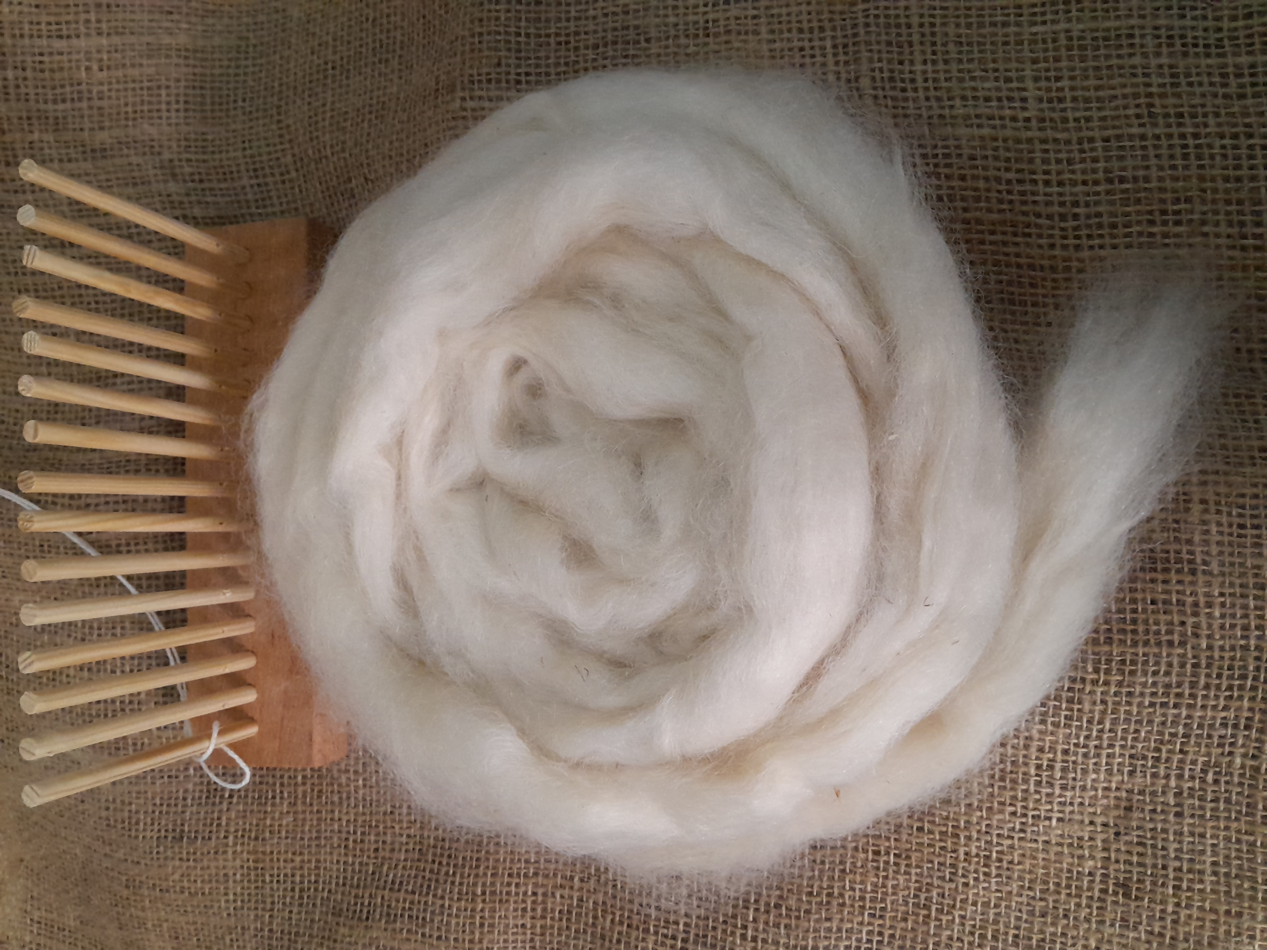 Mohair is a super soft and shiny natural fibre, with a long staple length. As such, our carded roving behaves almost like combed tops - the fibres do not naturally mesh together like carded wool does. As such, it can be used in the place of tops, and is perfect for using as hair on felted dolls, angels or fairies, or used as top coats for a fur like effect on animal makes.