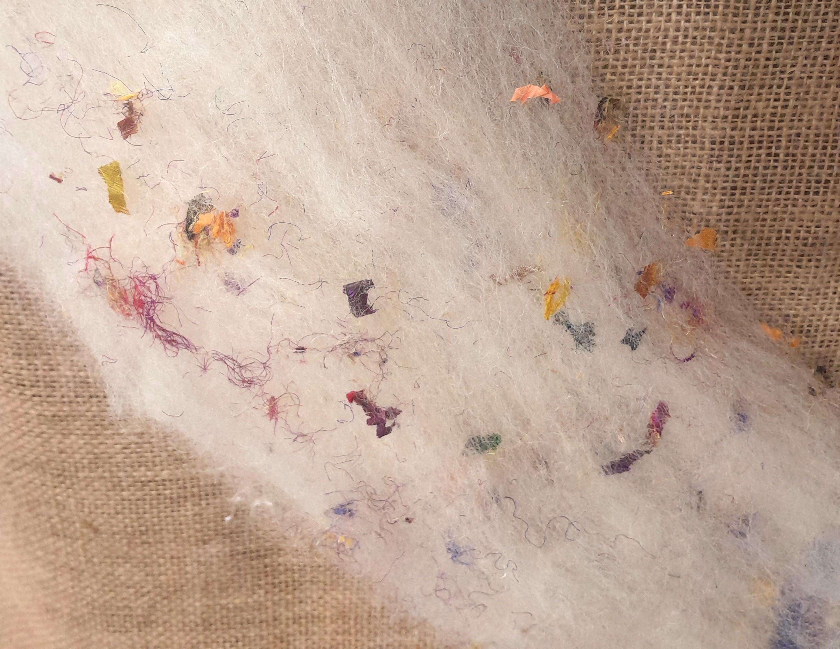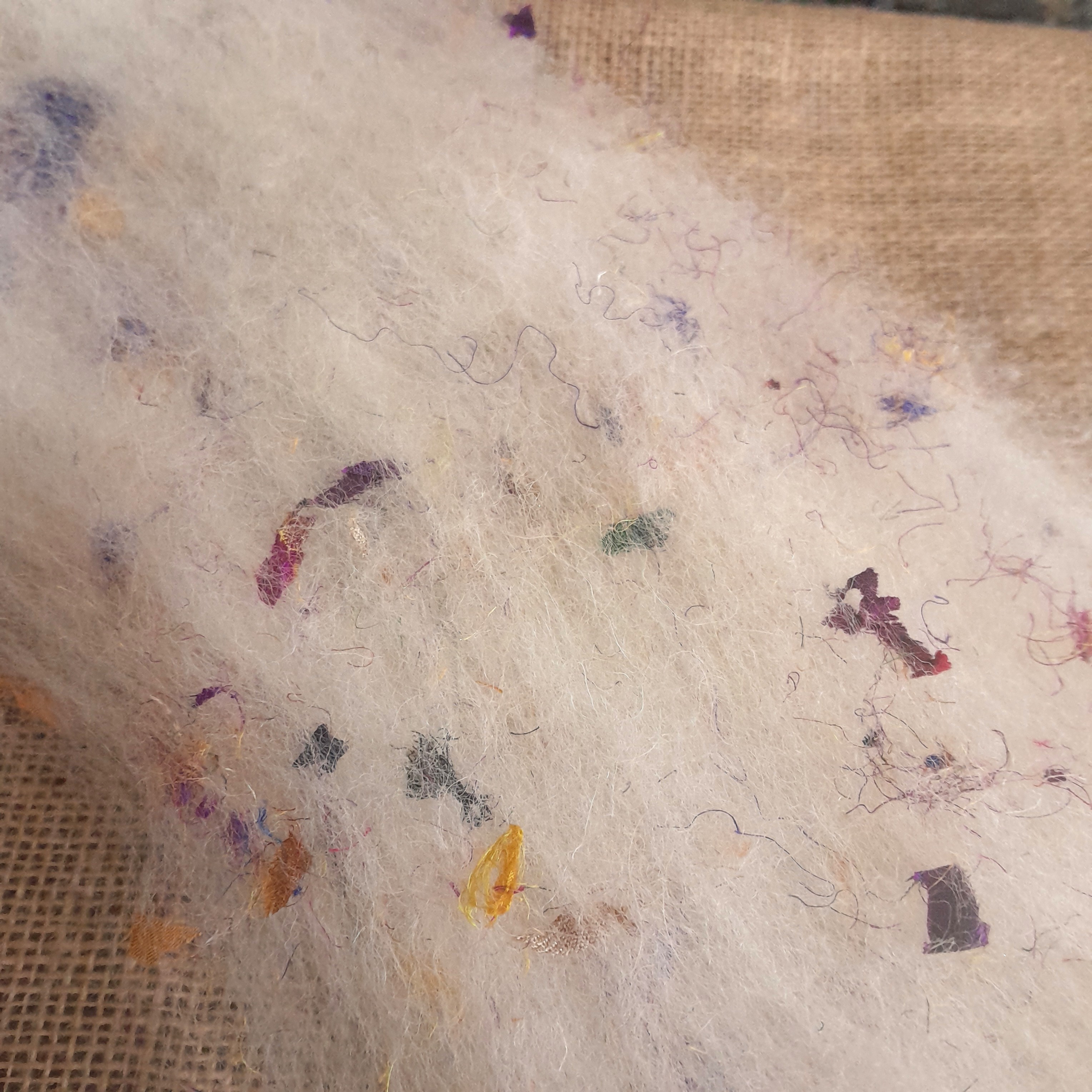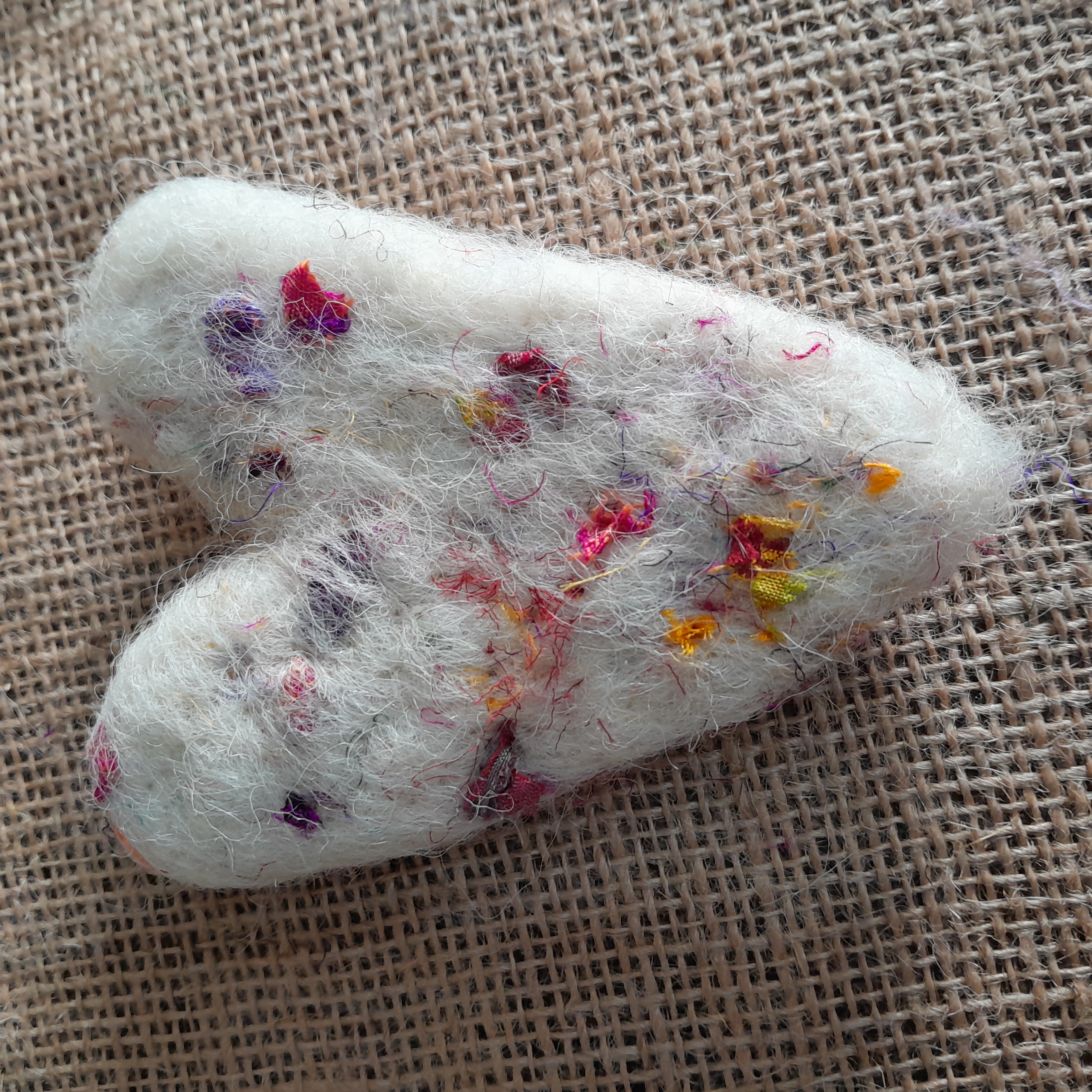 The pieces of the silks included in the batts are trapped between the layers of fibres, but are loose and not fully blended into the batt, so you may find you have a few bits fall out, which you can use directly in your makes. It does take a little more work to needle felt - the pieces of silk are varying sizes, from tiny threads to small squares etc, so the larger pieces do need to be 'poked' into you make with a little more care so you don't snap needles..