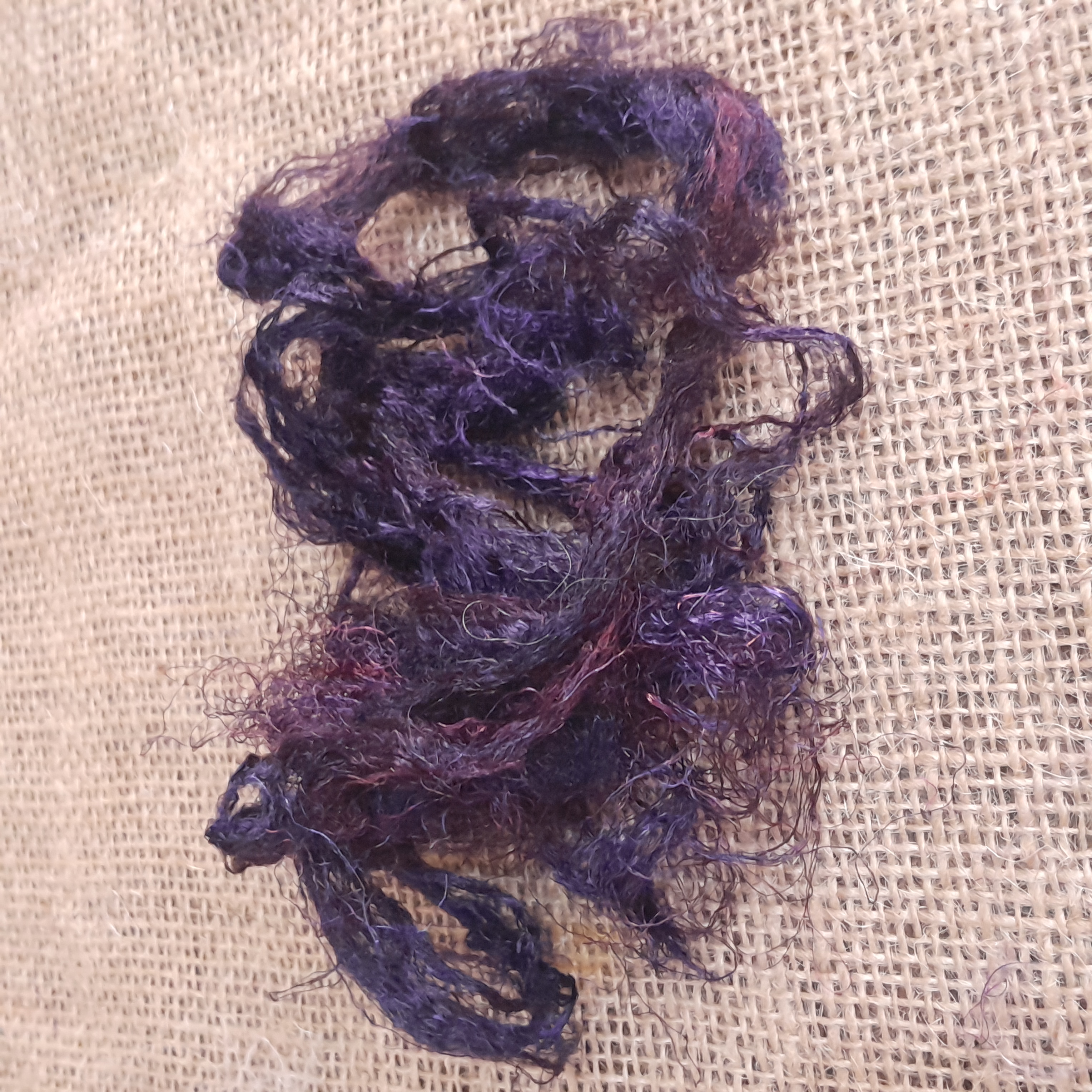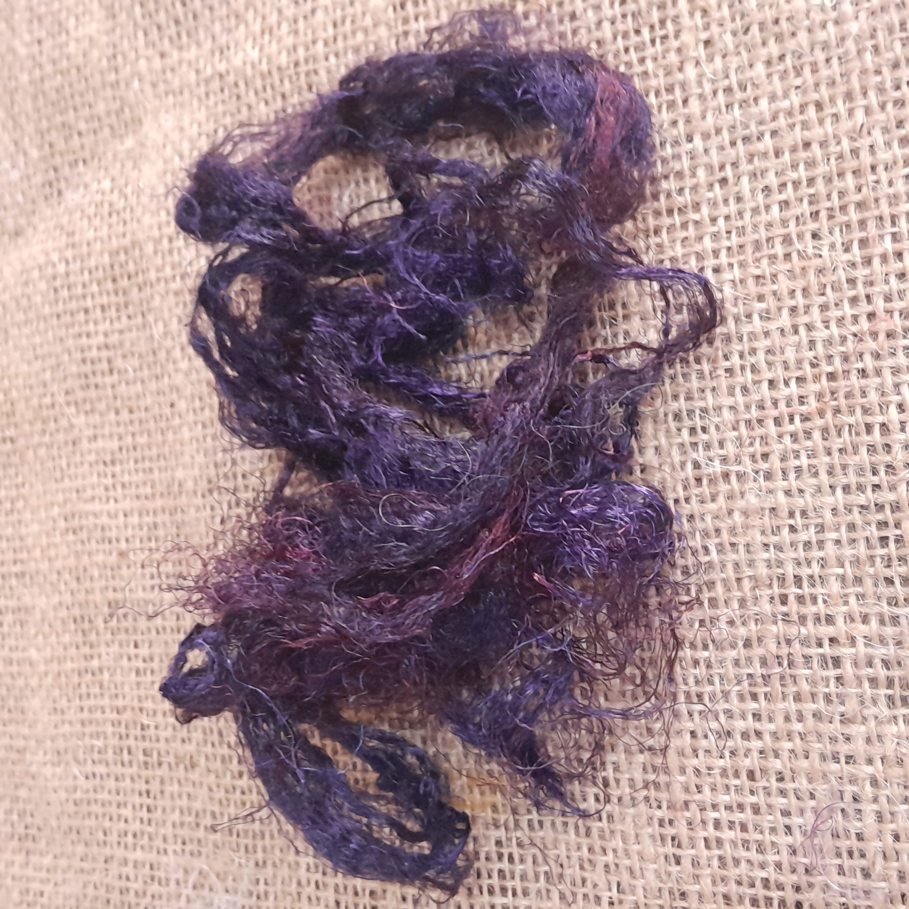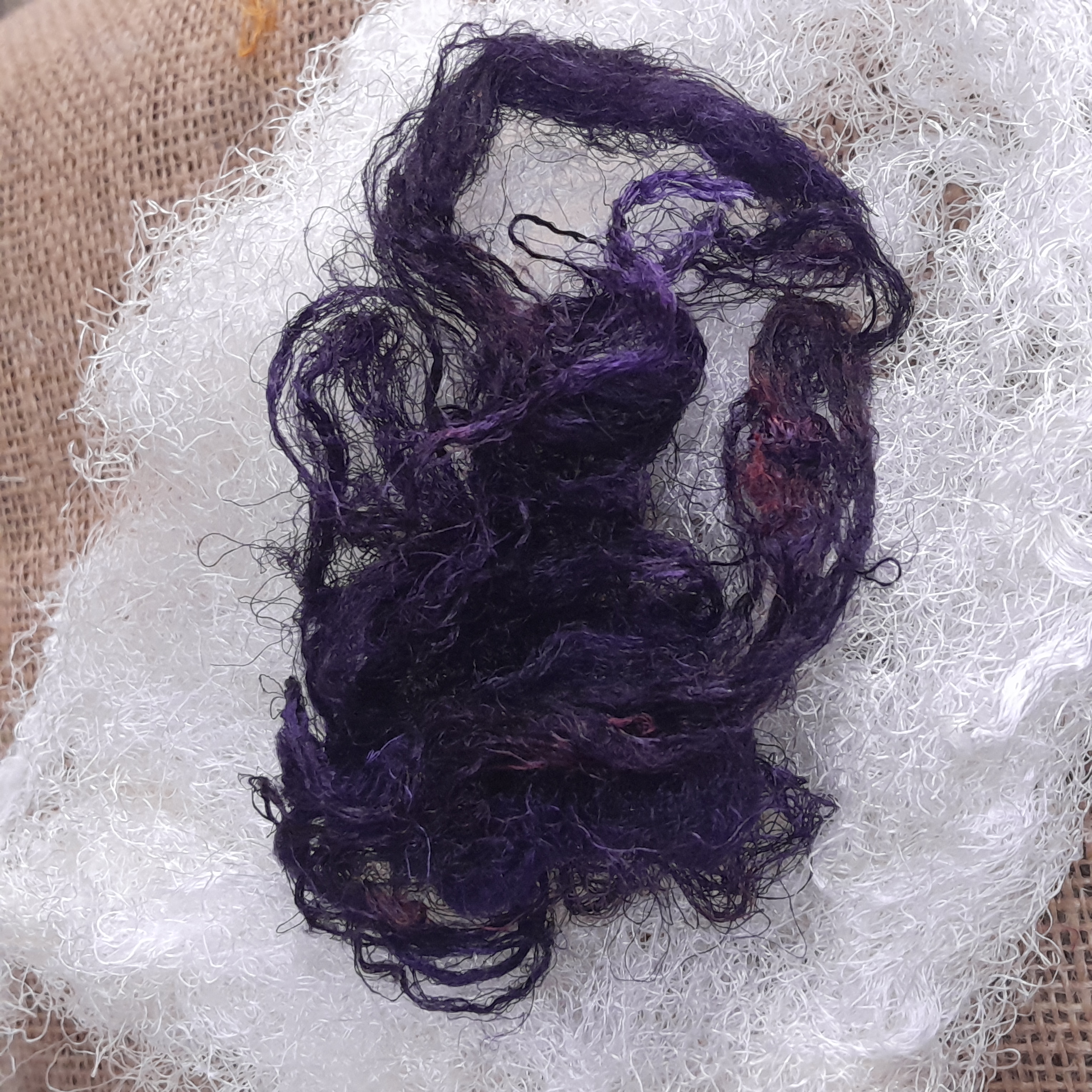 The plum hues in purples, maroon and some pink aspects too is achieved through a careful hand-dyeing process, ensuring that each batch is one-of-a-kind. Whether you're spinning, weaving, or creating stunning mixed media art, this silk throwster waste will elevate your work to new heights. Its soft texture and luxurious feel make it a joy to work with, and it blends seamlessly with other fibre types, allowing for endless creative possibilities.