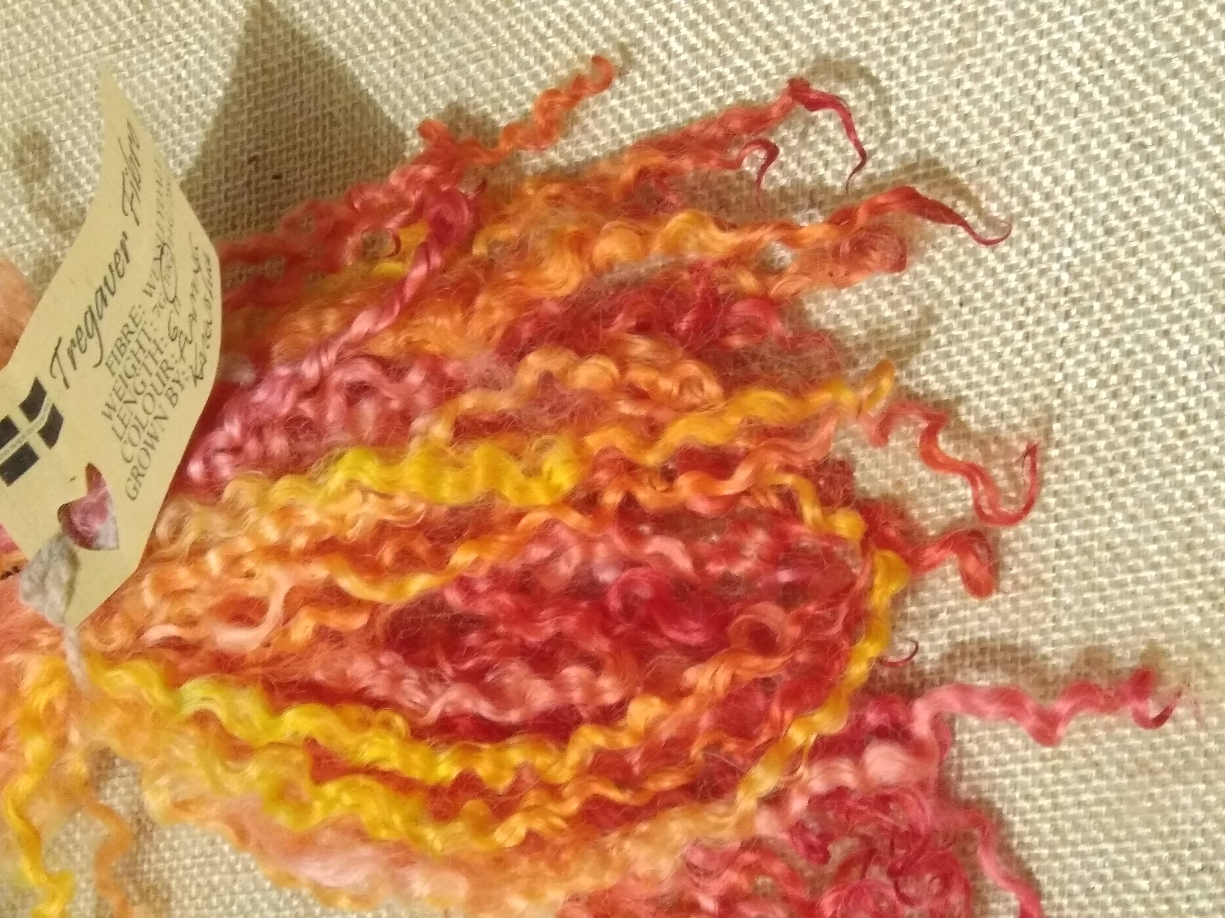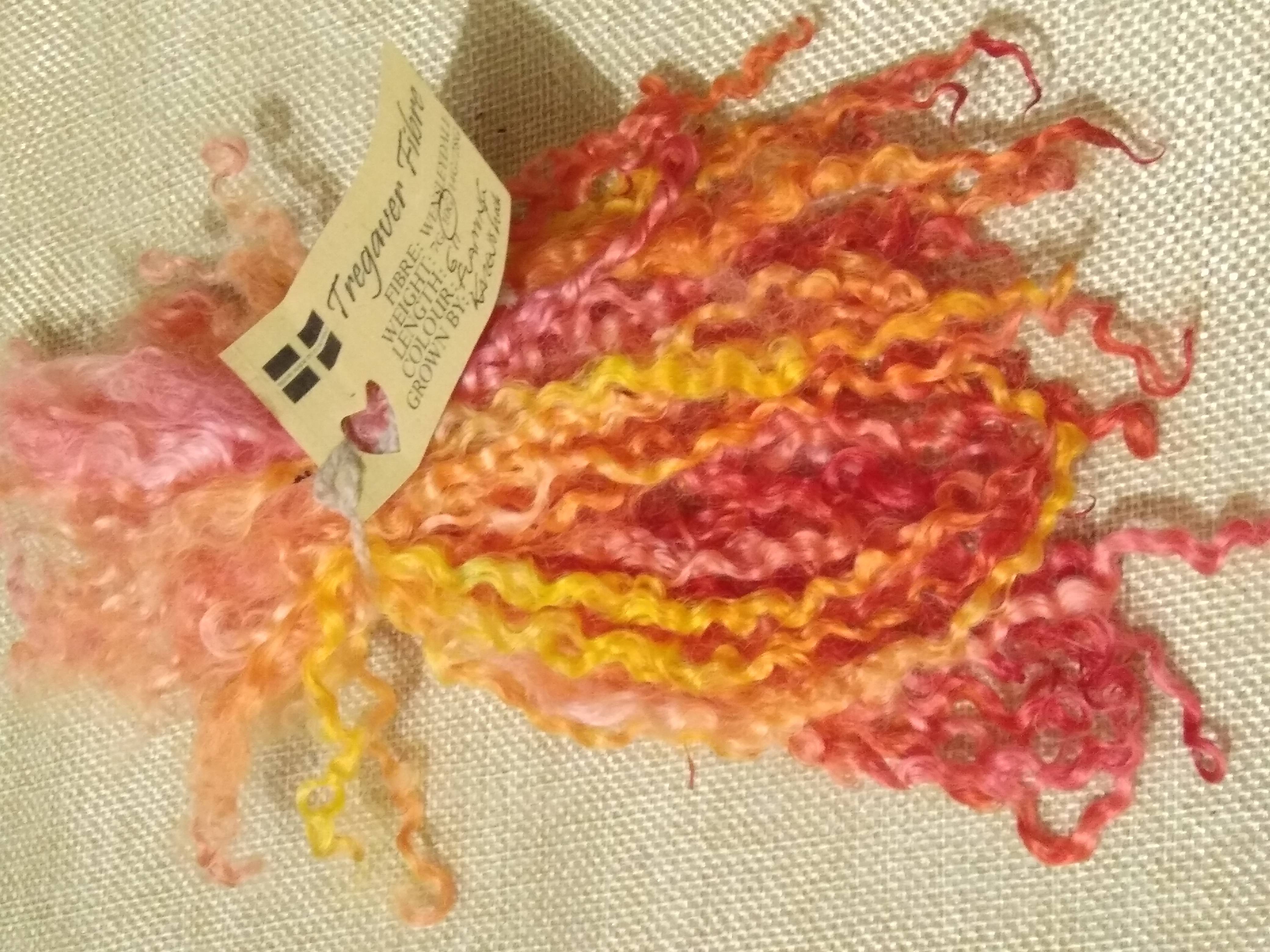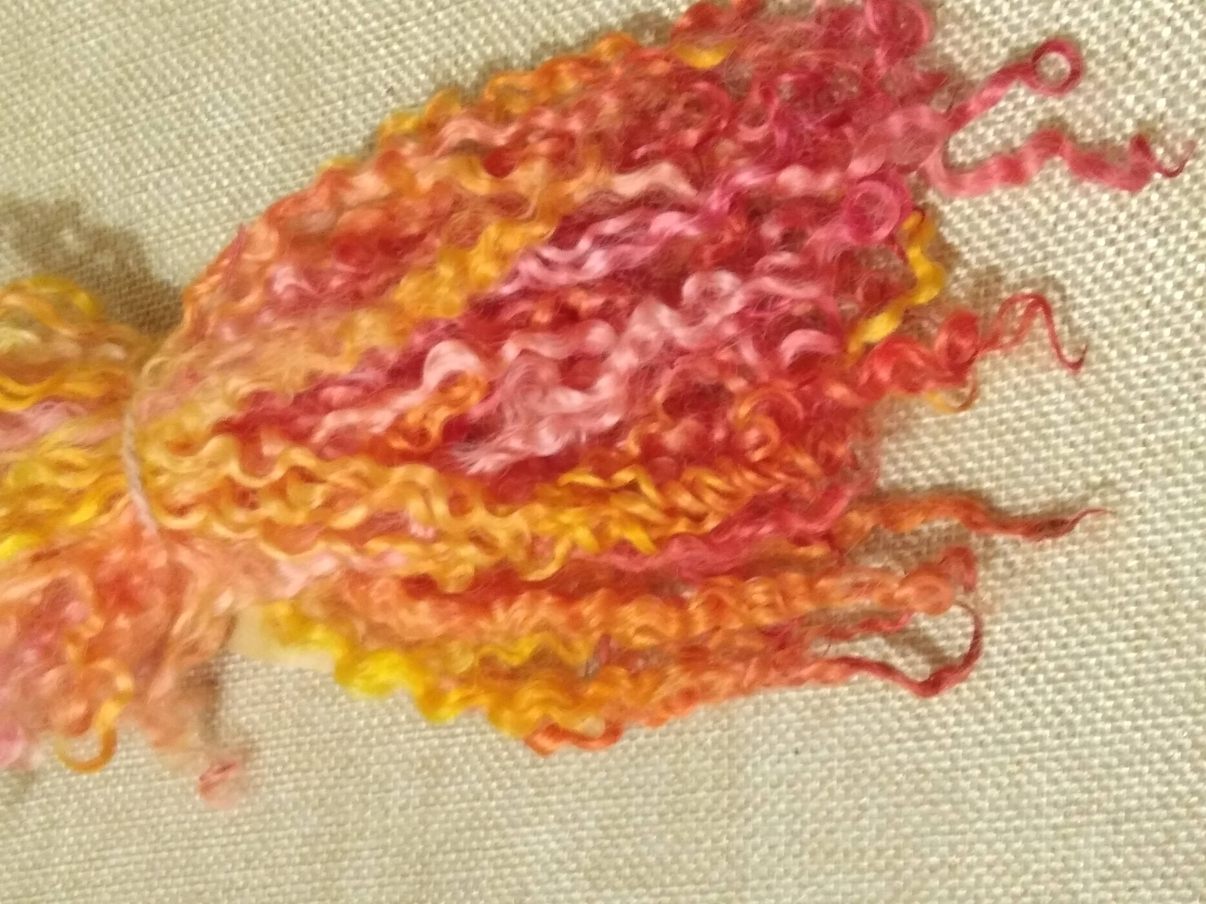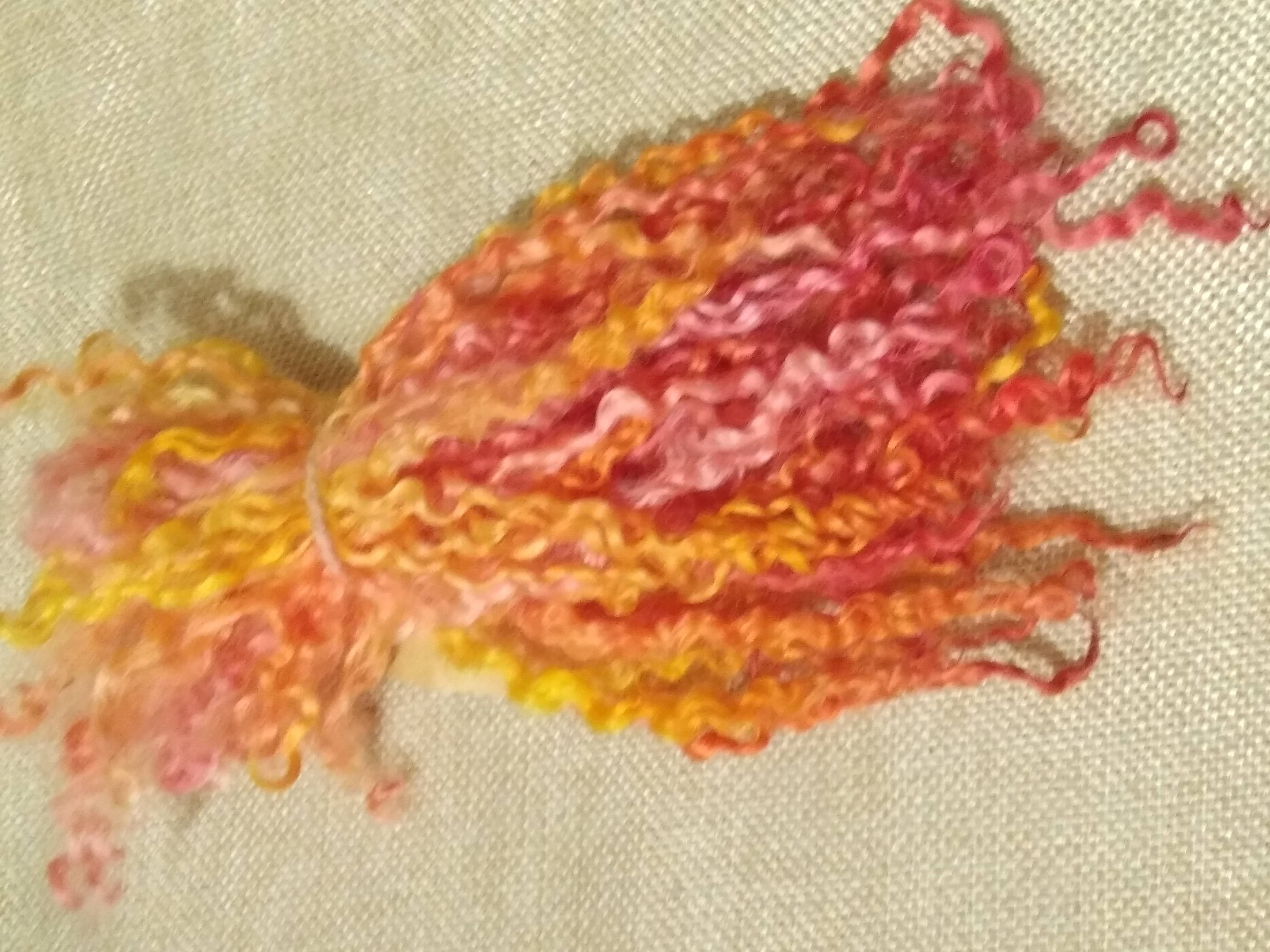 Flaming orange yellow and pink wensleydale hand dyed curly wool locks