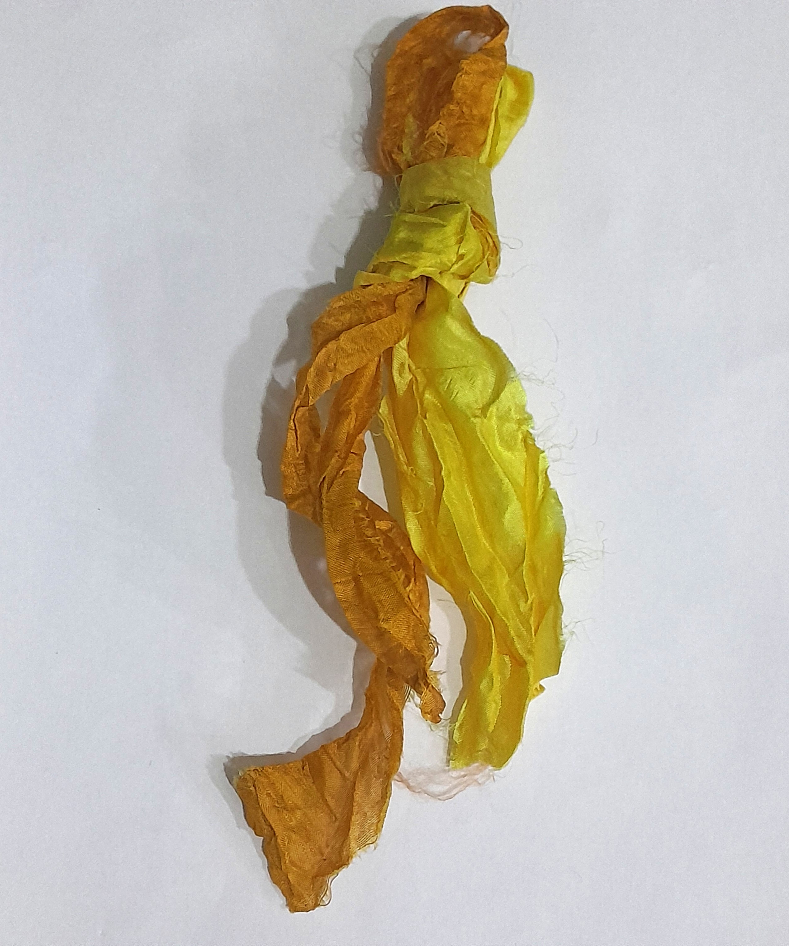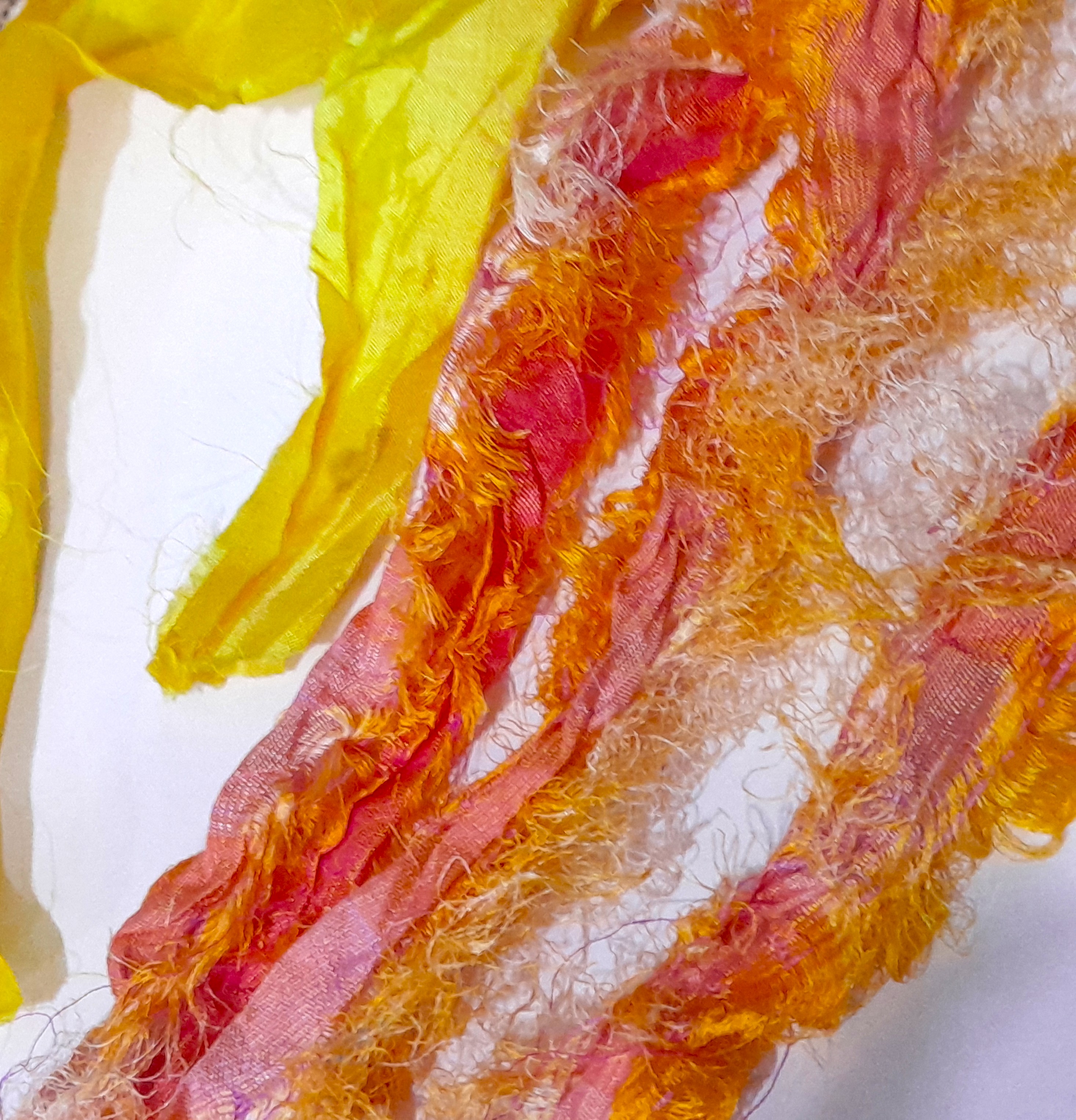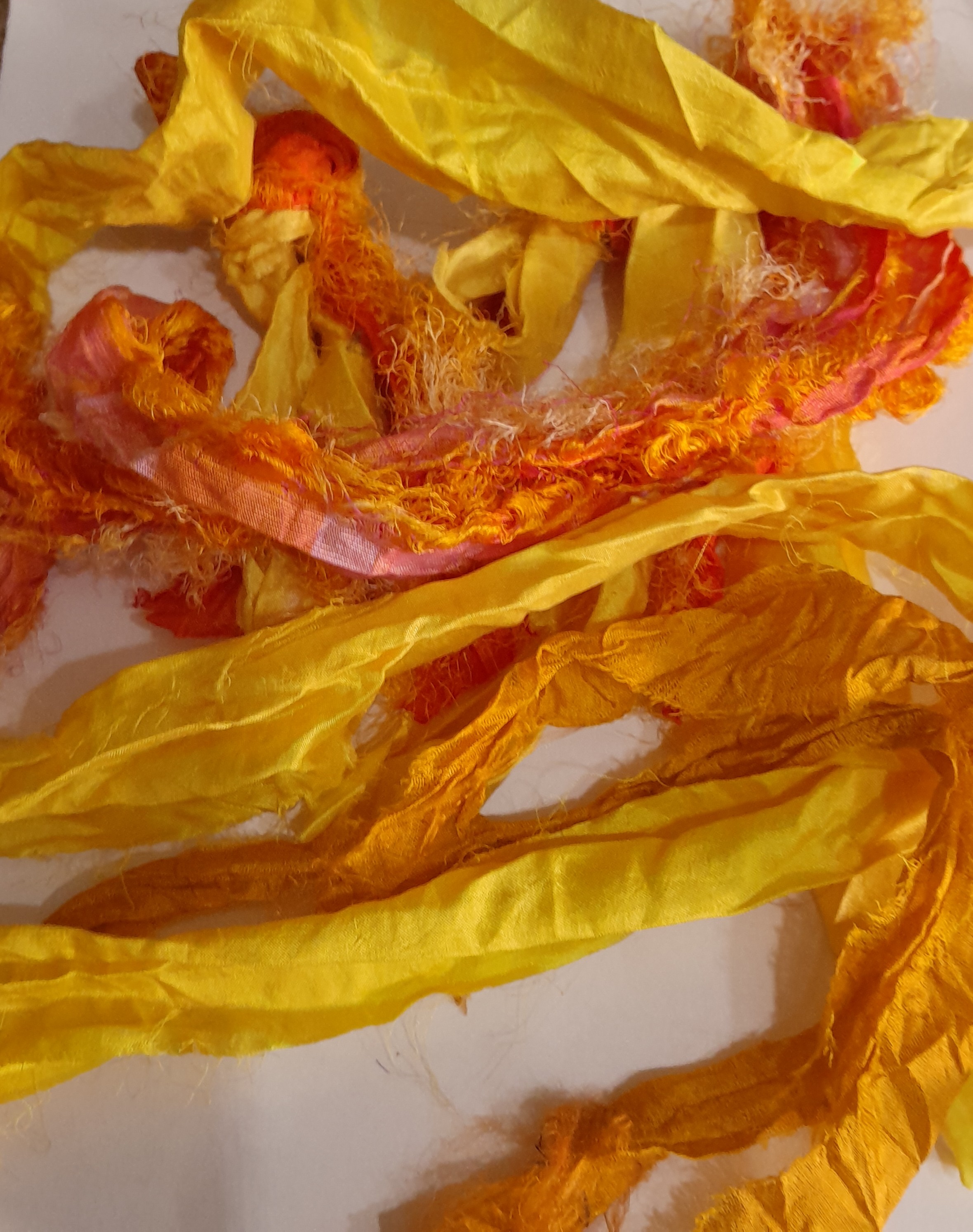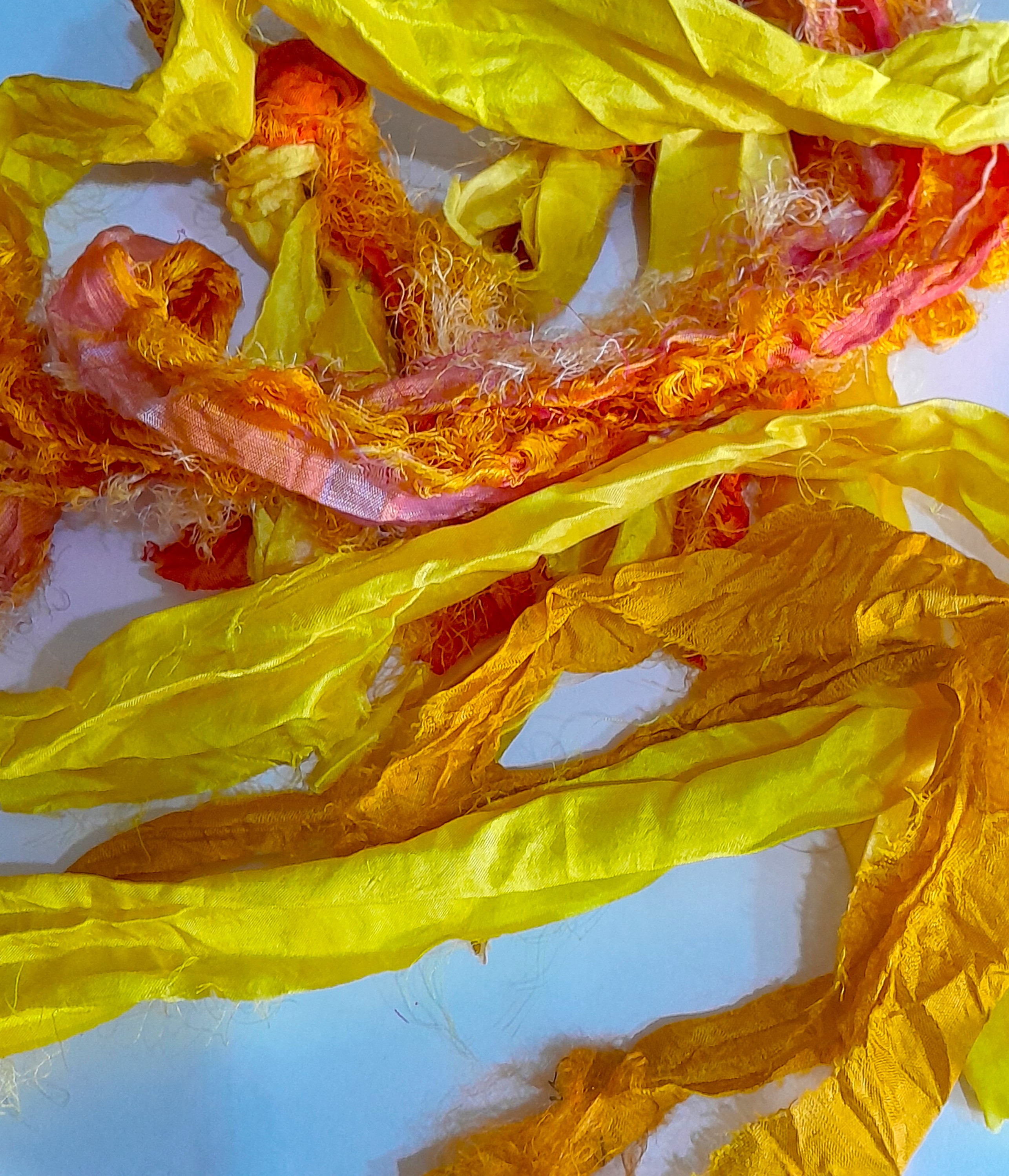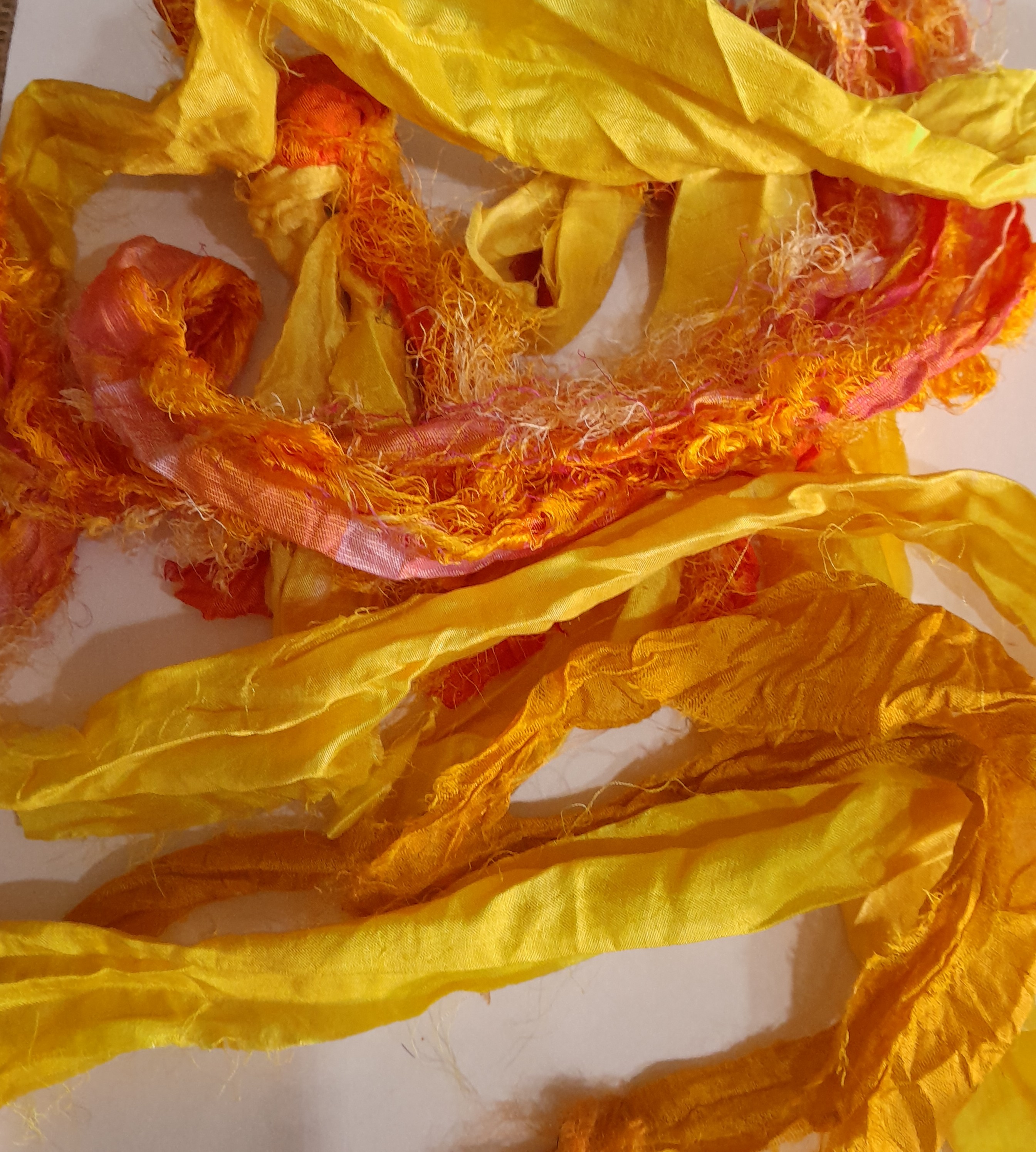 I'm pleased to be able to offer a new product to our shop - recycled sari silk ribbon remnants, pieces which add up to around 1m in length.