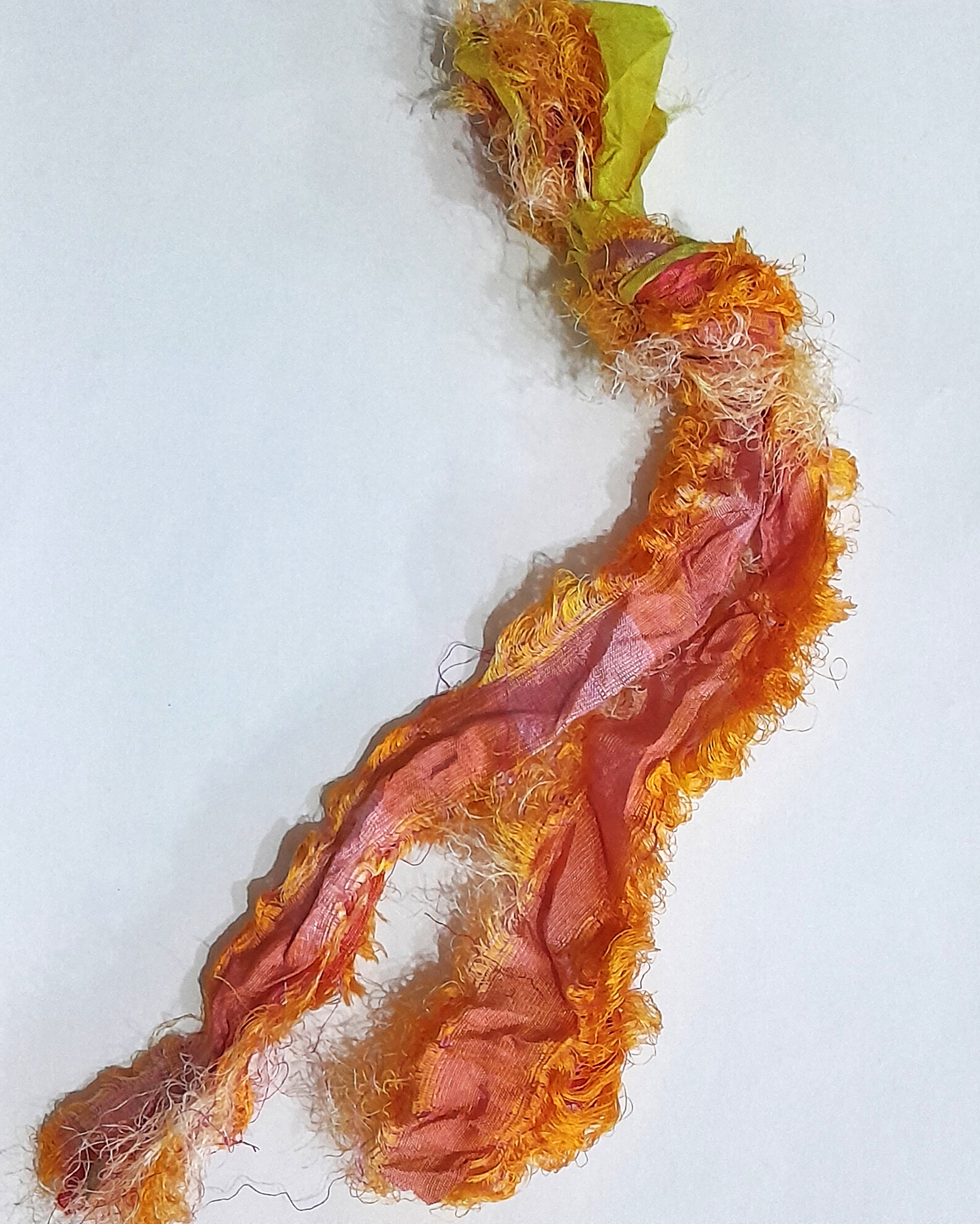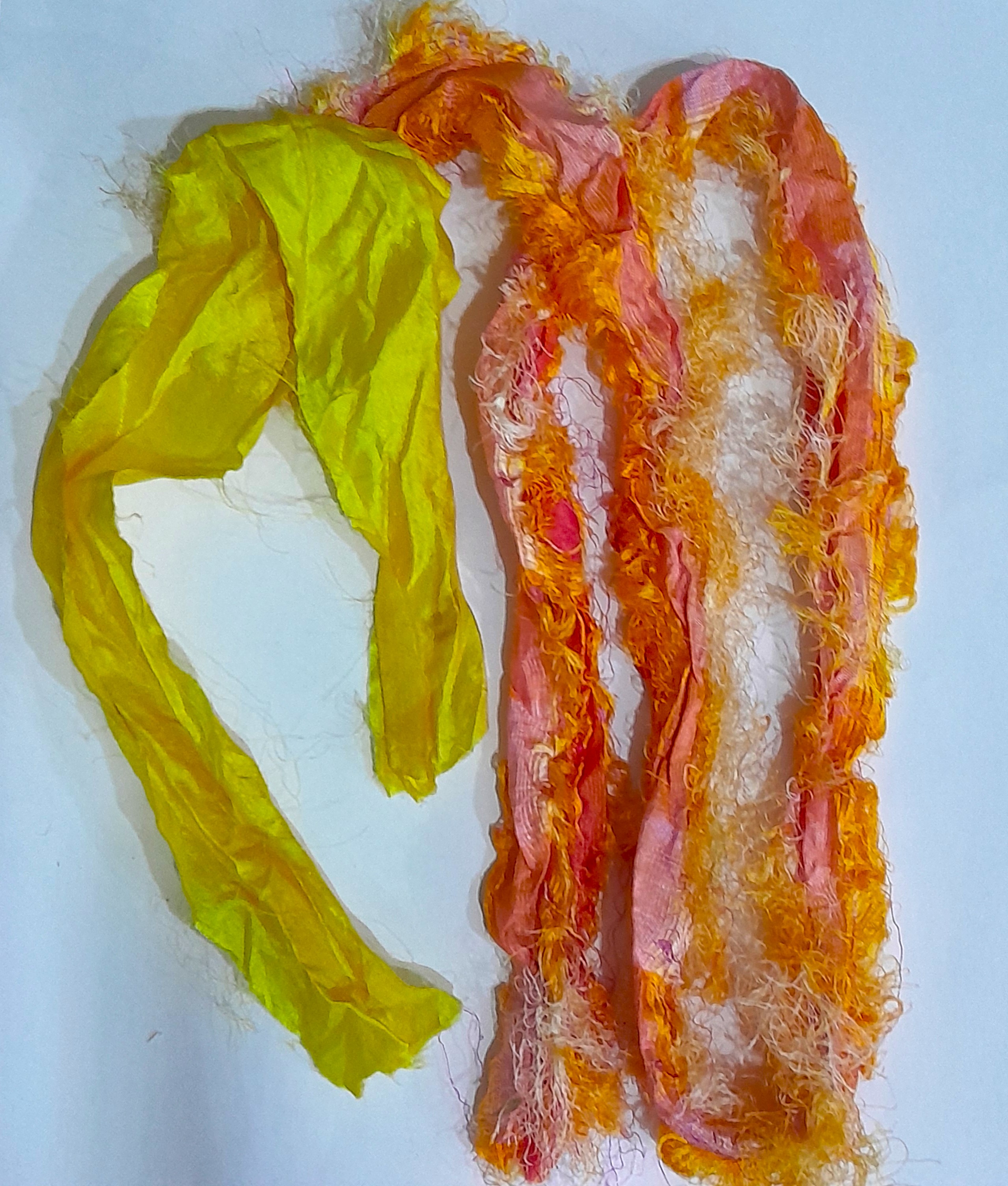 This product is our Flaming mix remnants sari silk ribbon. Adding up to around a meter in length, the pieces have with a width of around 3-4 cm. As this is a recycled product, some variations in the width may occur. Some have clean edges, other are frayed to give a real mix of textures and tones.