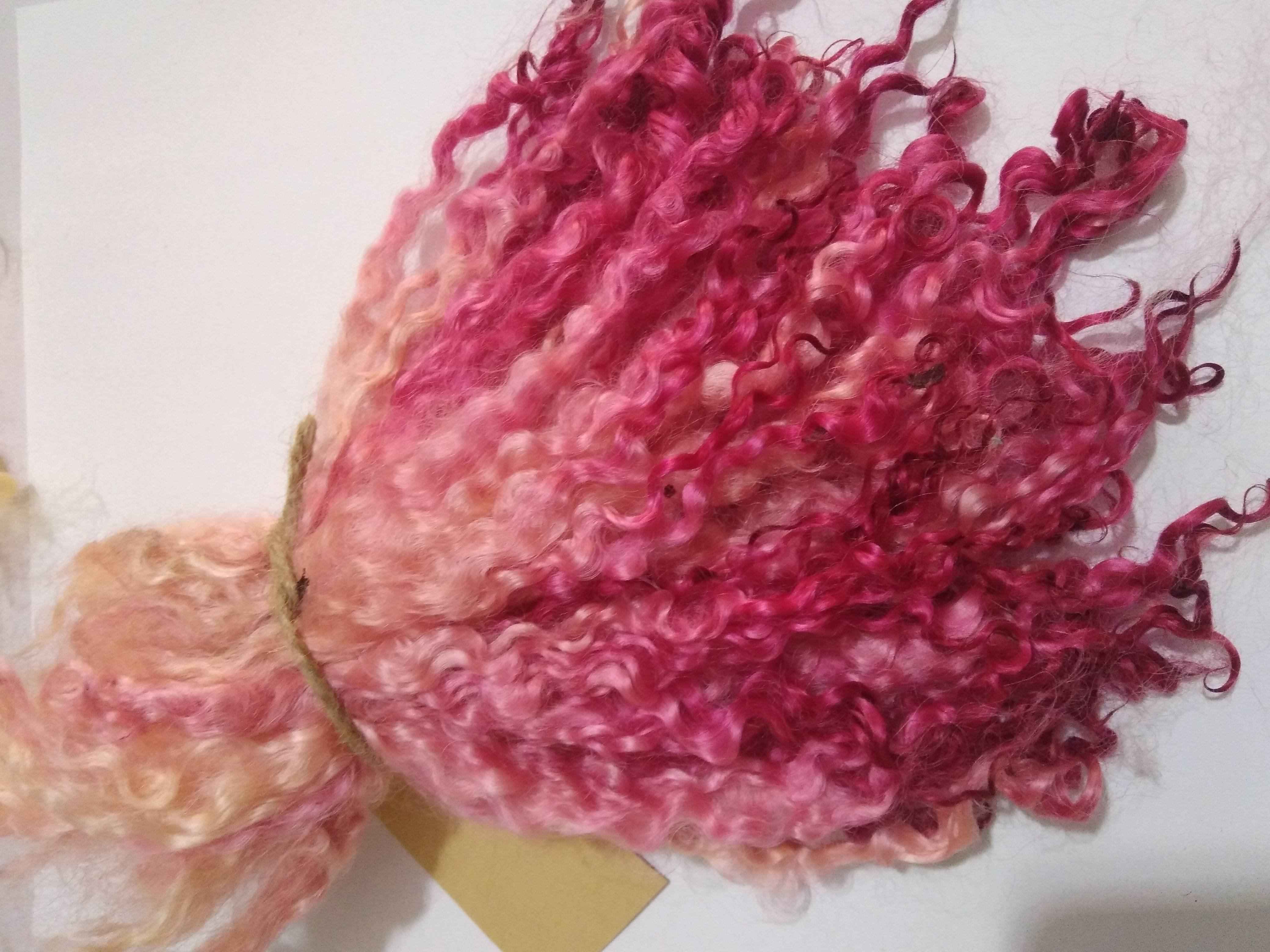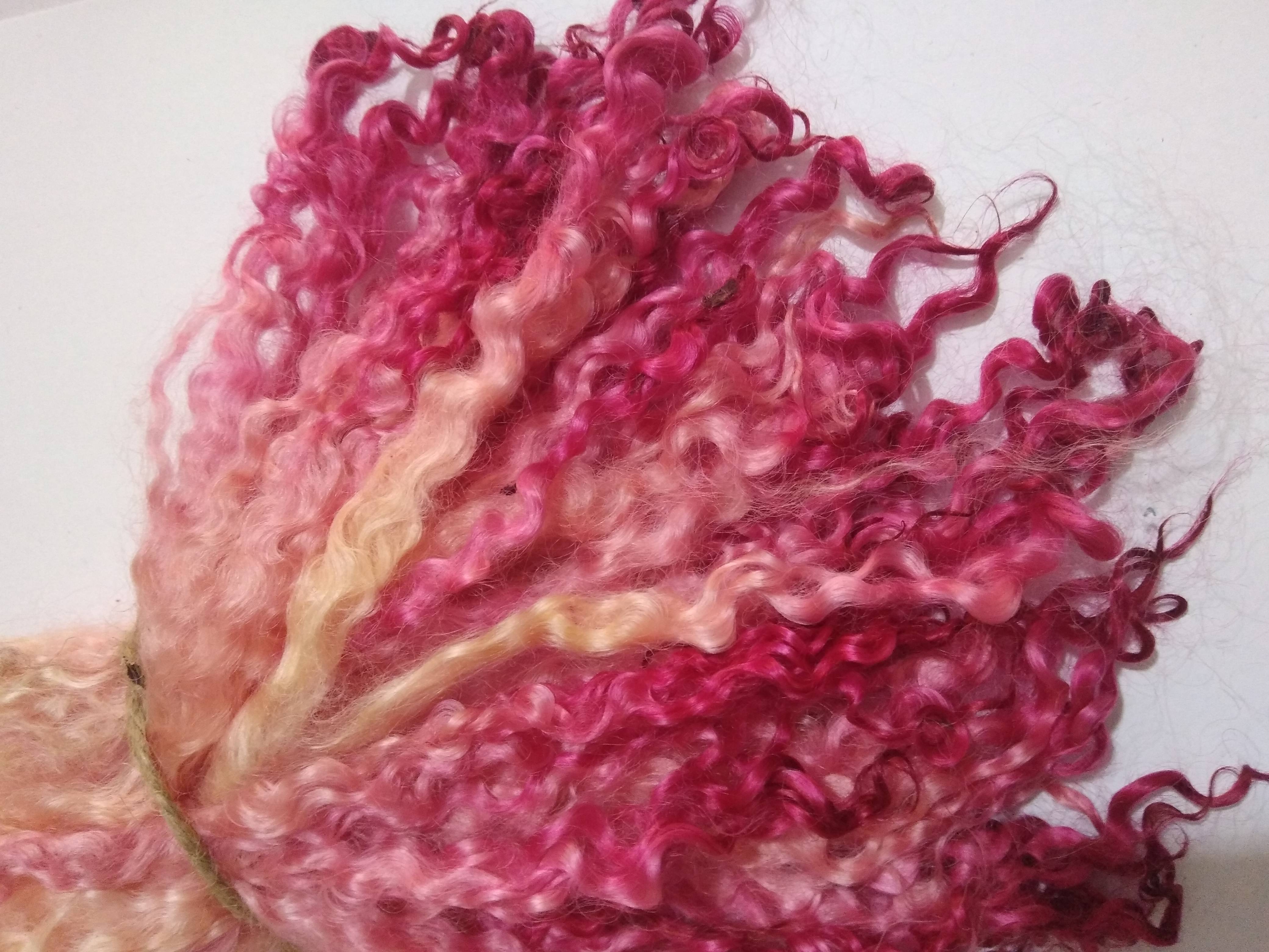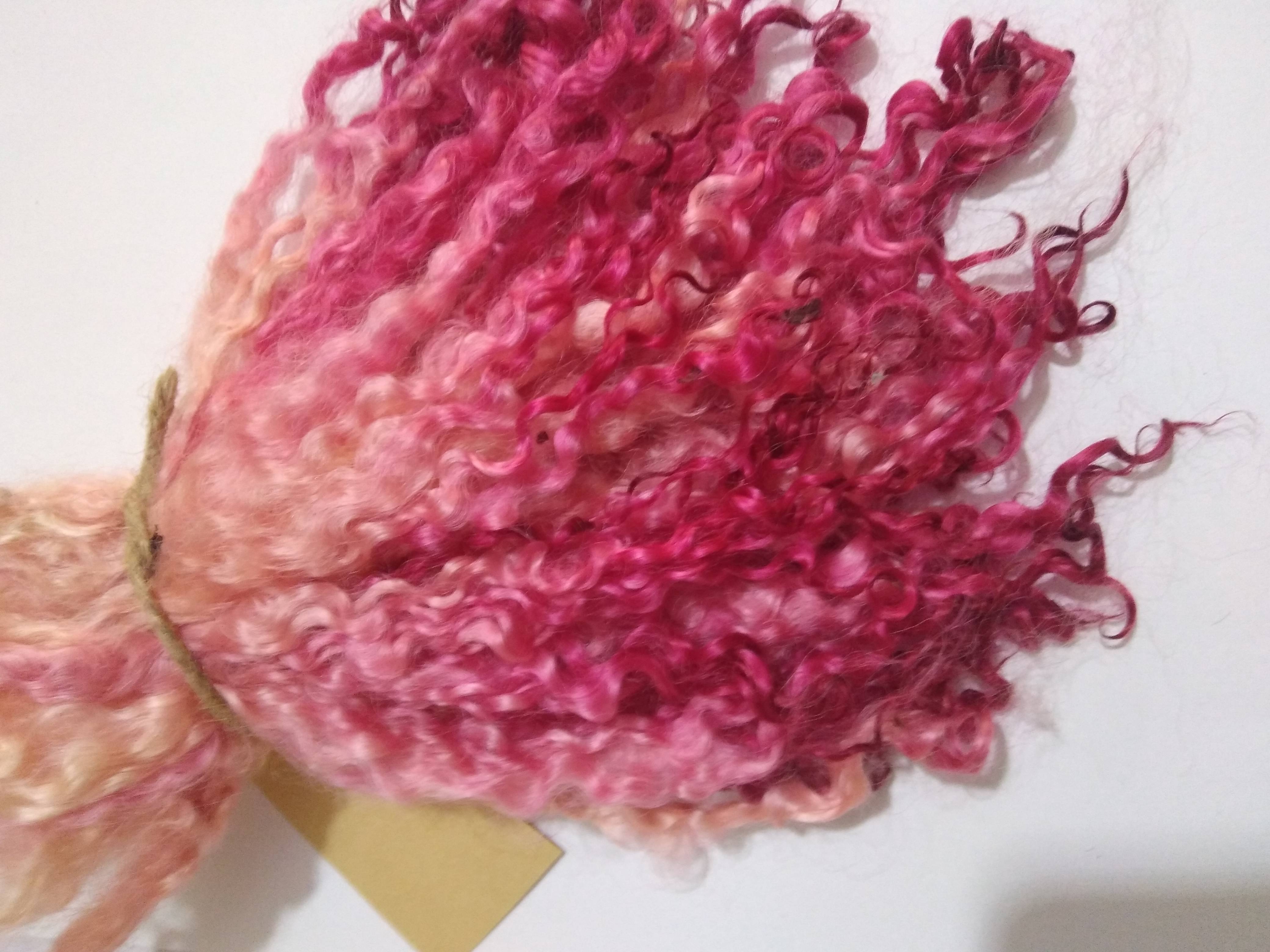 These have been 100% hand processed and hand dyed in a Rhubarb and custard theme, with varied pinks and some pinky yellow aspects.