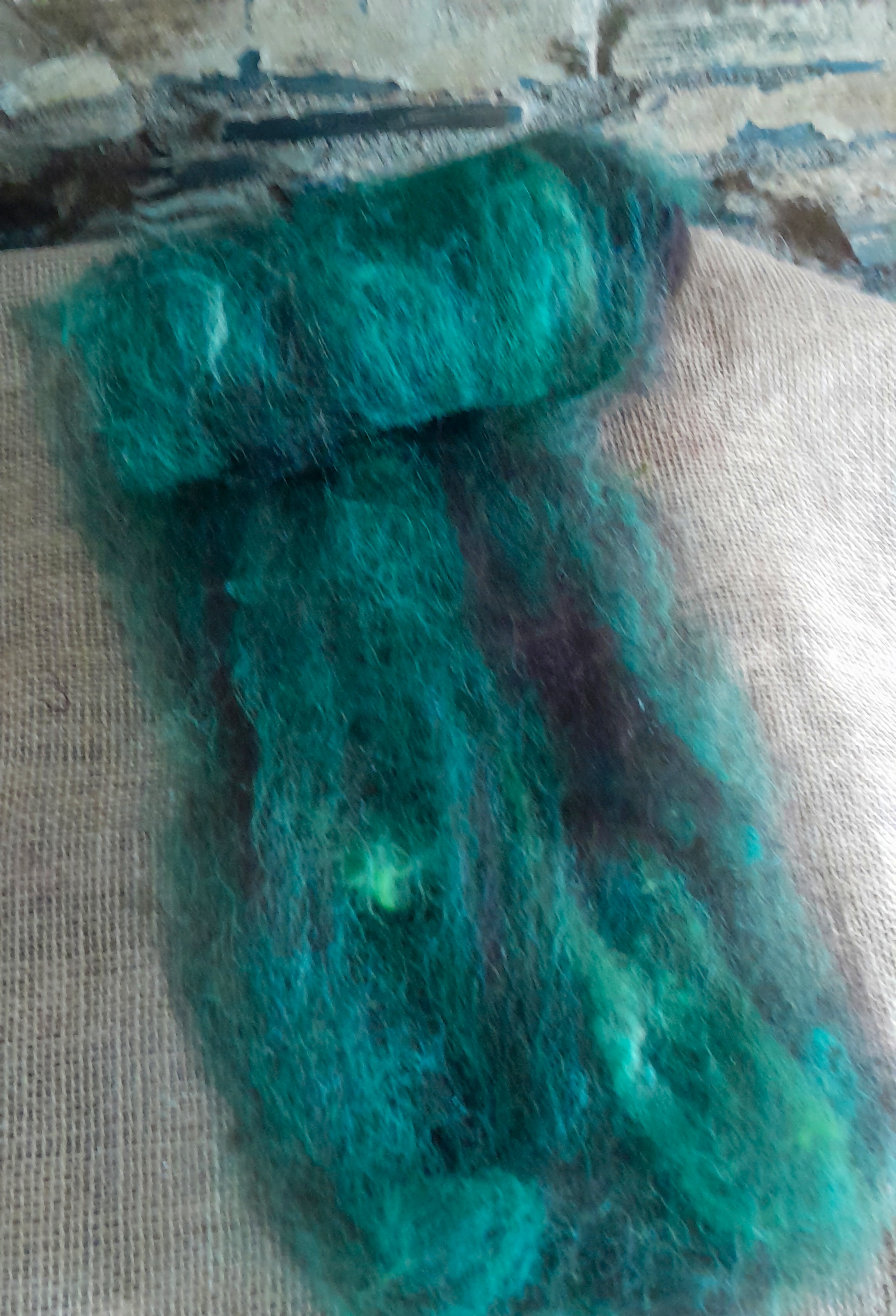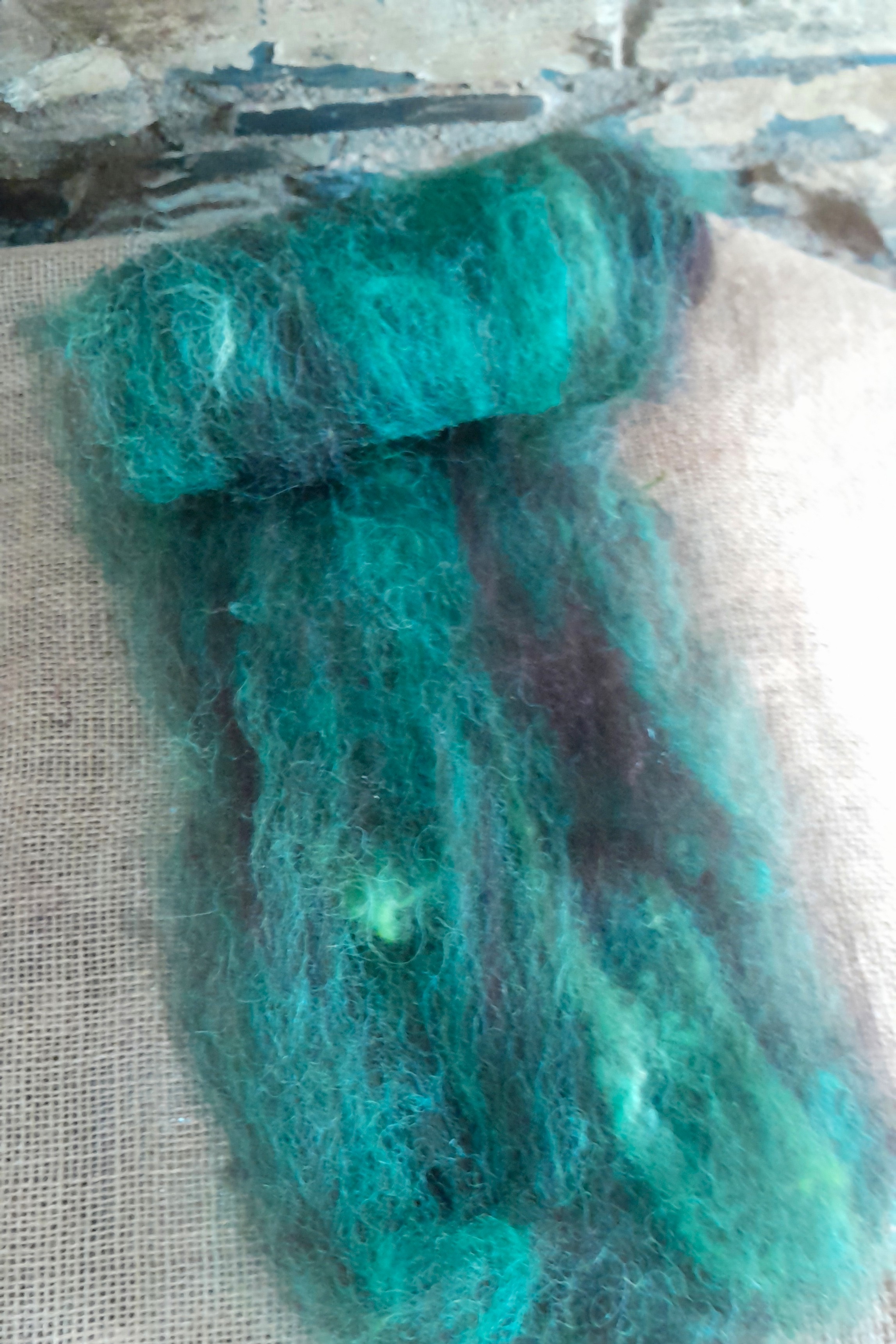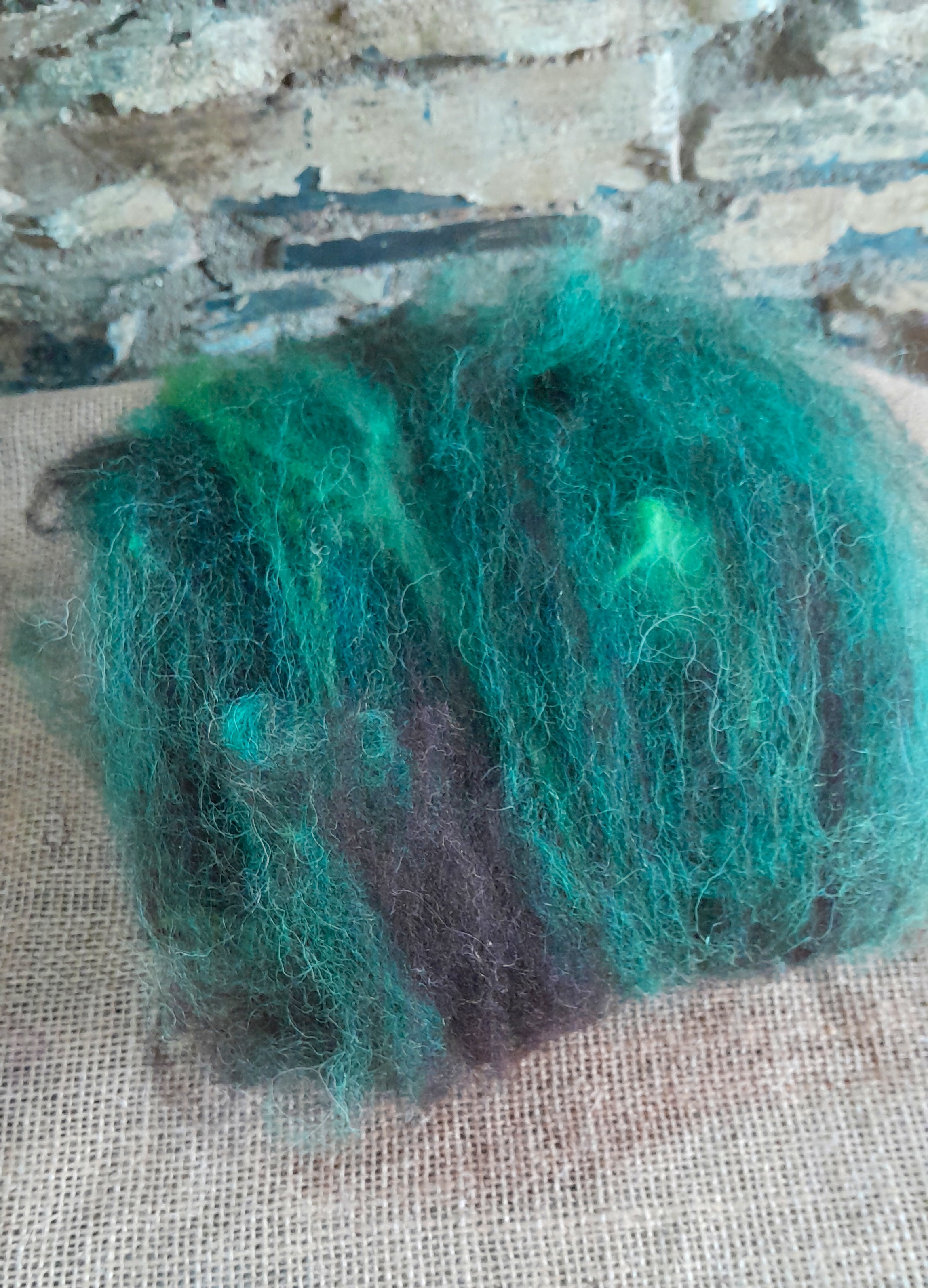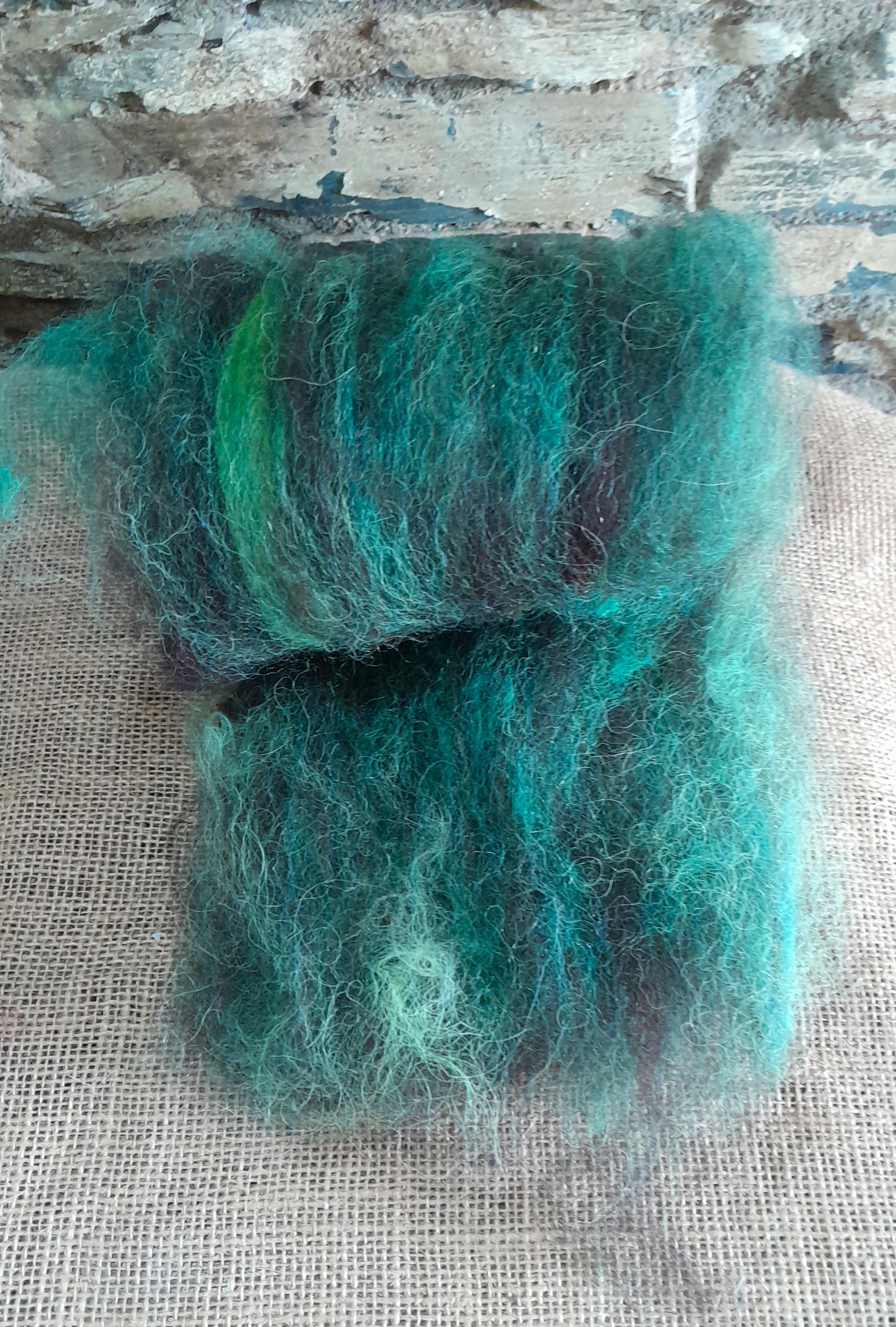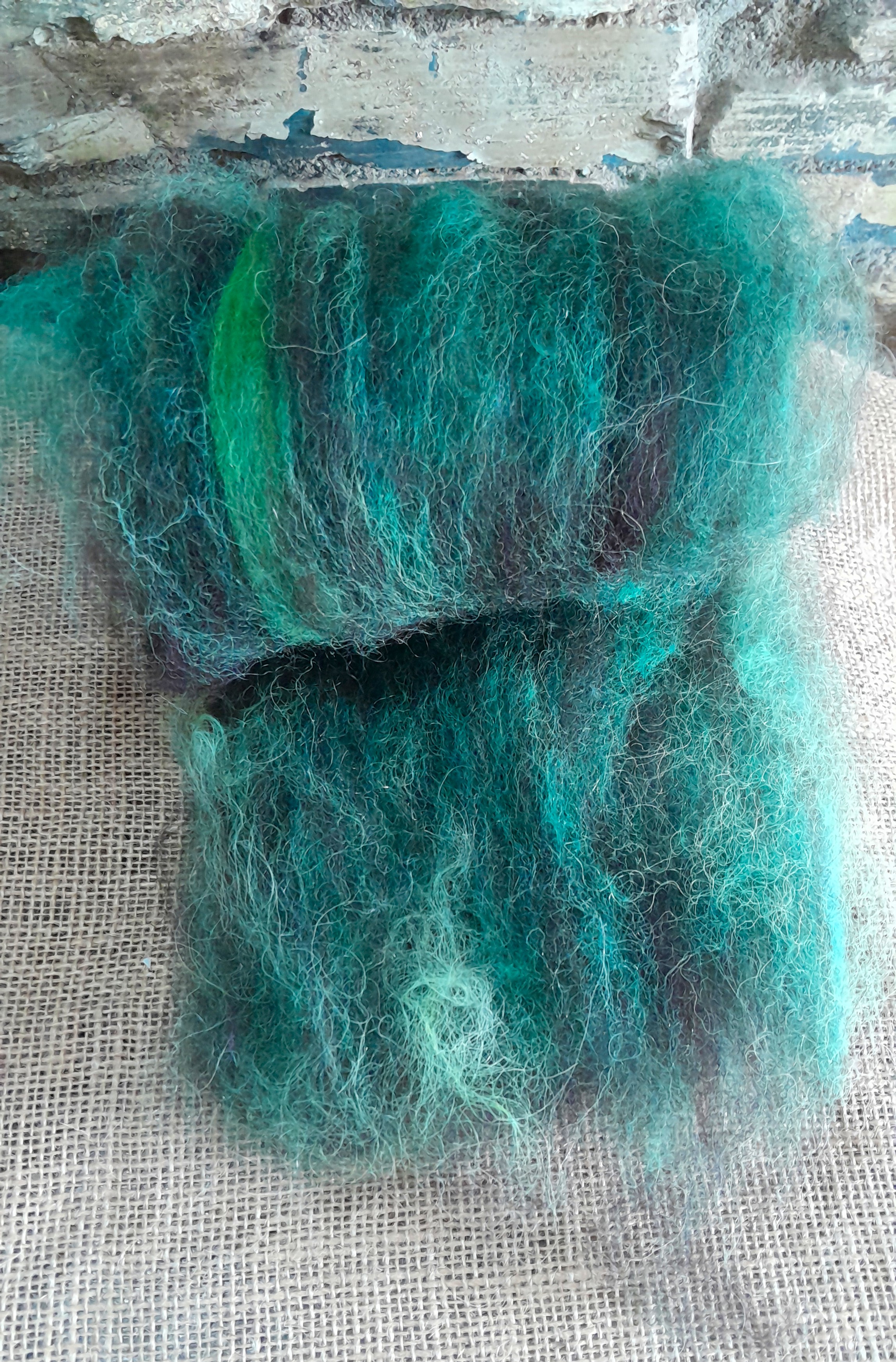 Our carded art batts have been handmade on our drum carder. They are made from our own various types of hand dyed wools and fibres. These have all been lightly carded so there are still some natural textures that can be found in the batt - for instance, you'll notice a few curly teeswater locks in the batts, some blue faced leicester tiny curls, and some valais waves - our batts have been created to have a mix of breeds of wool sheep in, to allow for ease of felting, and some also contain some mohair and alpaca, for a touch of luxury!