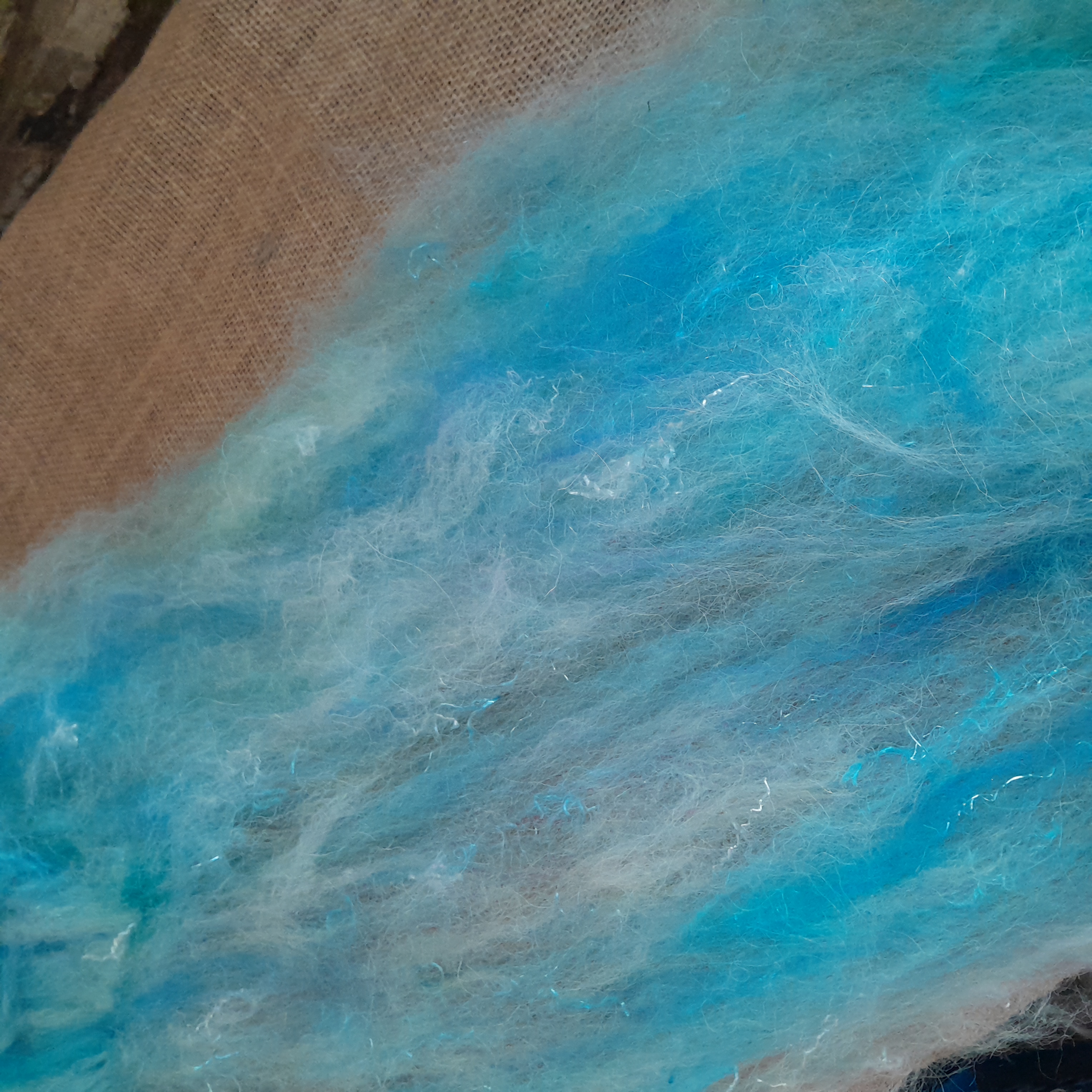 Our carded art batts have been handmade on our drum carder. They are made from our own various types of hand dyed wools and fibres. These have all been lightly carded so there are still some natural textures that can be found in the batt - for instance, you'll notice a few curly teeswater locks in the batts, some blue faced leicester tiny curls, and some valais waves - our batts have been created to have a mix of breeds of wool sheep in, to allow for ease of felting, and some also contain some mohair and alpaca, for a touch of luxury!