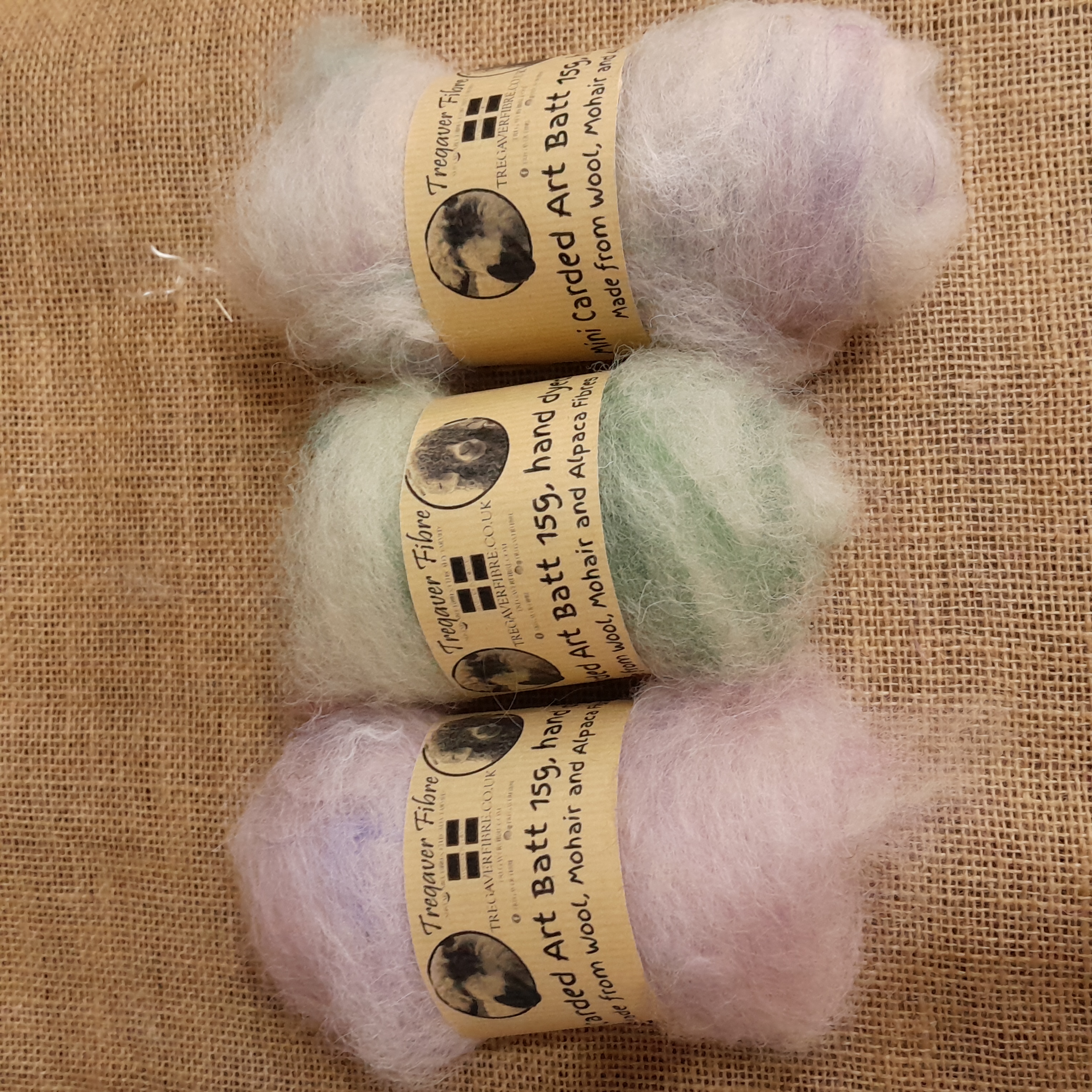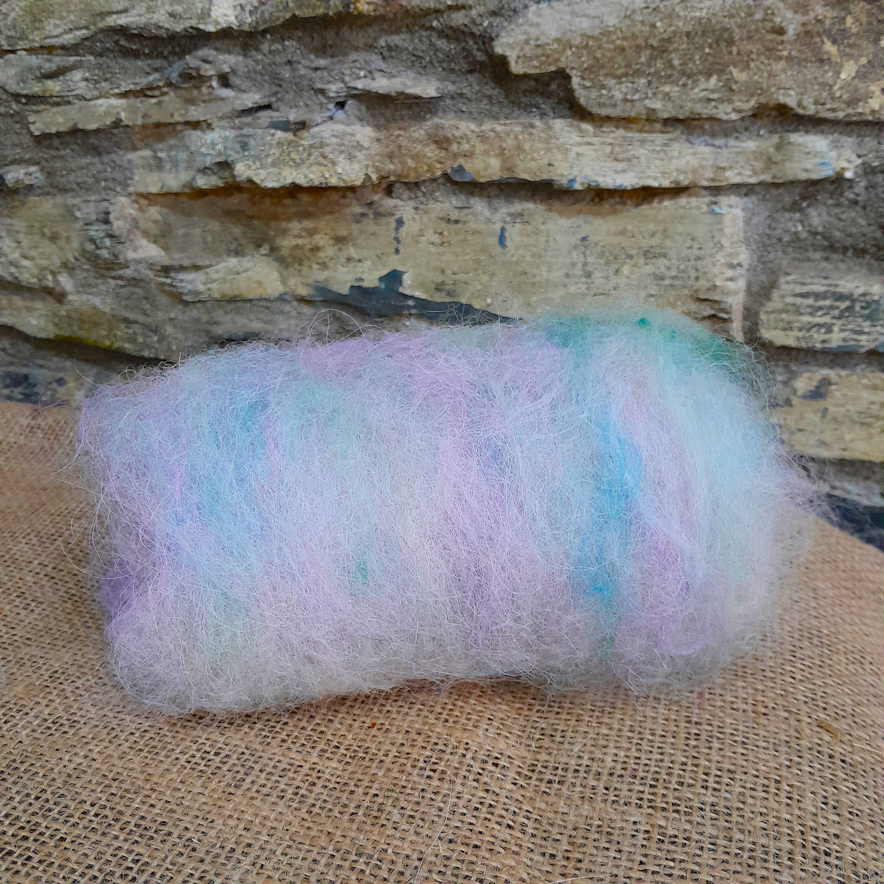 Our carded art batts have been handmade on our drum carder. They are made from our own various types of hand dyed wools and fibres. These have all been lightly carded so there are still some natural textures that can be found in the batt - for instance, you'll notice a few curly teeswater locks in the batts, some blue faced leicester tiny curls, and some valais waves - our batts have been created to have a mix of breeds of wool sheep in, to allow for ease of felting, and some also contain some mohair and alpaca, for a touch of luxury!