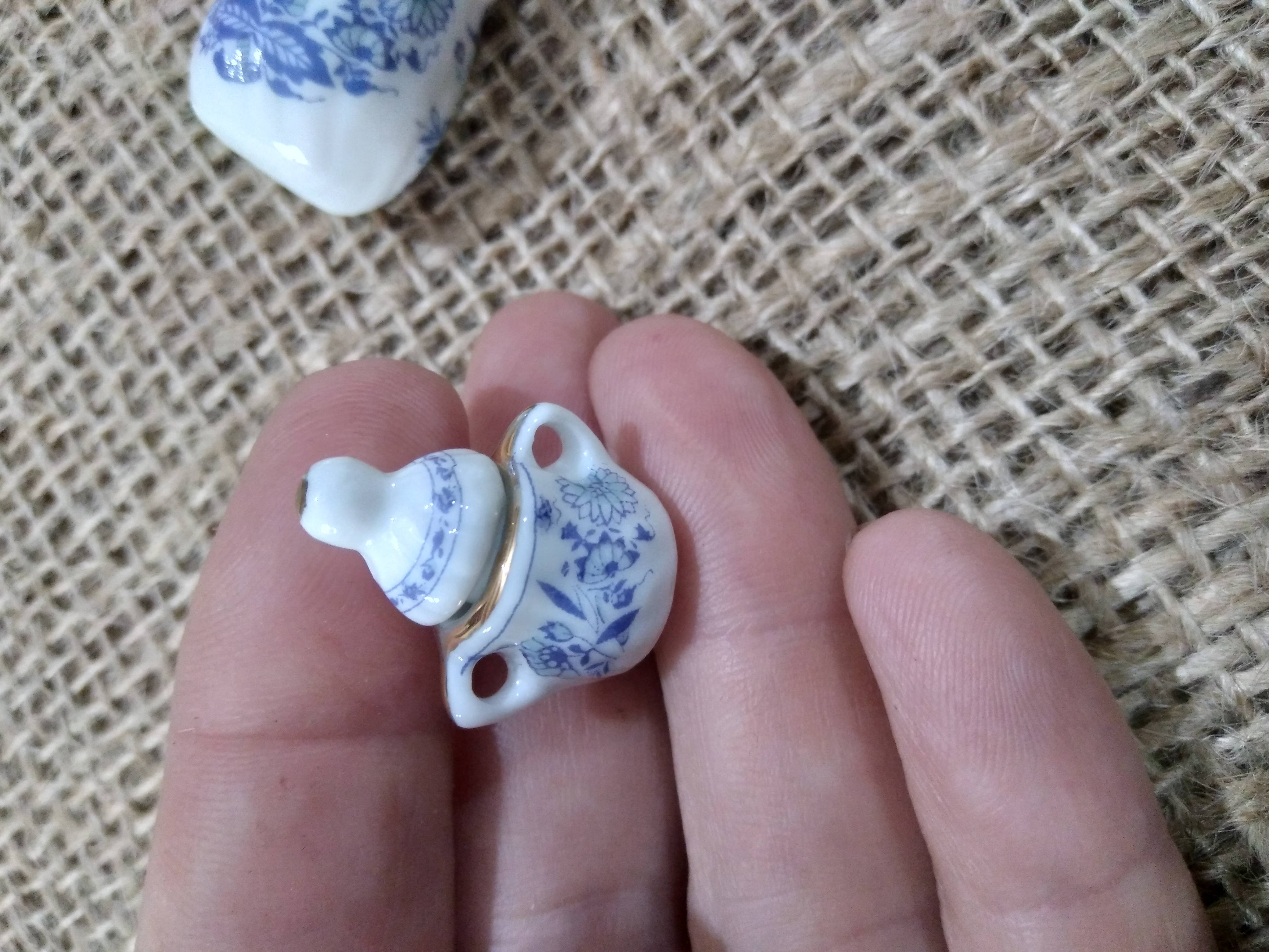 This miniature ceramic sugar bowl has a classic blue and white pattern, with golden metallic painted edges