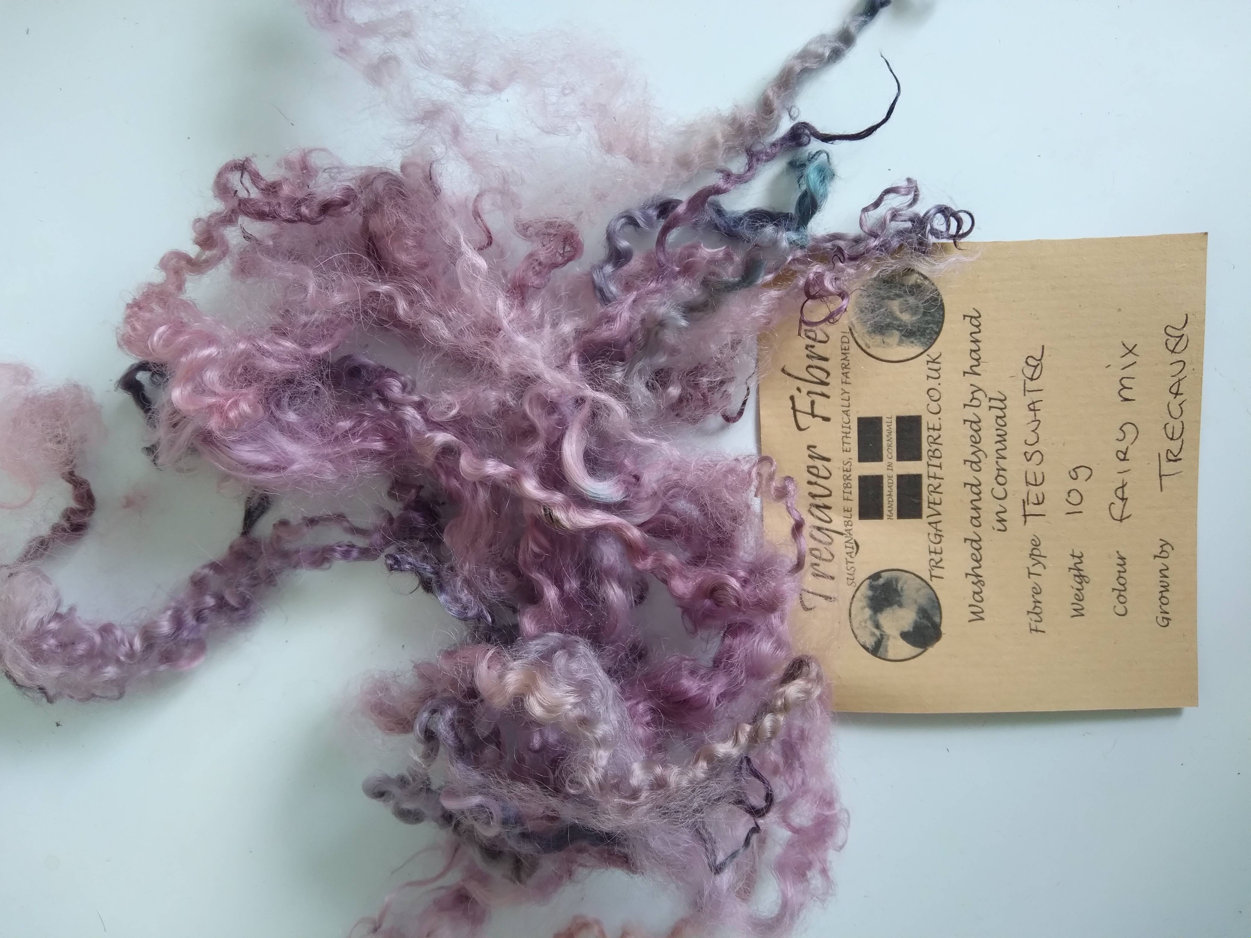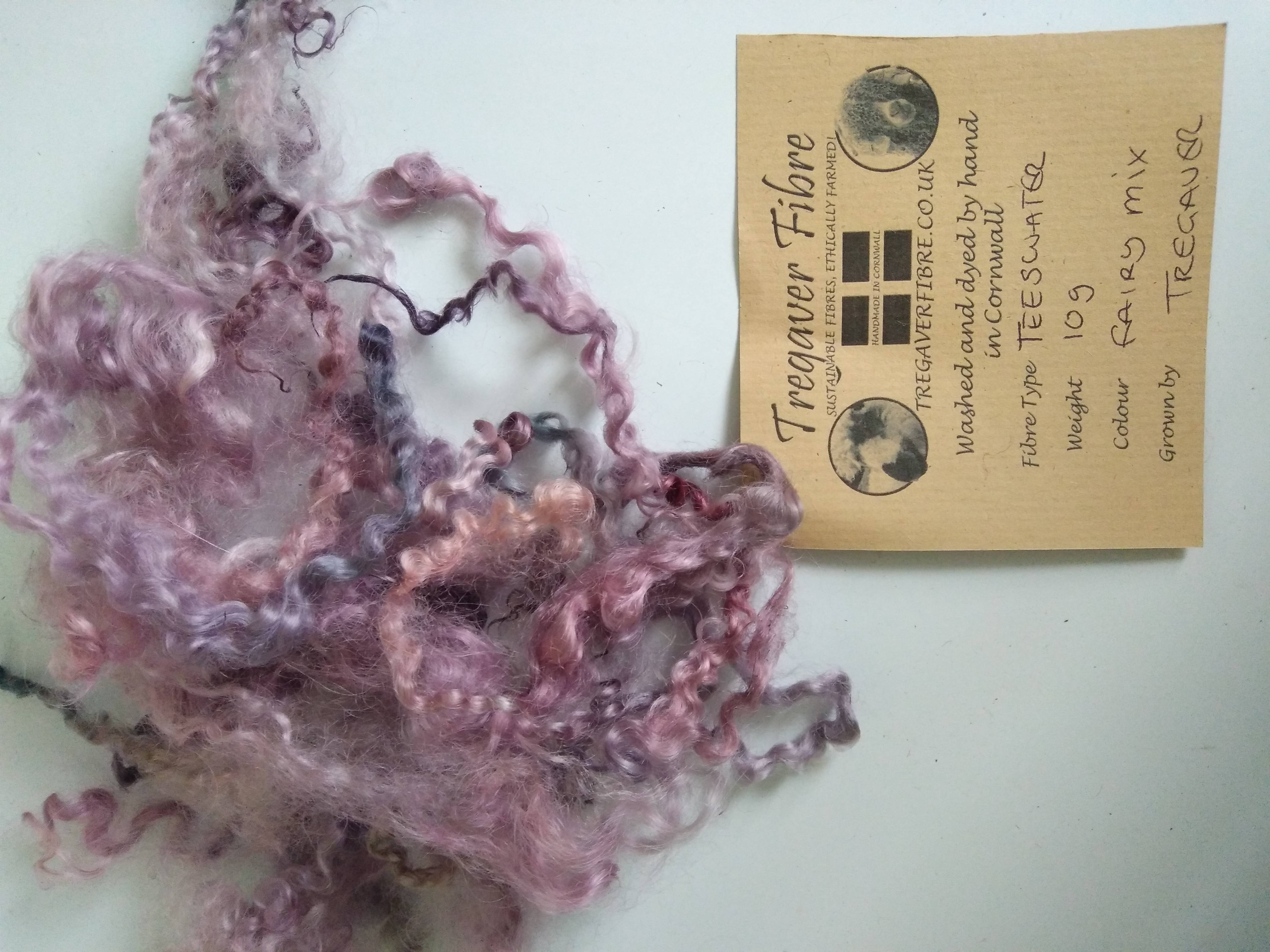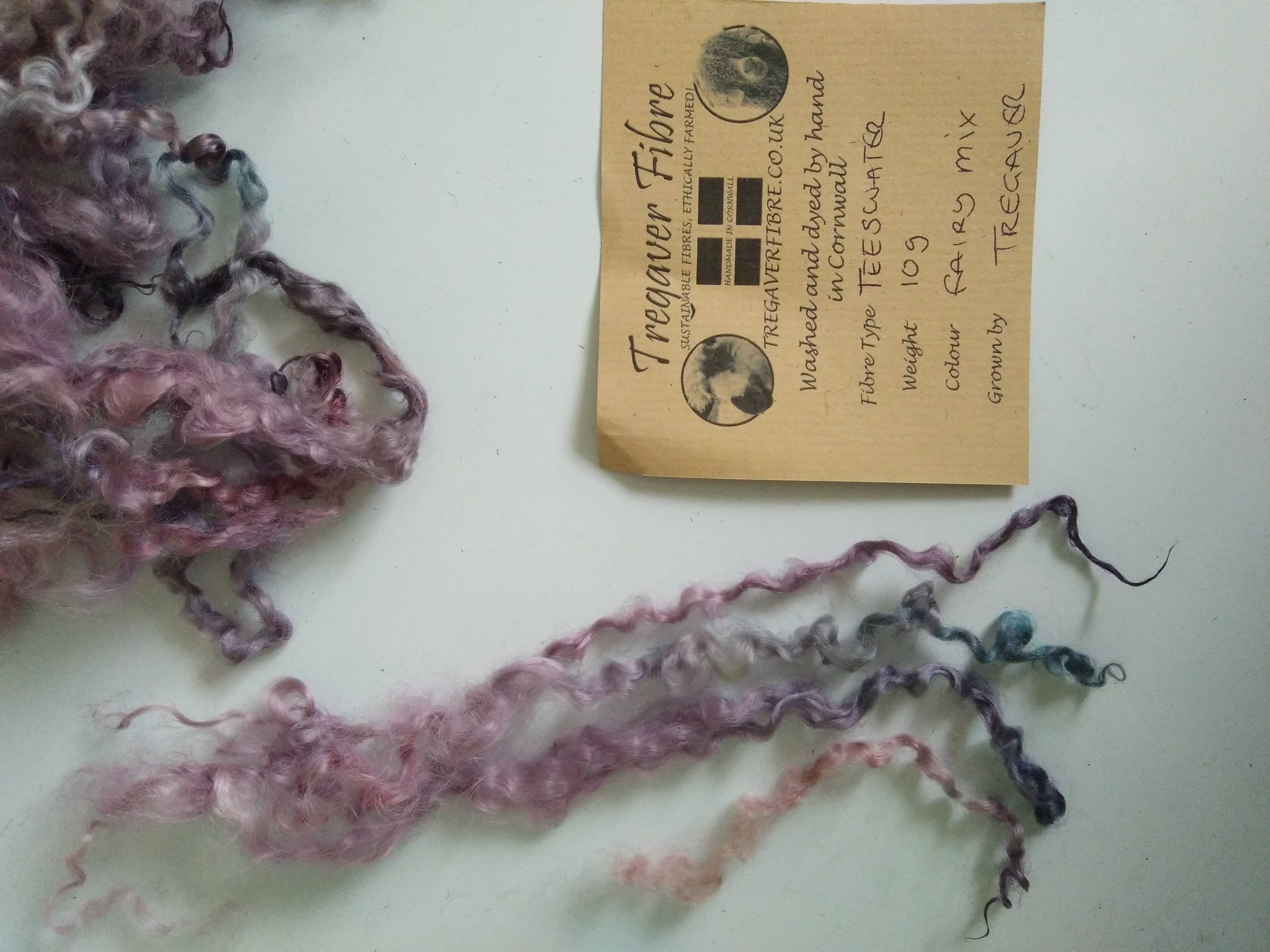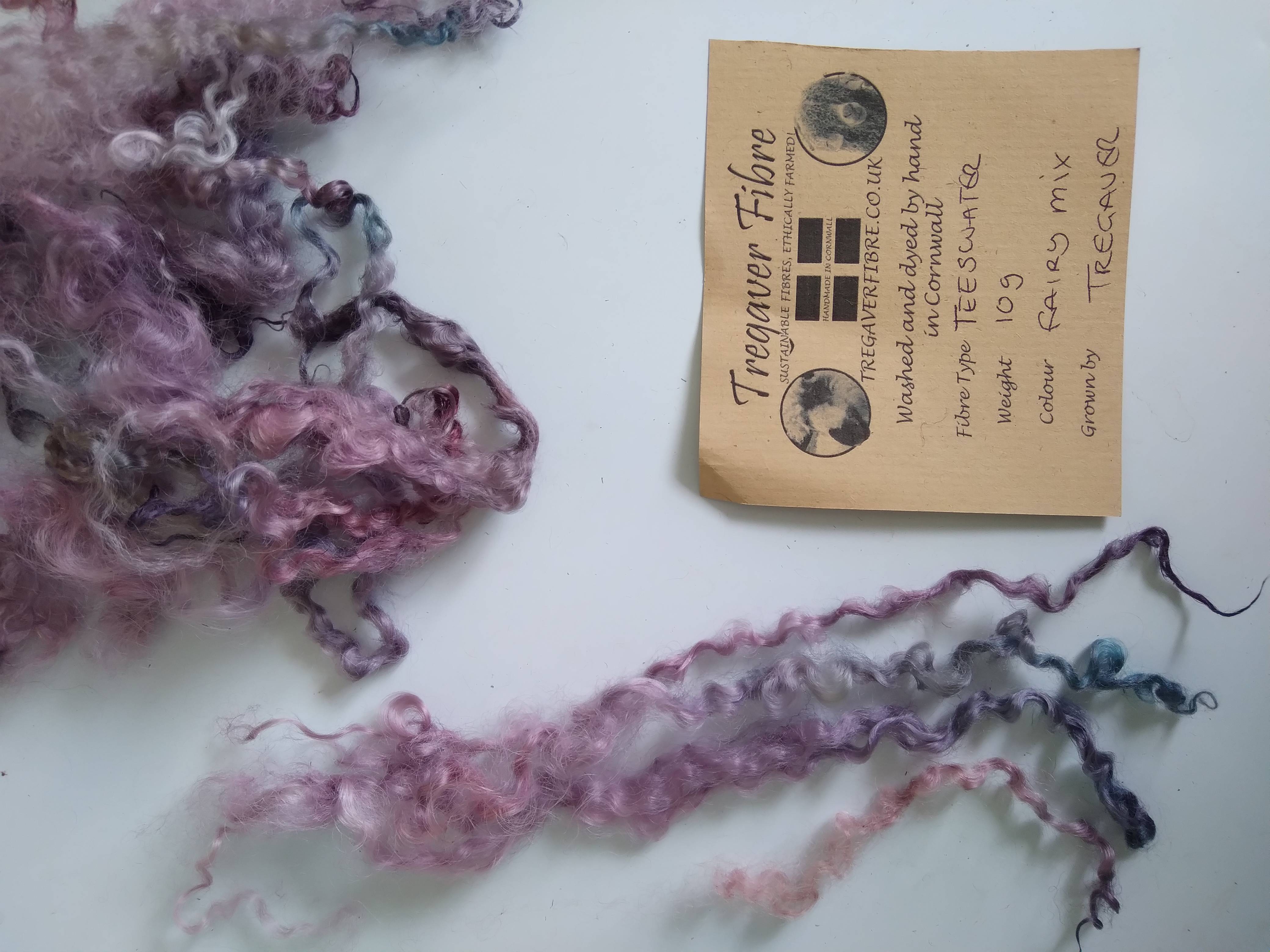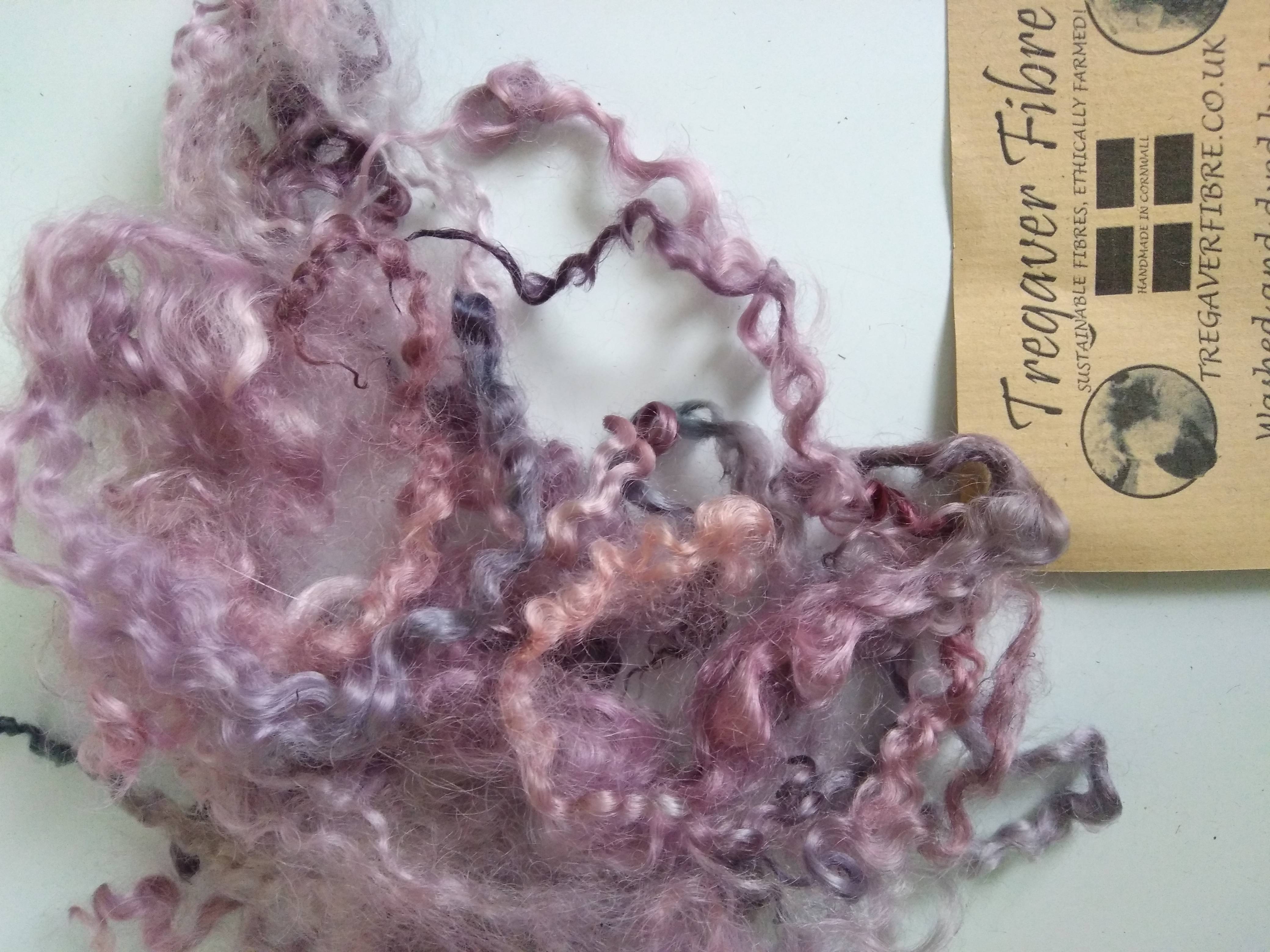These teeswater curly wool fibres our own non slaughter flock and have been handyed in a mixture of pink purple and blue tones