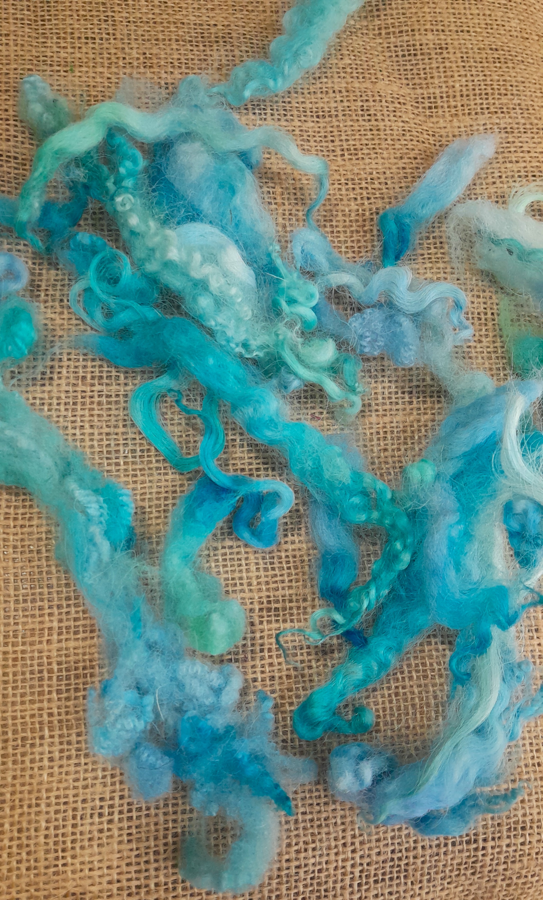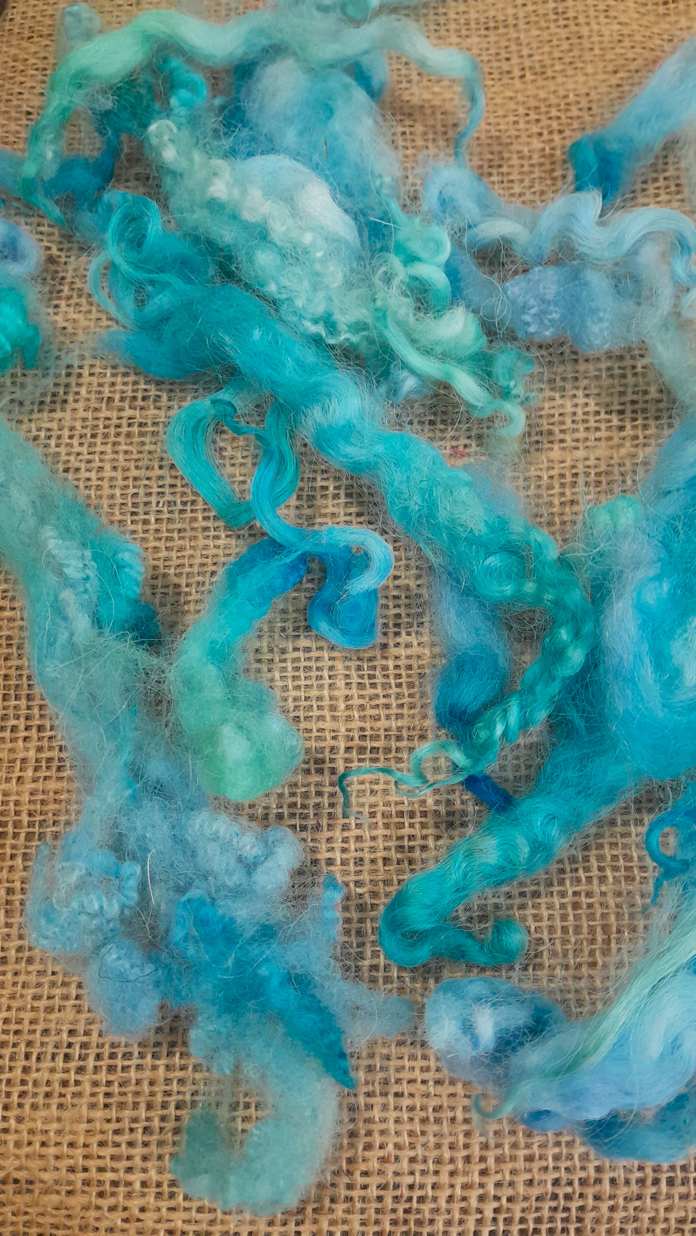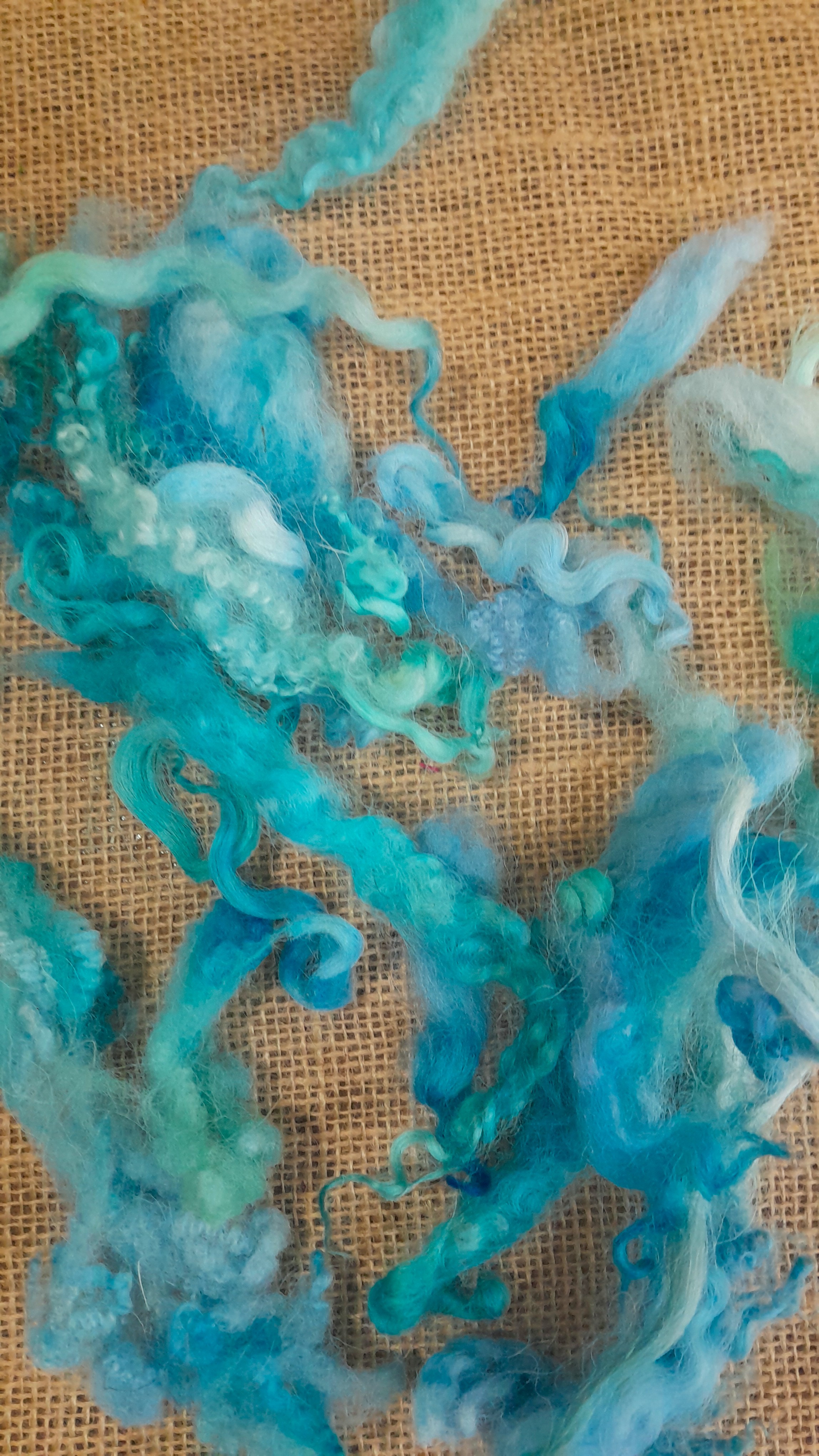 100% hand processed and hand dyed some of the breeds included in this mix are teeswater, whitewater, white faced dartmoor fibre, masham, Devon and Cornwall Longwool and more!