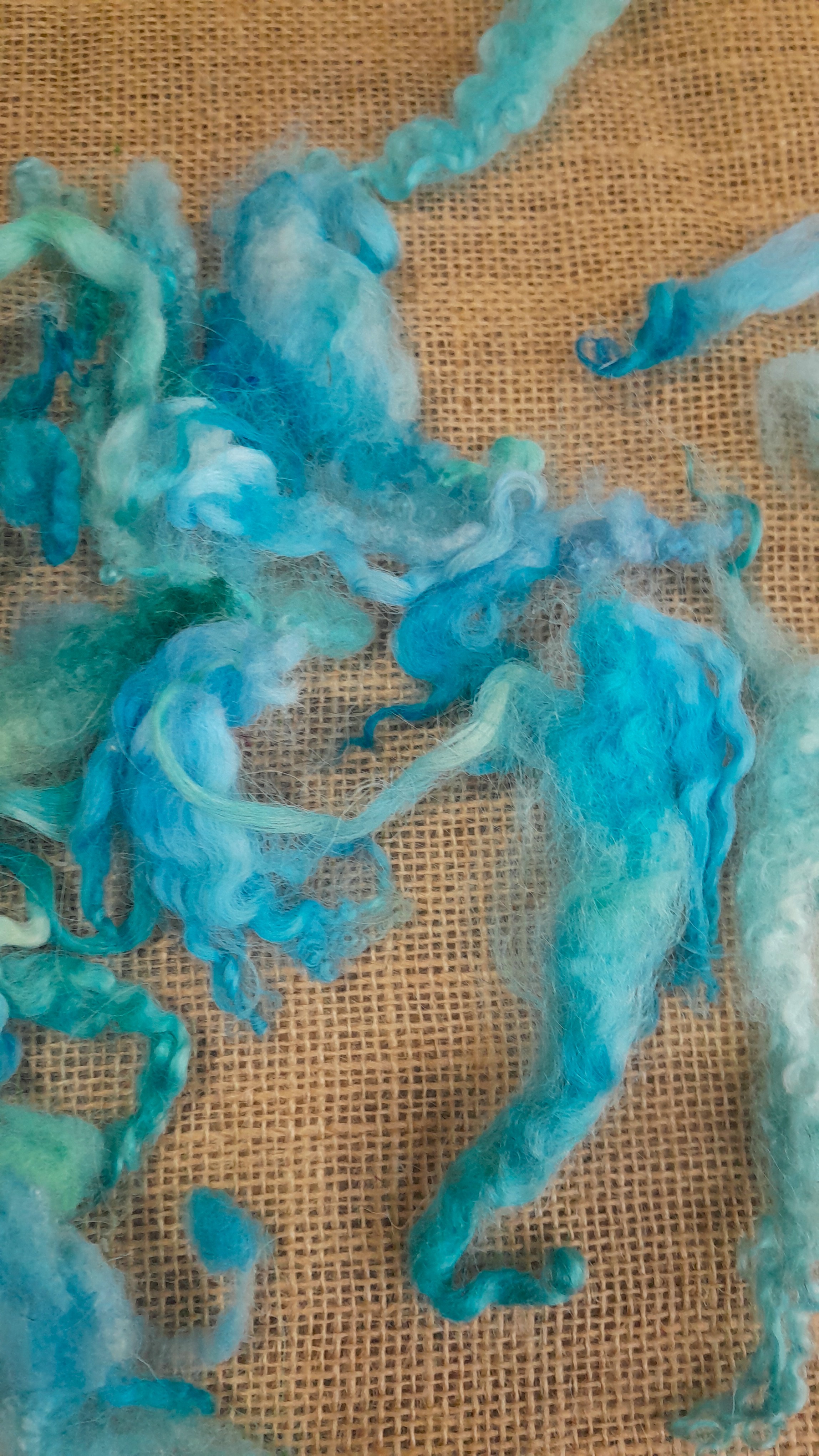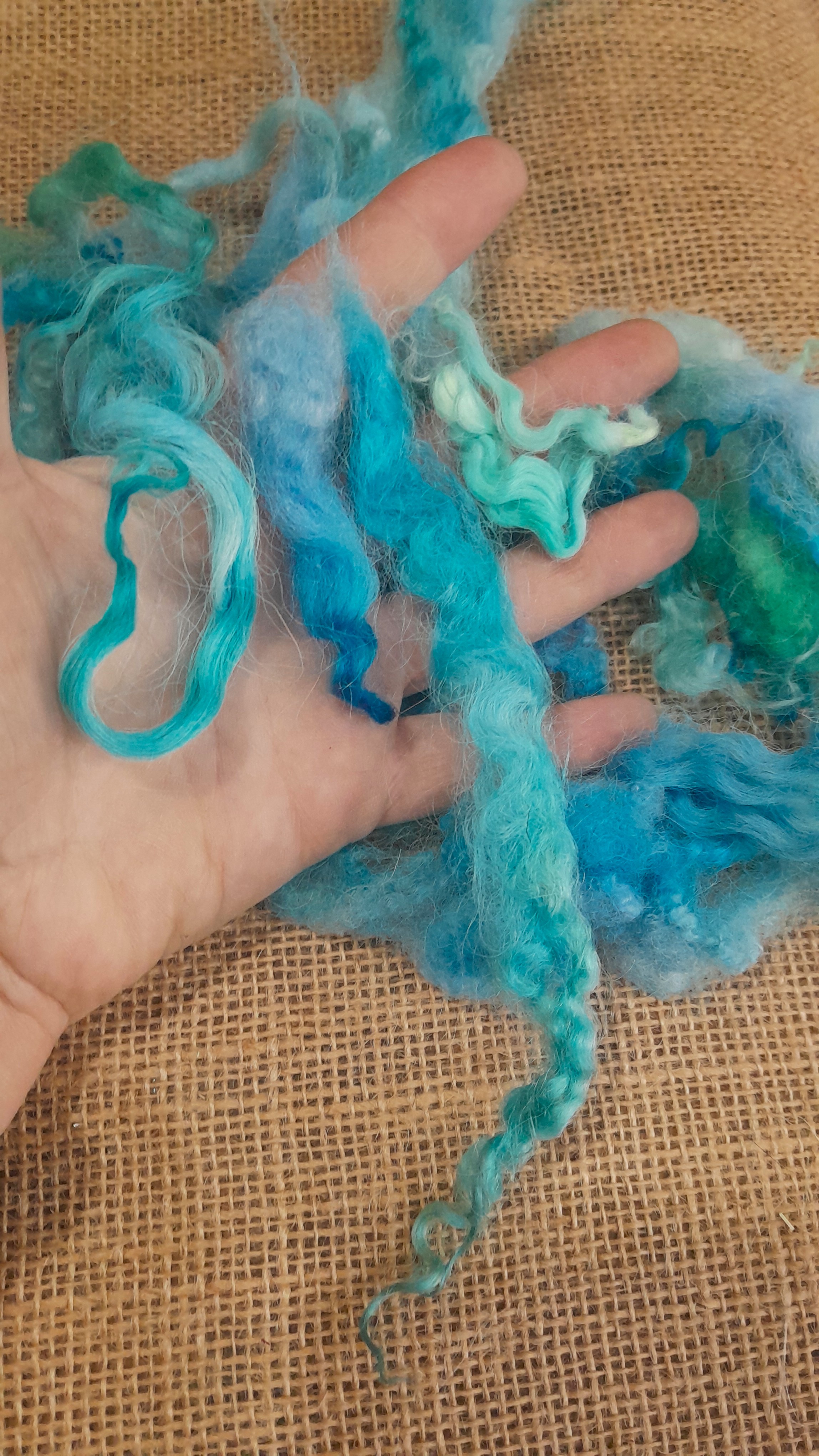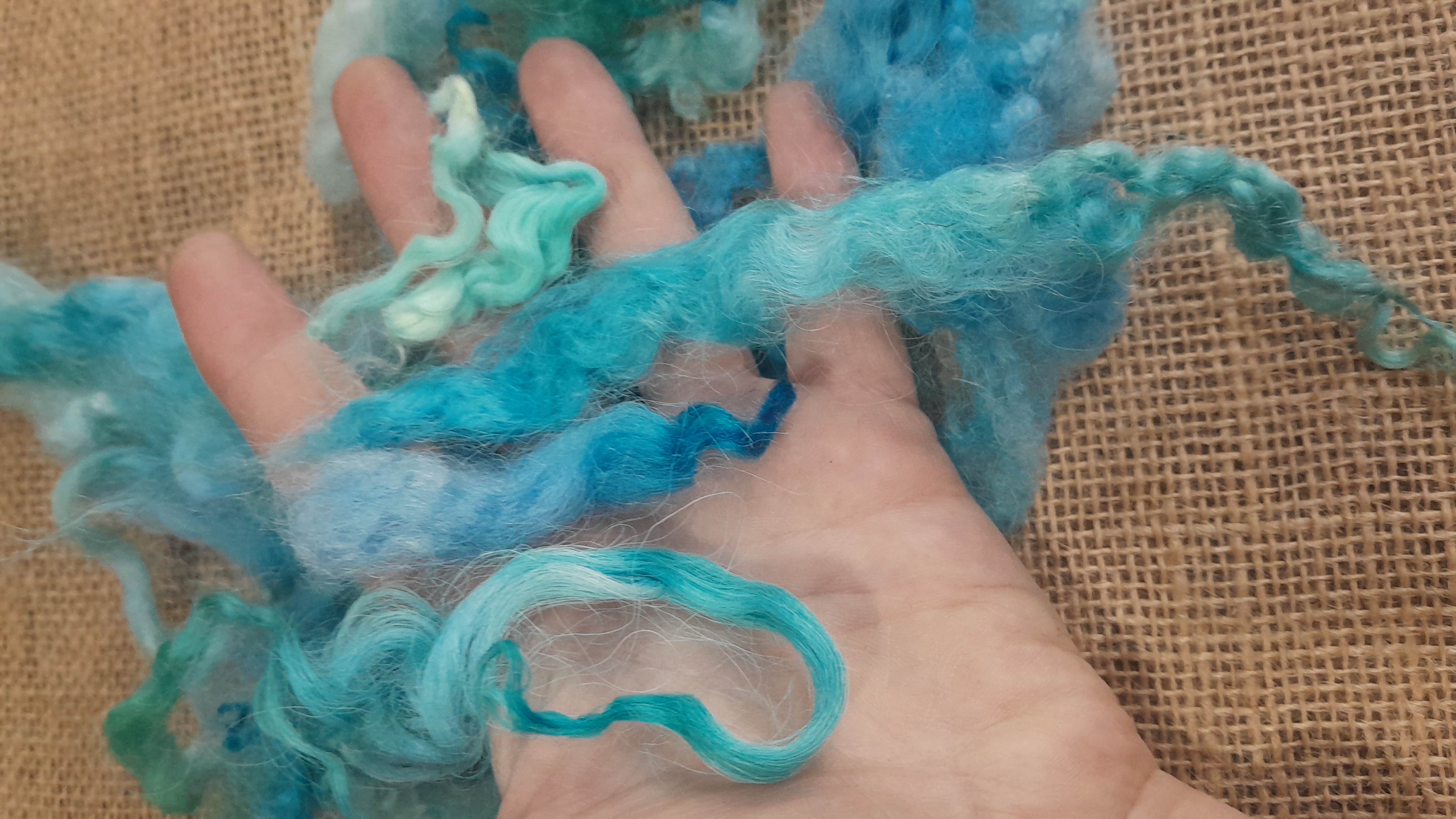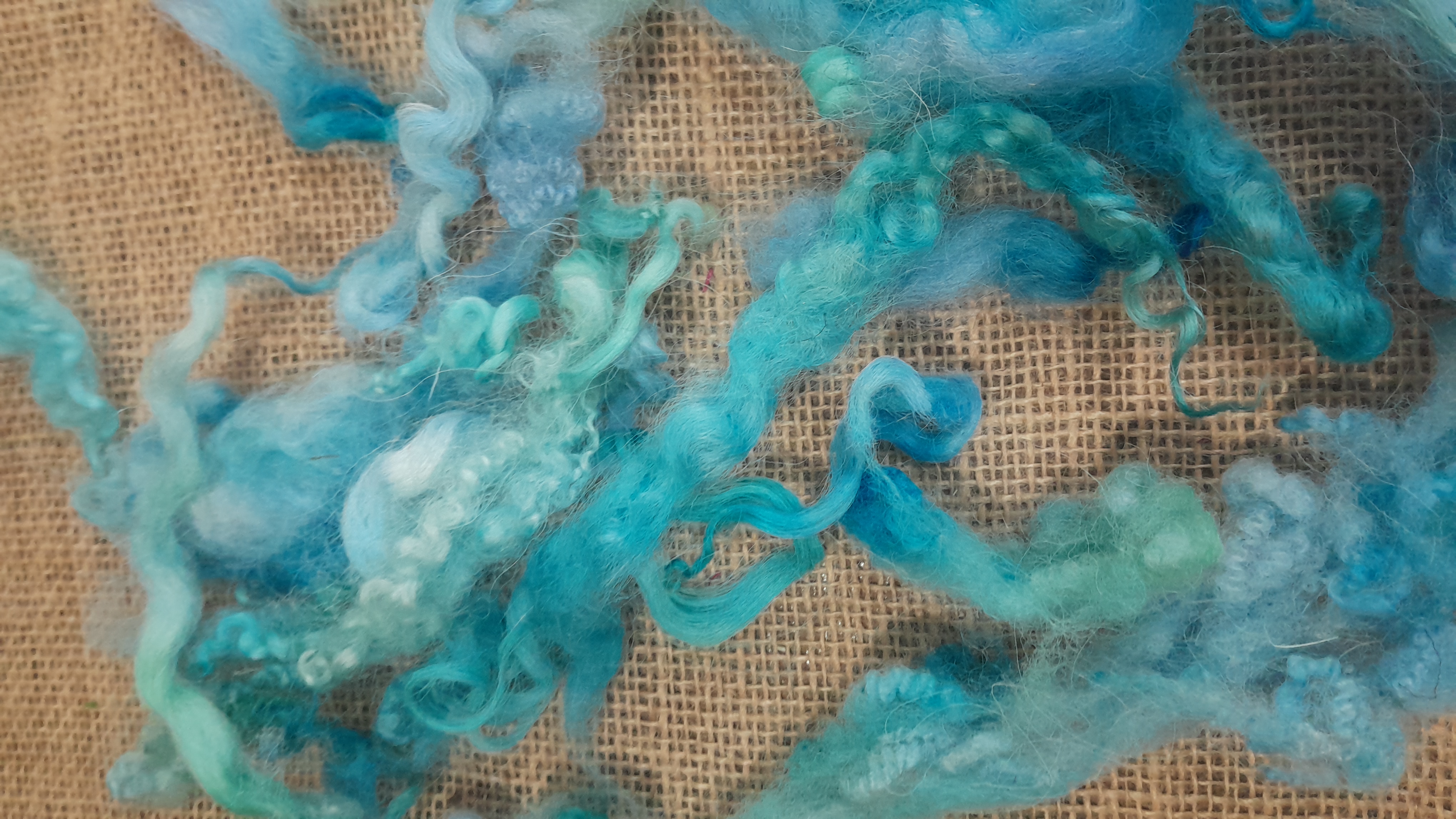 100% hand processed and hand dyed some of the breeds included in this mix are teeswater, whitewater, white faced dartmoor fibre, masham, Devon and Cornwall Longwool and more!
