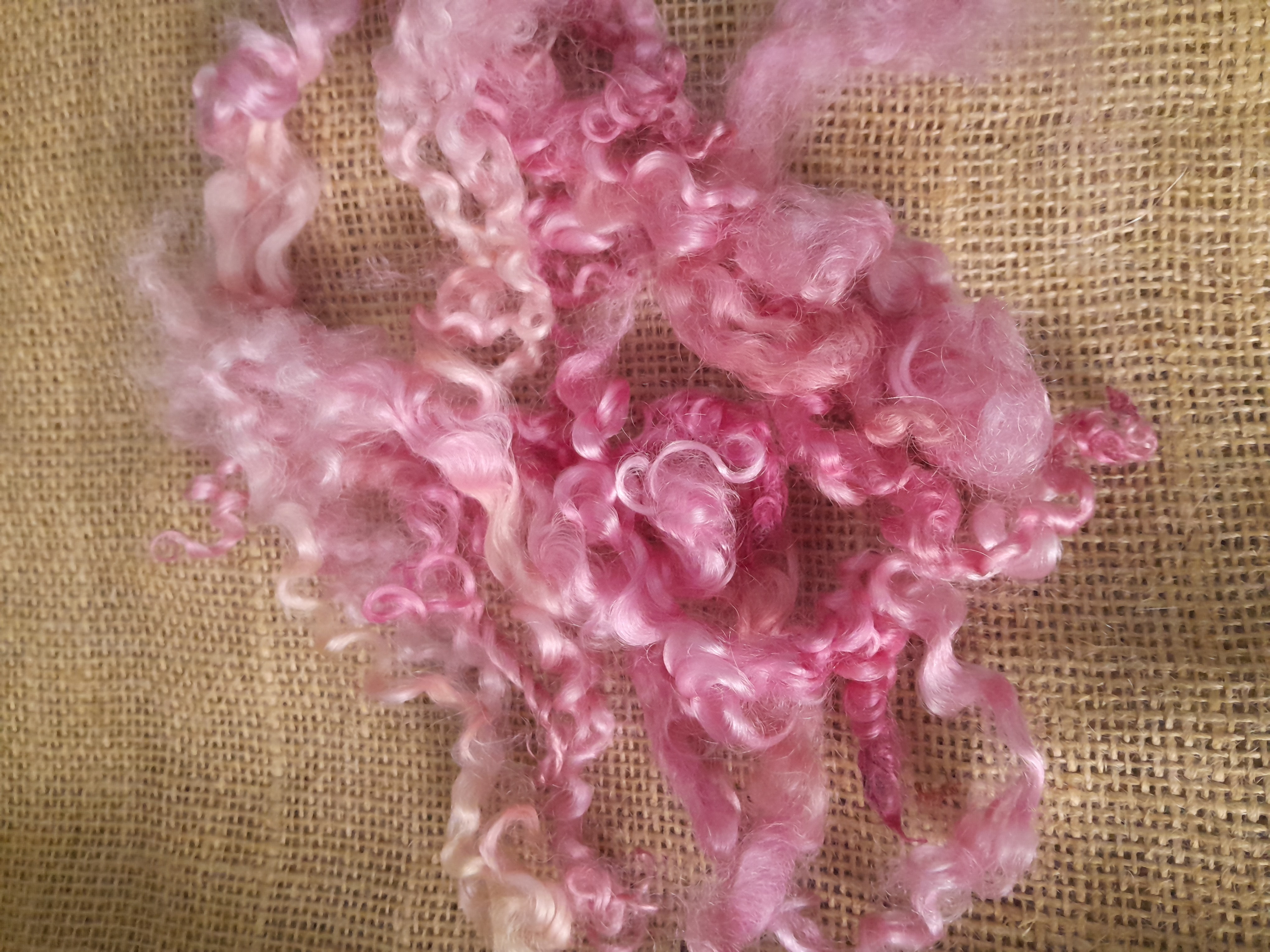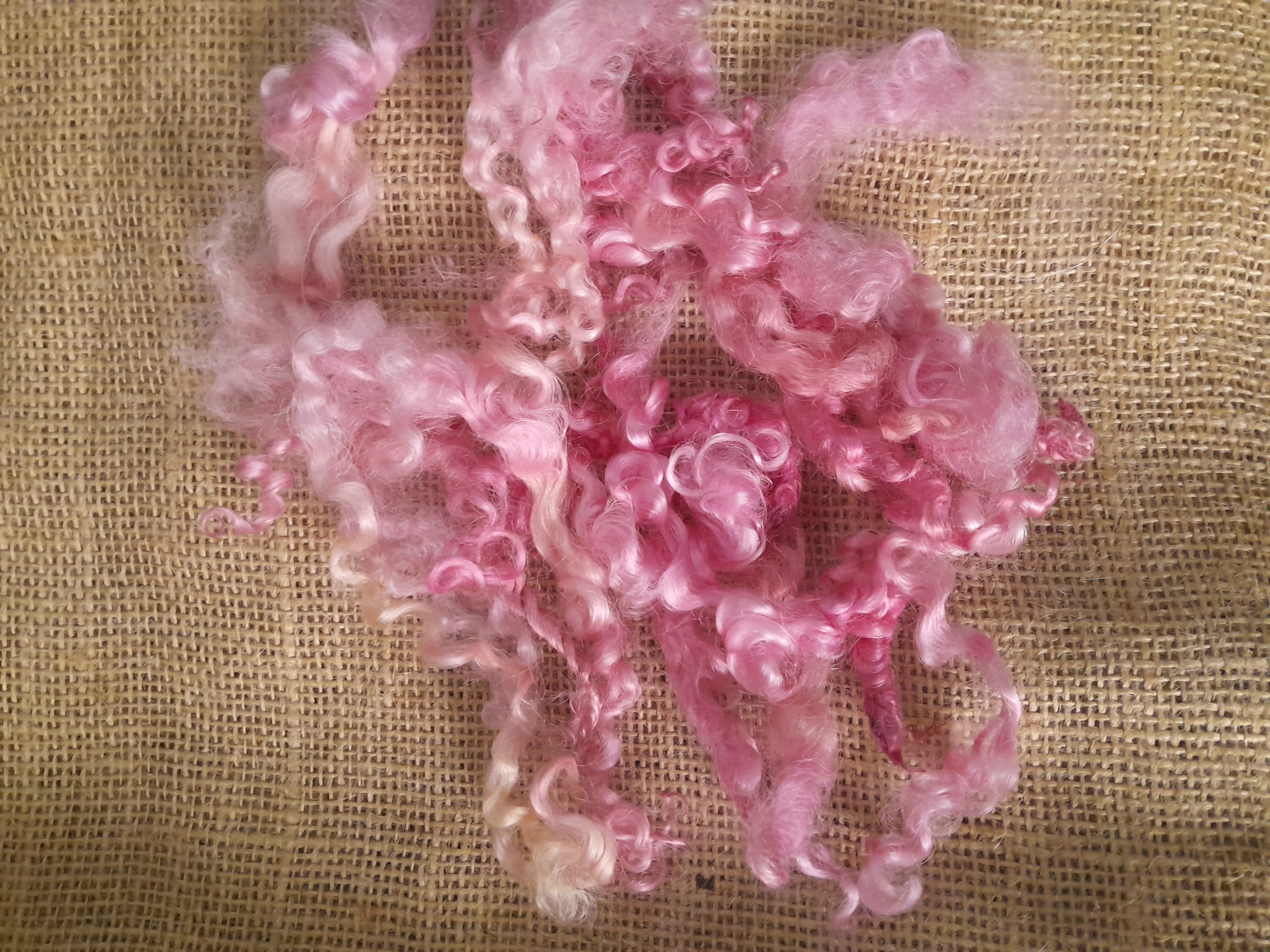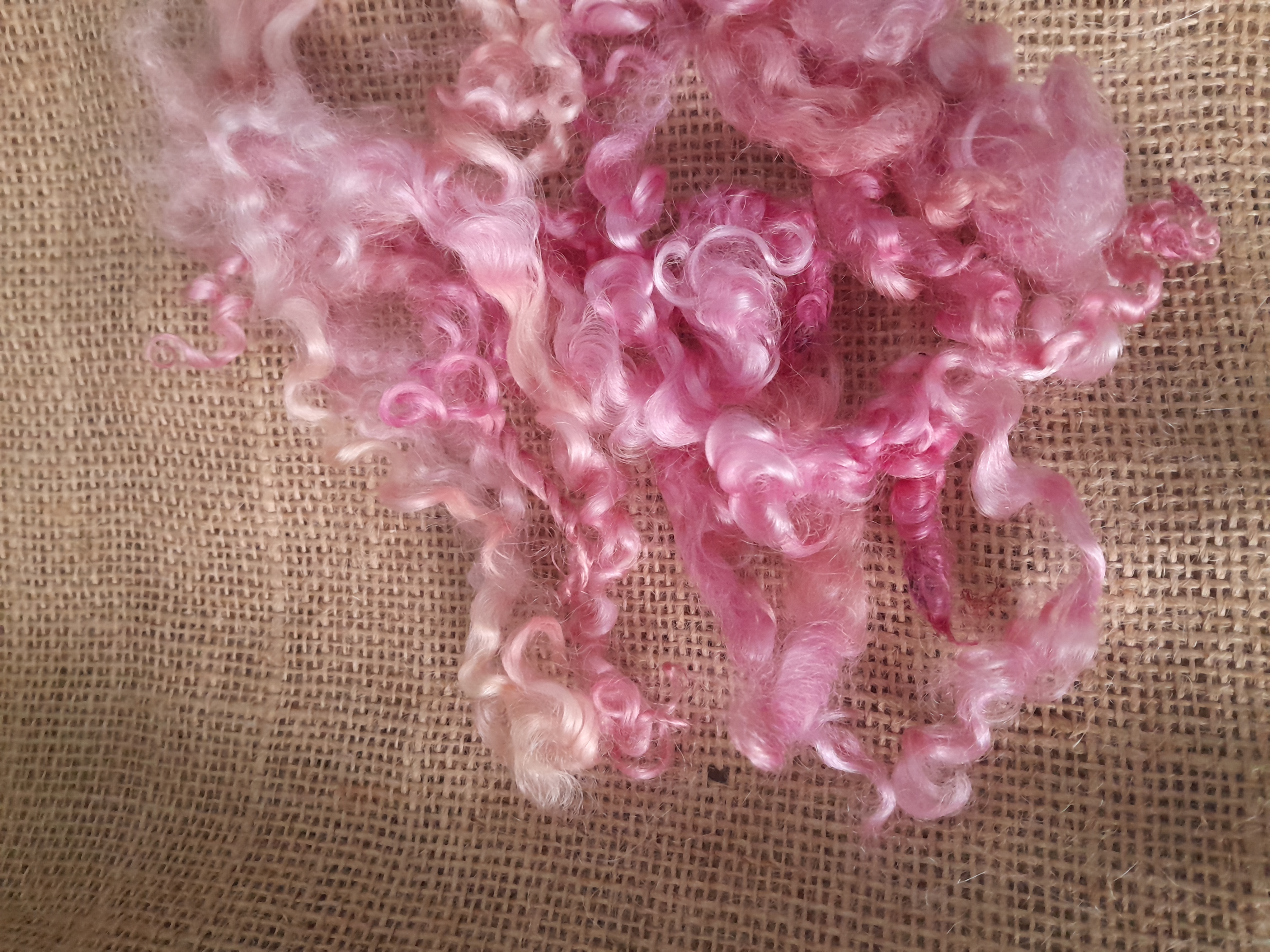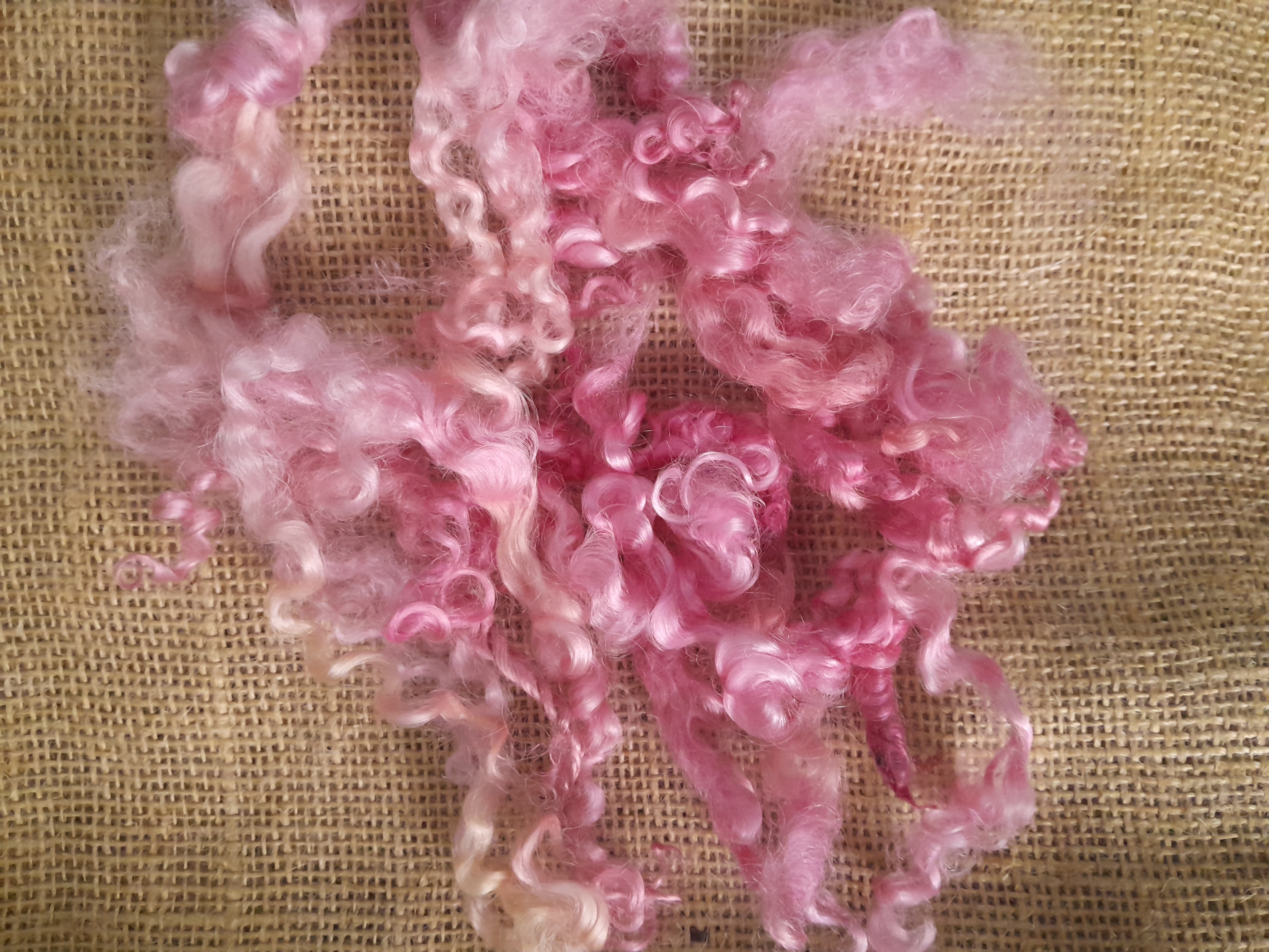 This fibre has been hand dyed in a variety of pink tones with some golden and blonde highlights