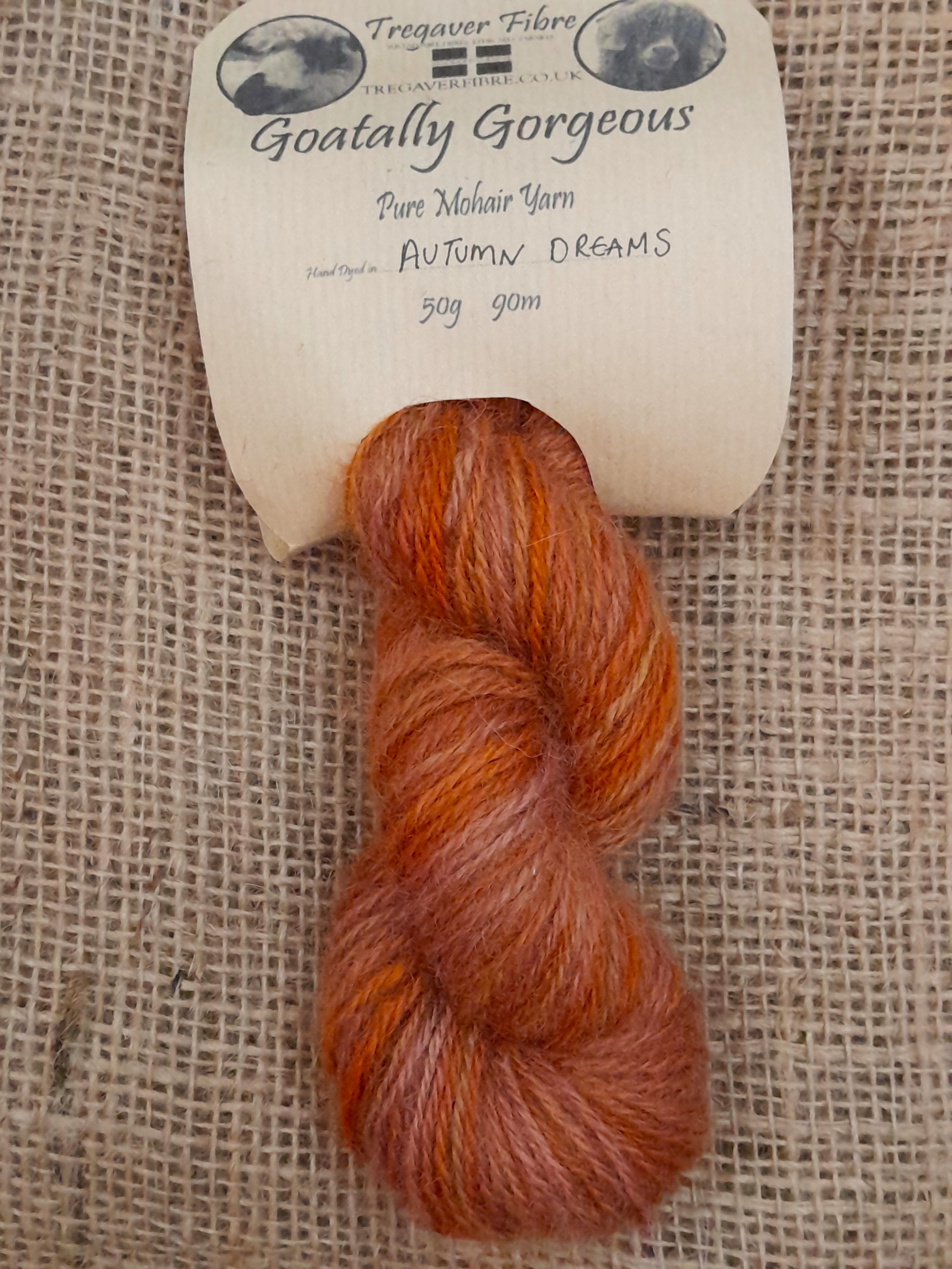 Goatally Gorgeous Pure Mohair Yarn in Hand Dyed in Autumn Dream (v) orange/brown/gold