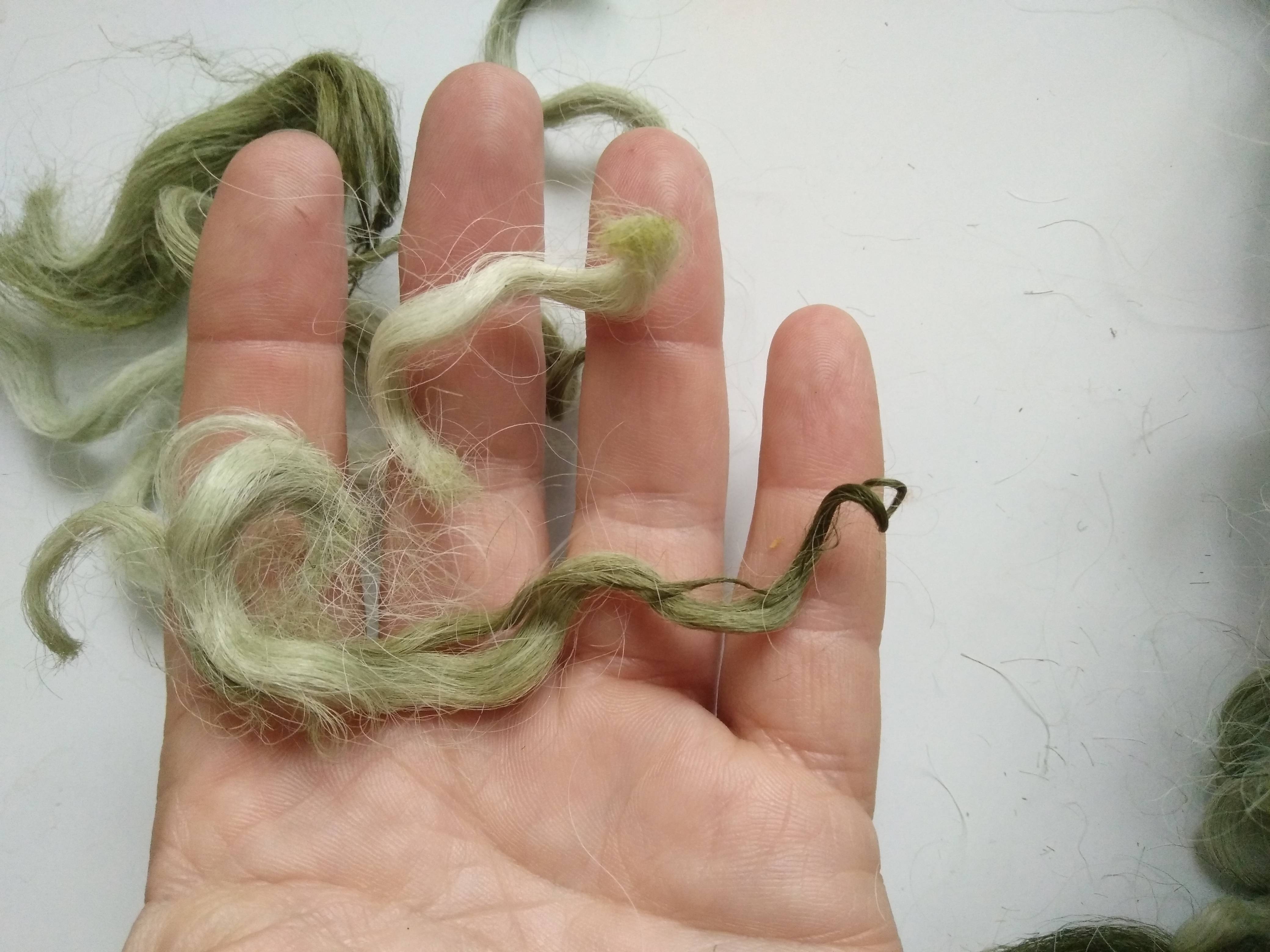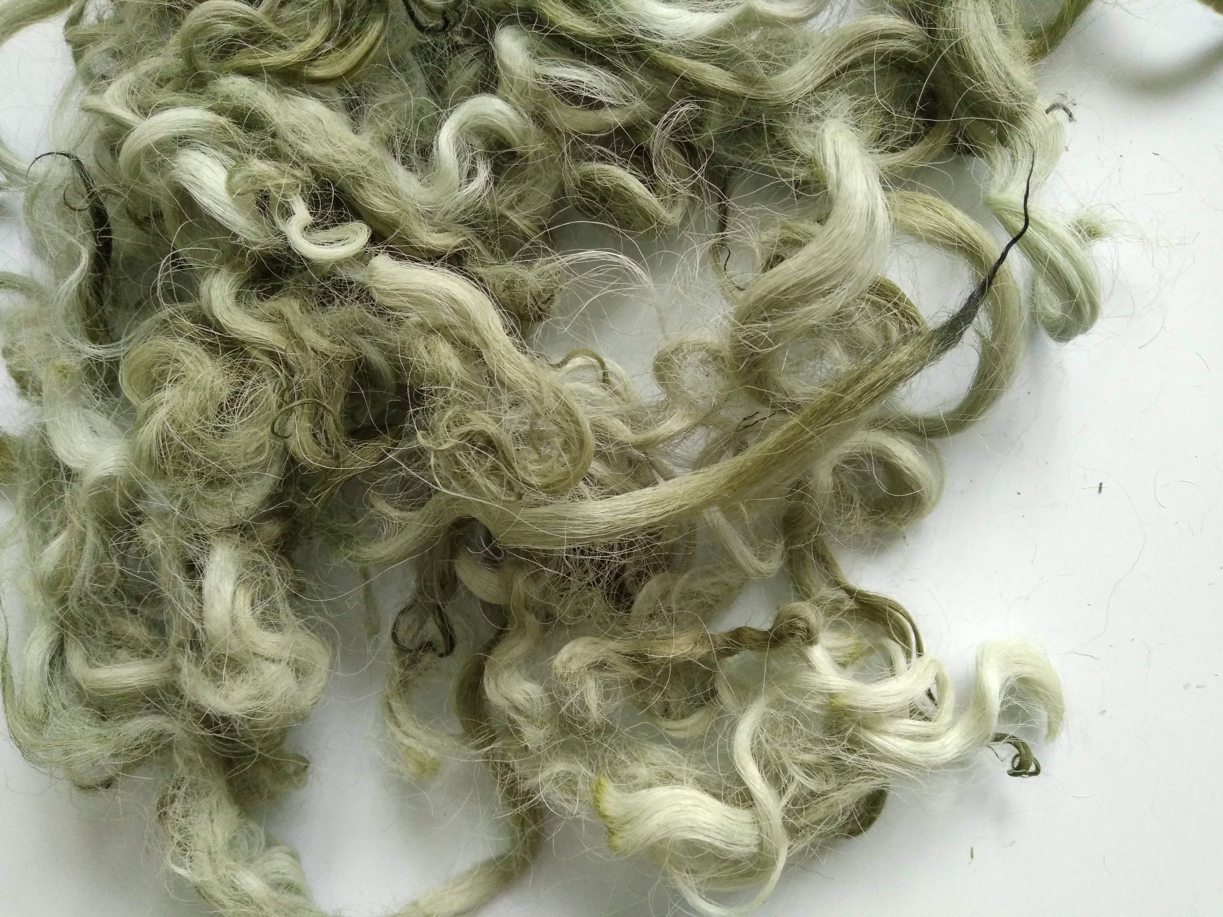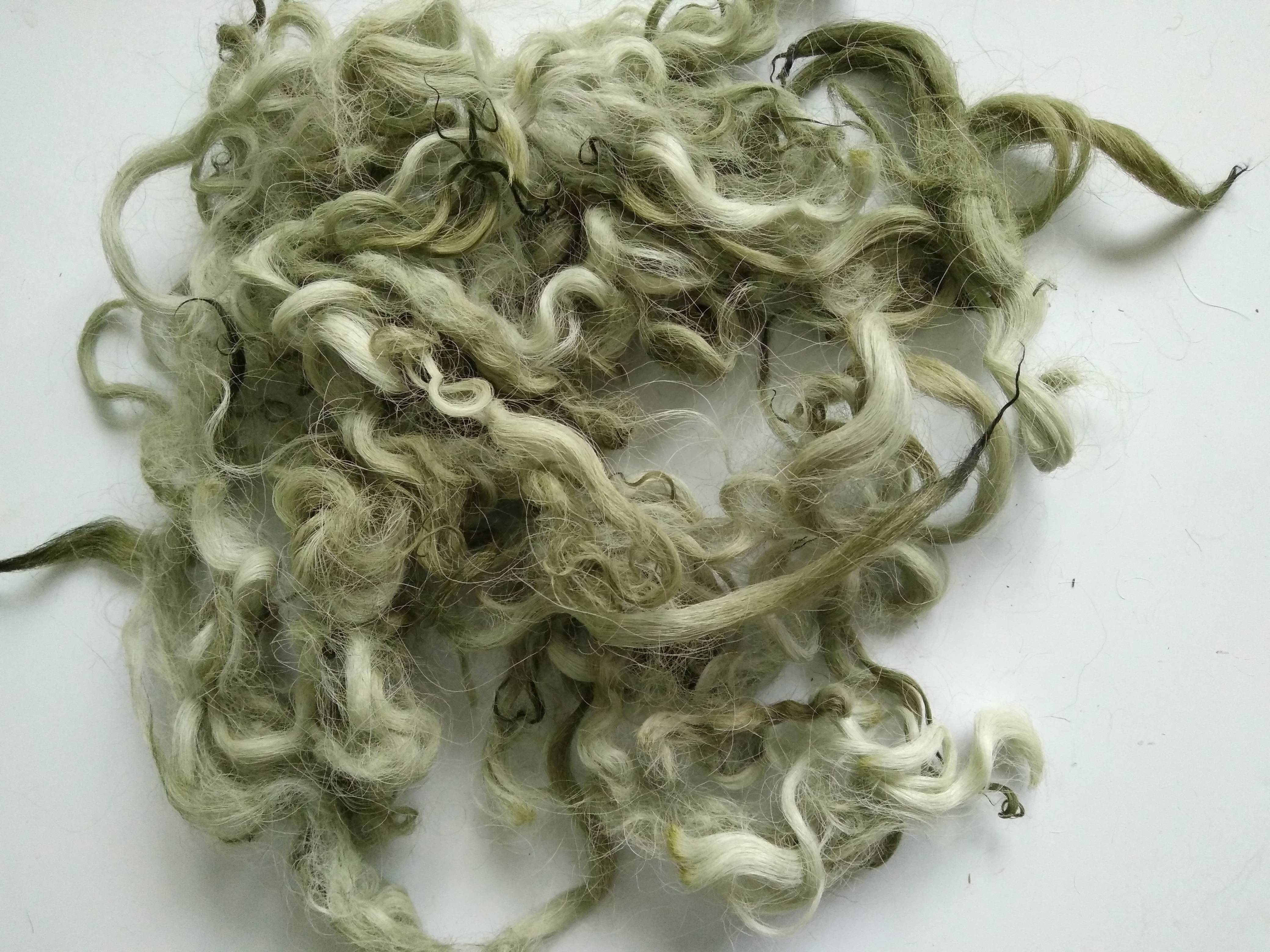 This fibre has been 100% hand processed (very well washed by hand multiple times) and is has been hand dyed in a mixture of moss green tones