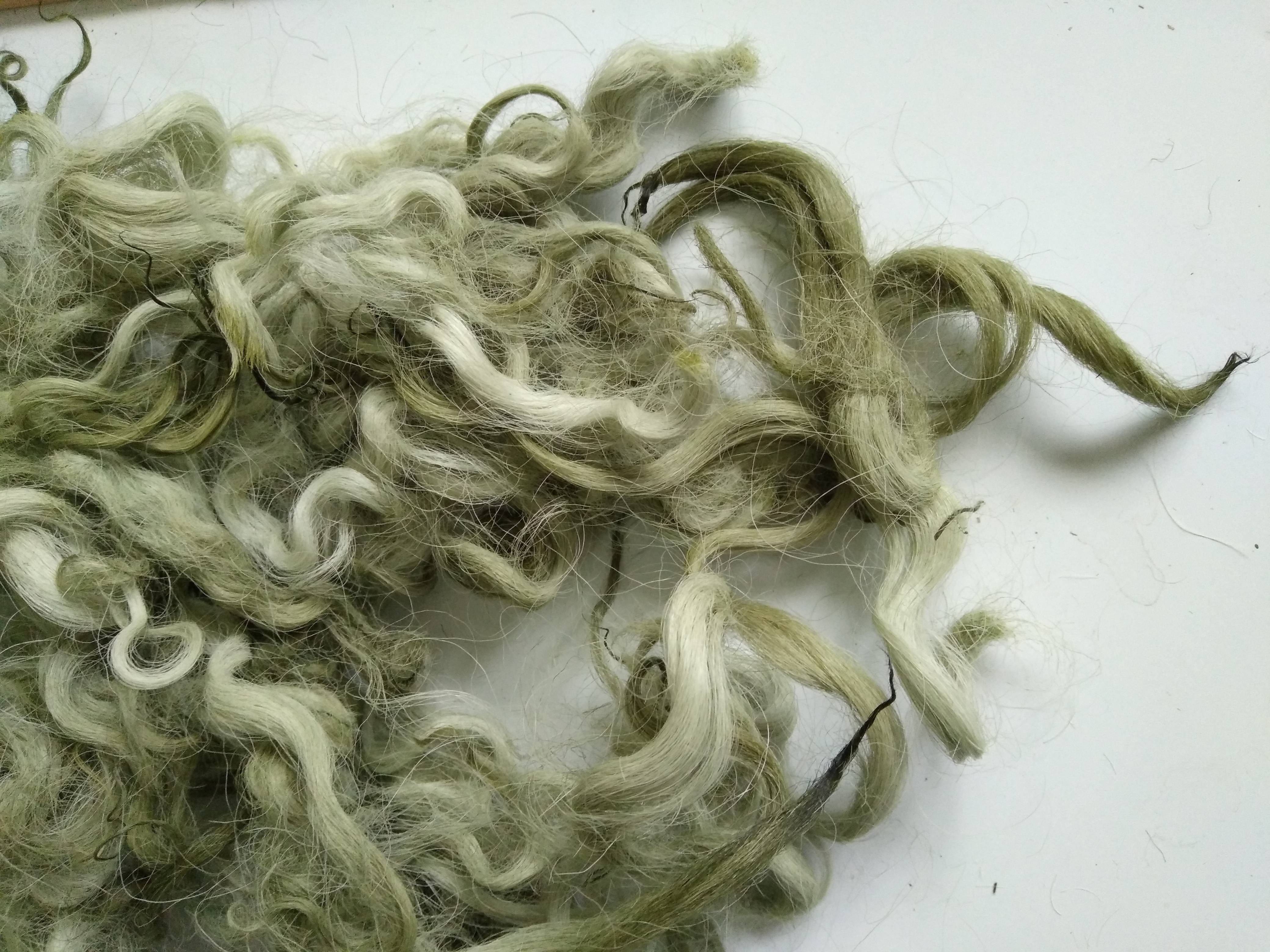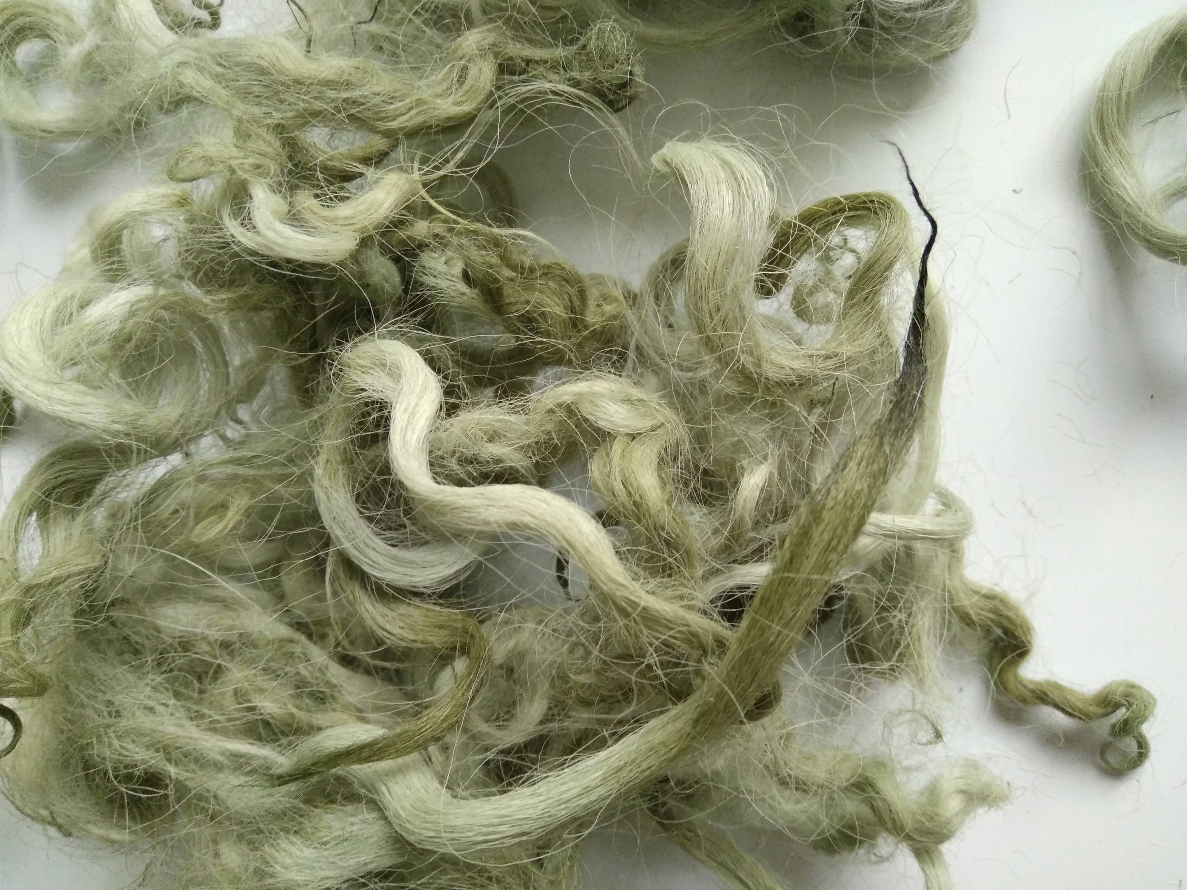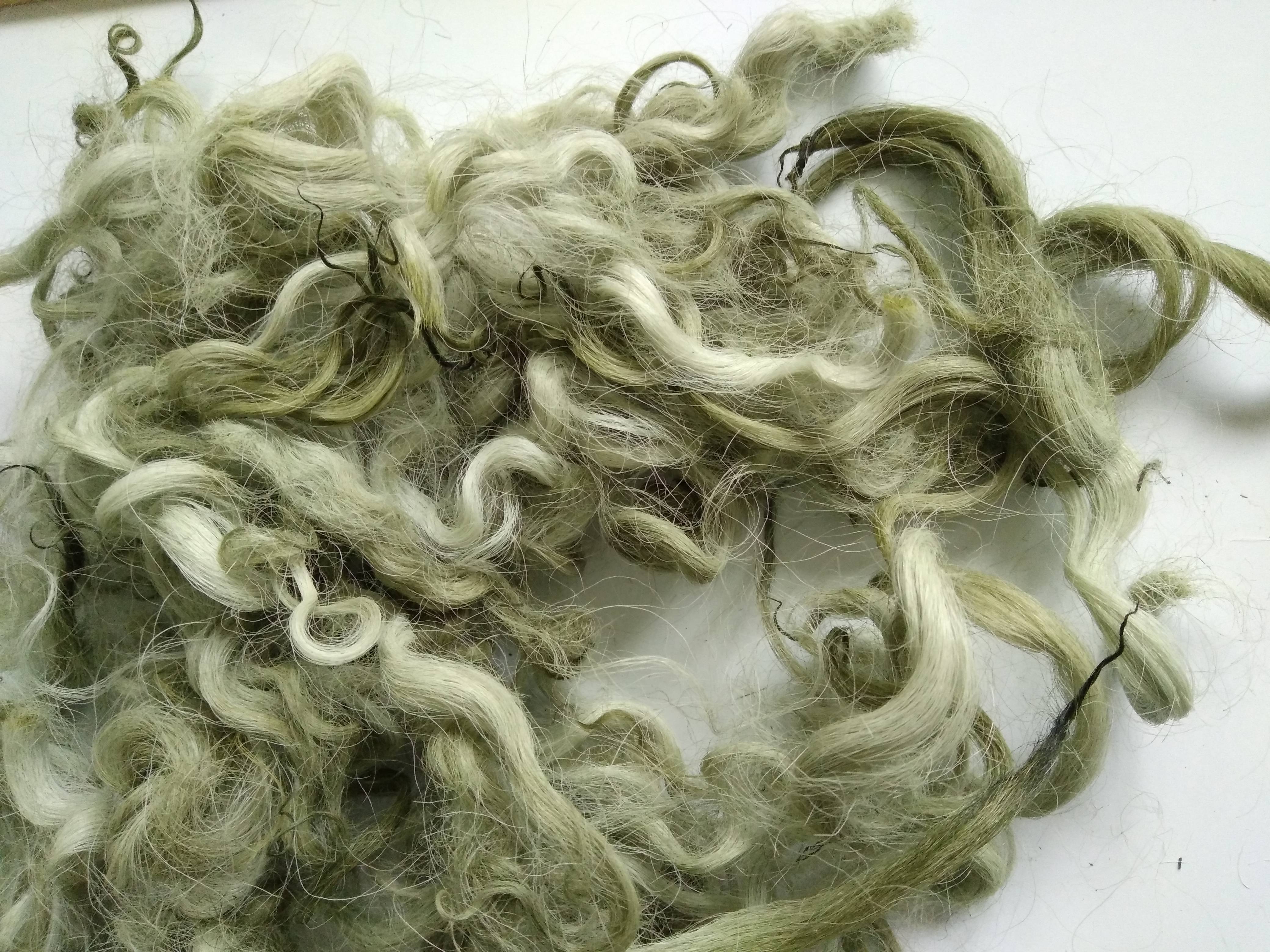 This fibre has been 100% hand processed (very well washed by hand multiple times) and is has been hand dyed in a mixture of moss green tones