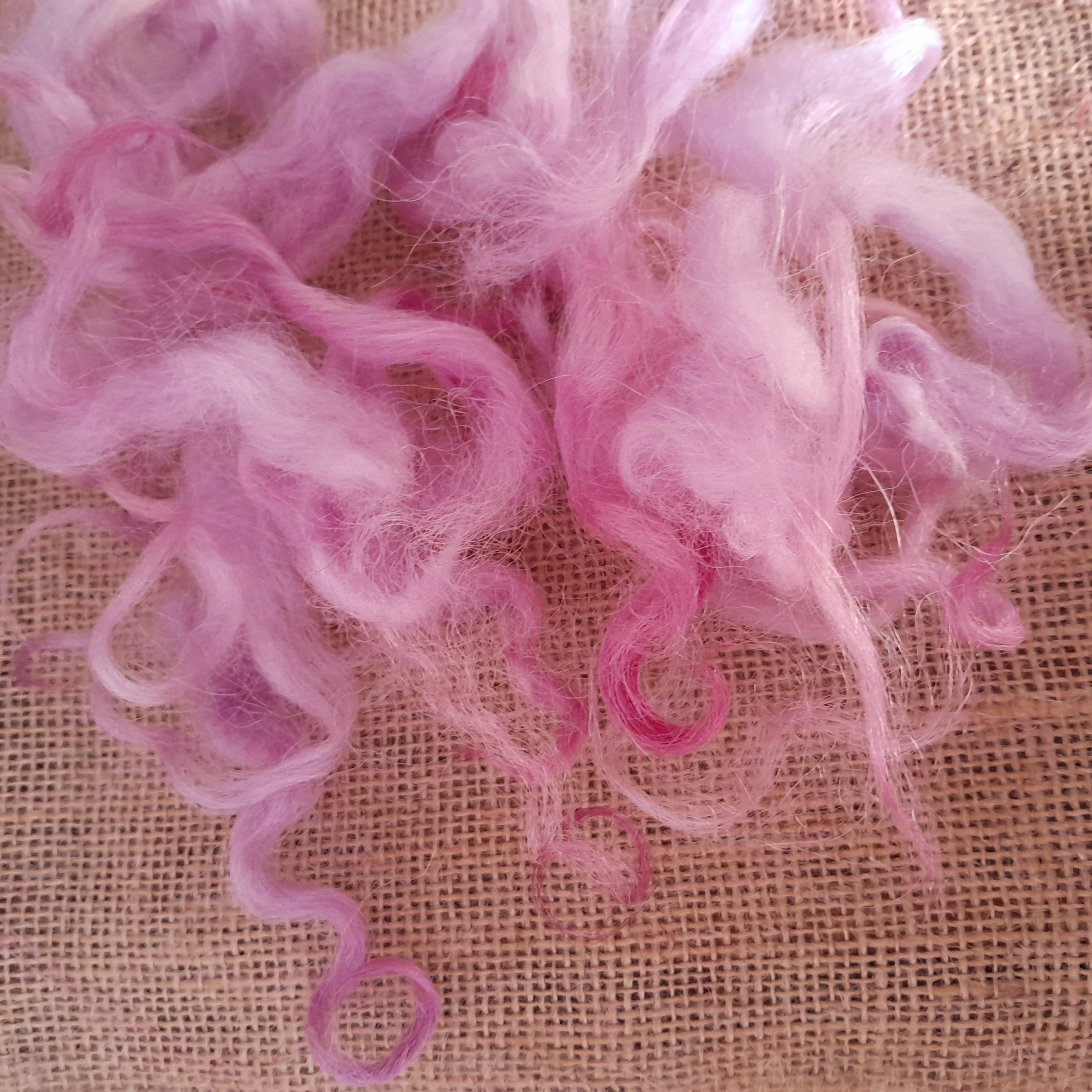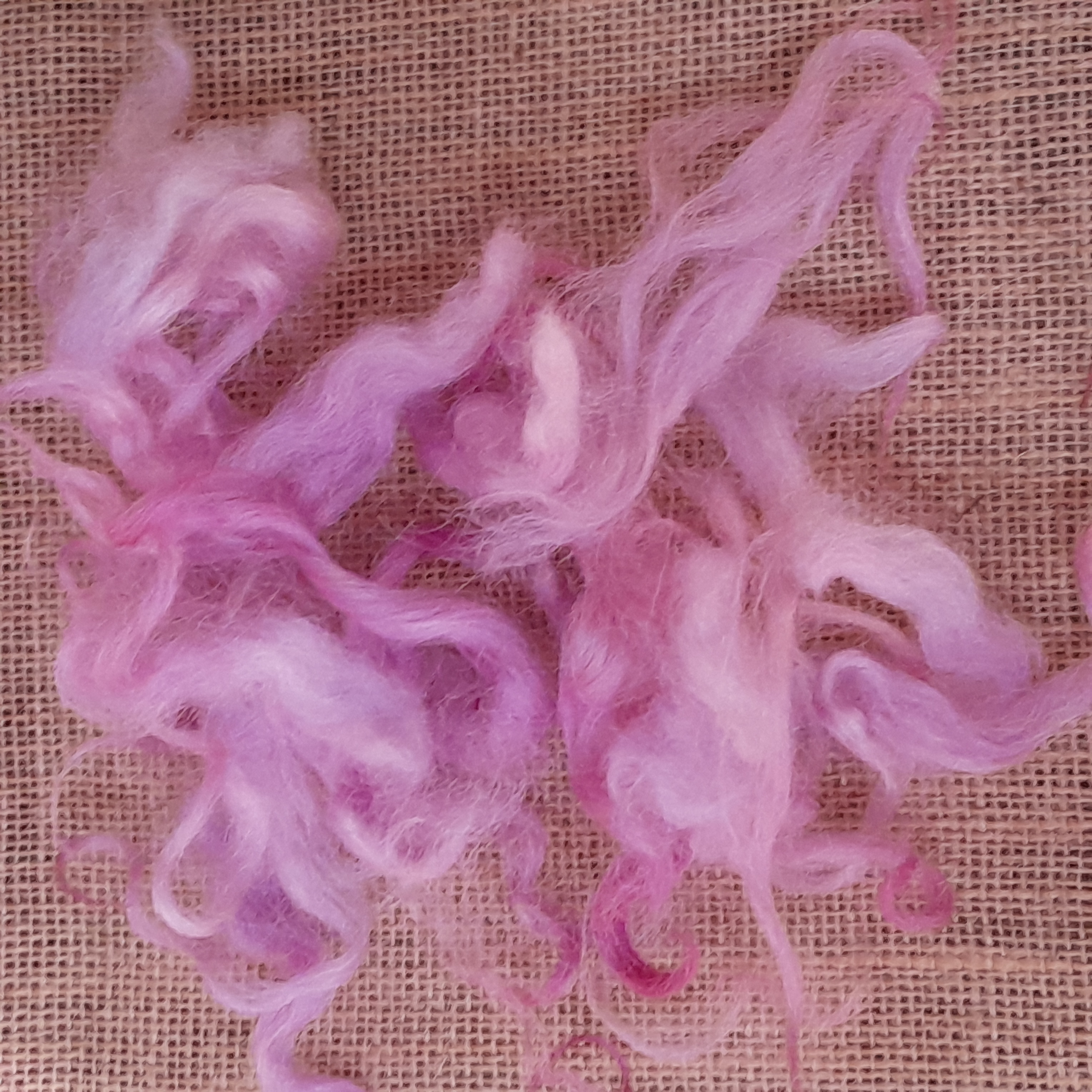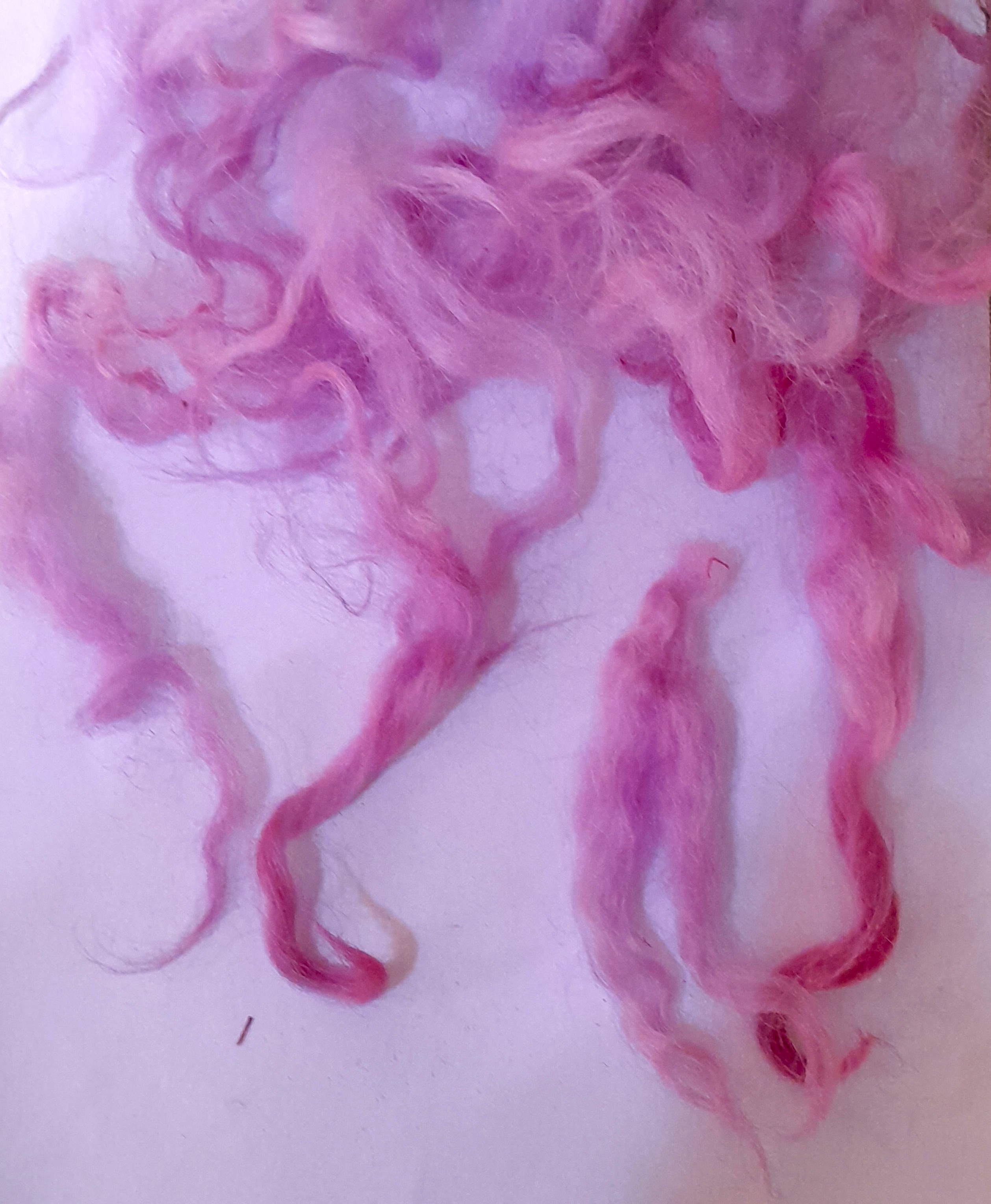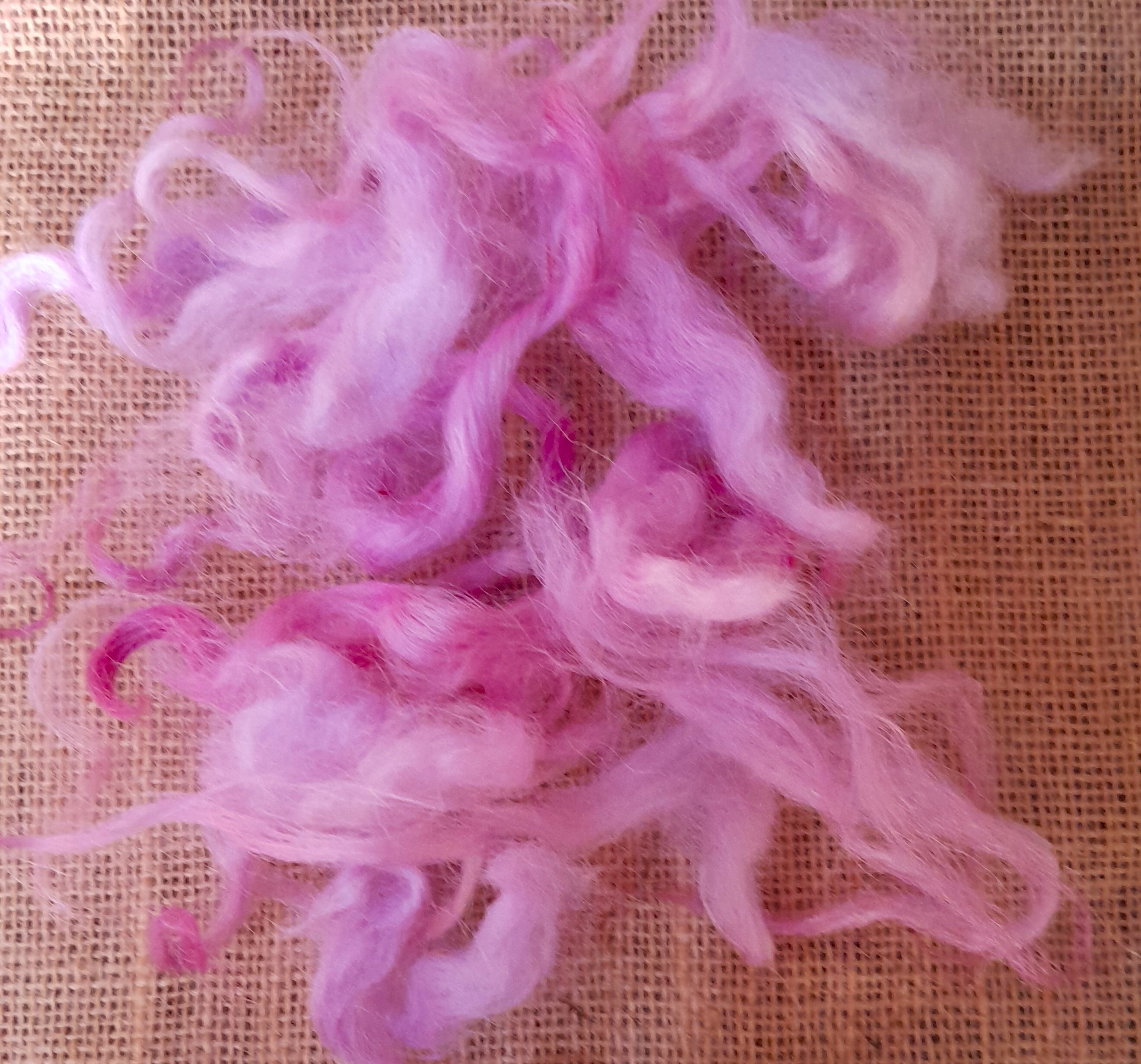 This curly wool has been carefully washed and hand-dyed in a beautiful mixture of varying pink tones, with some purple aspects to depending on the light!