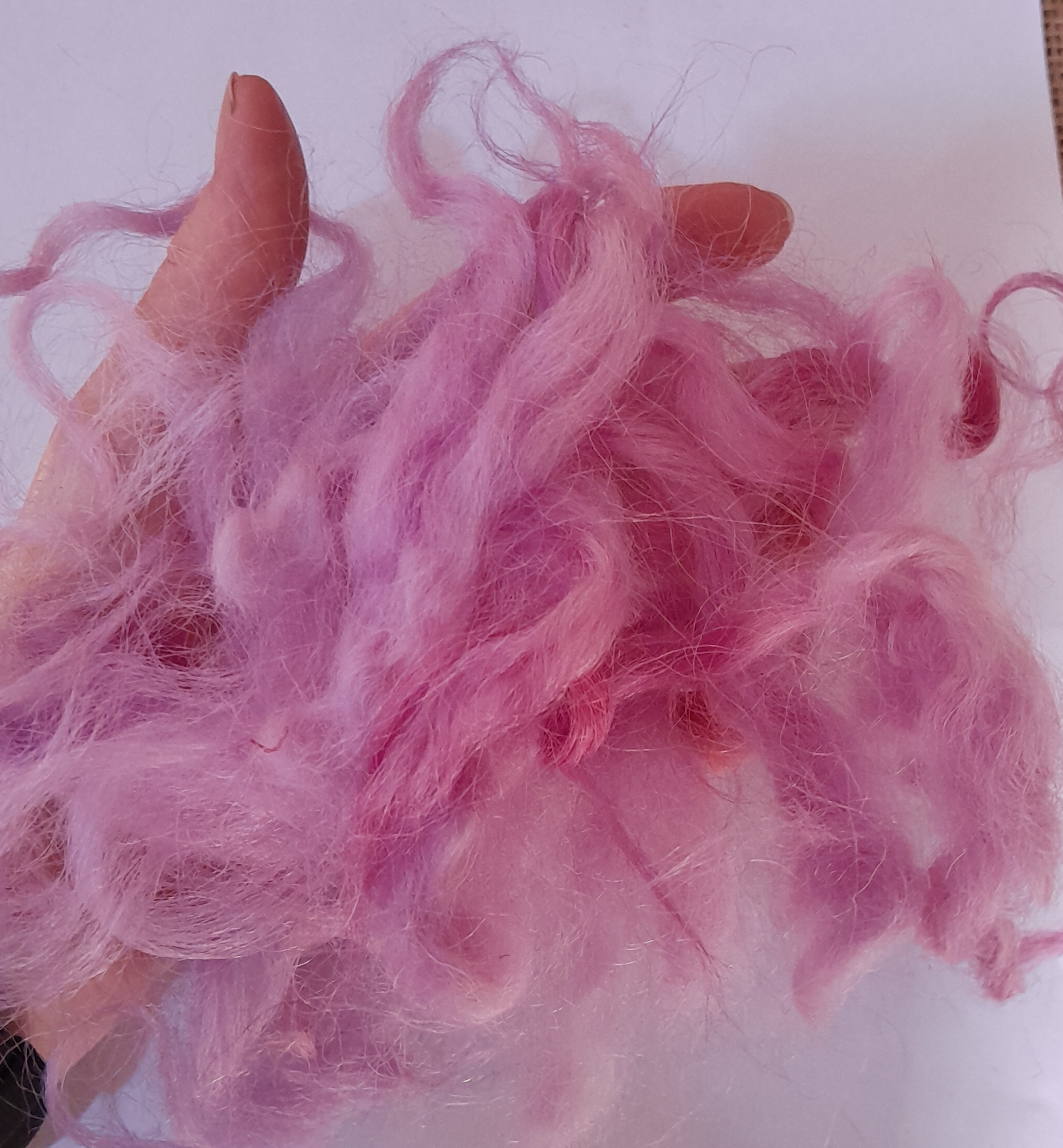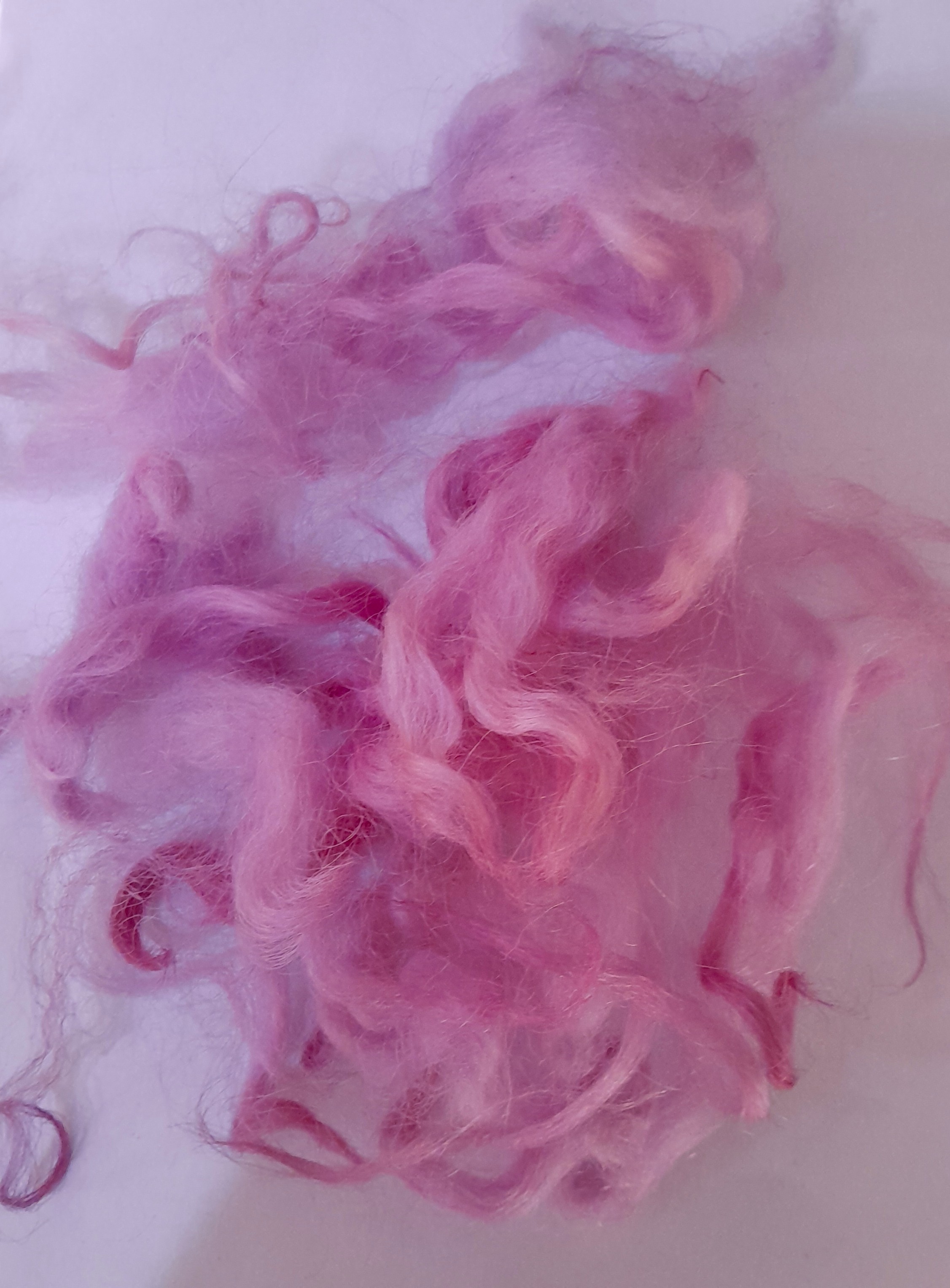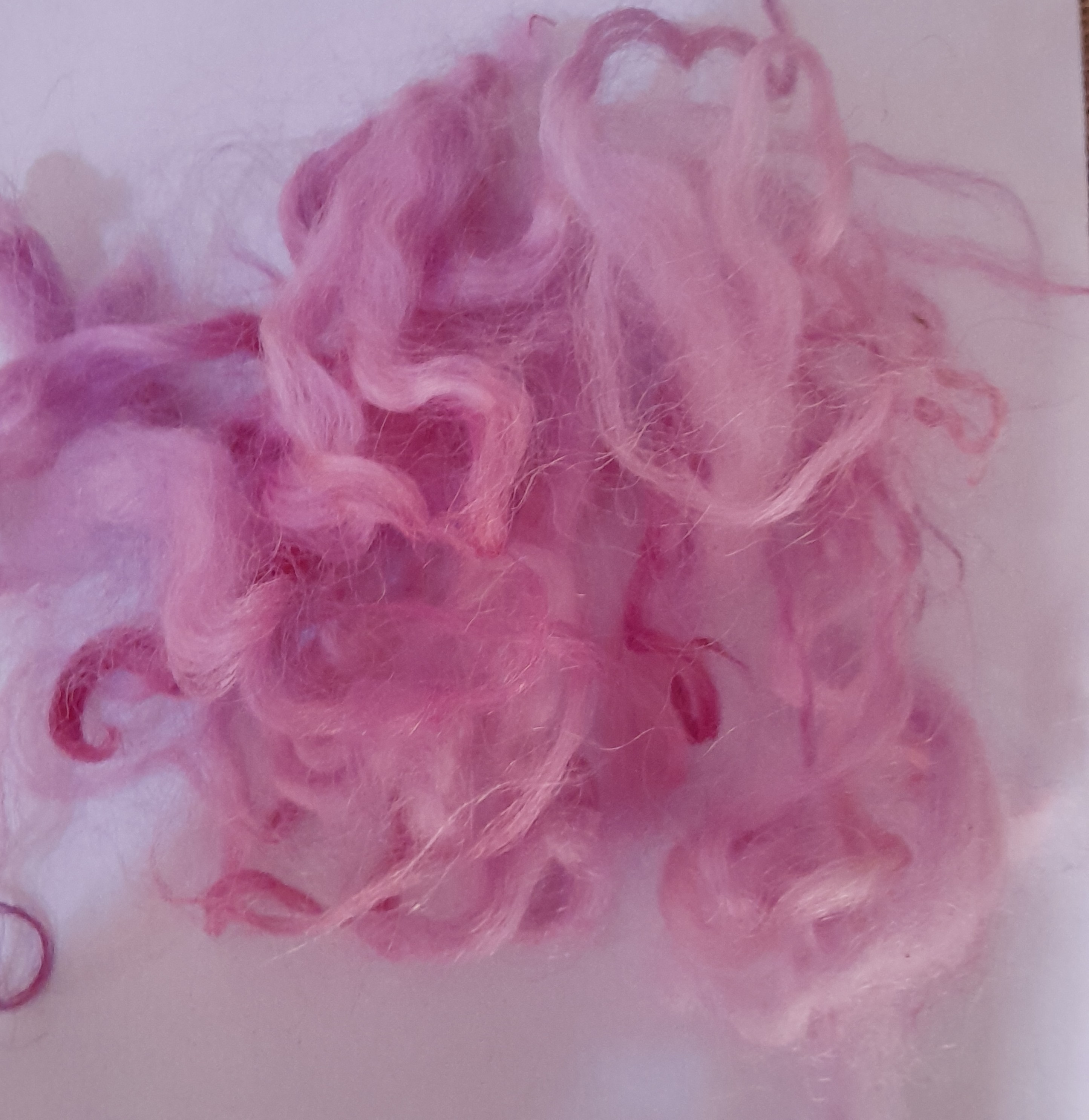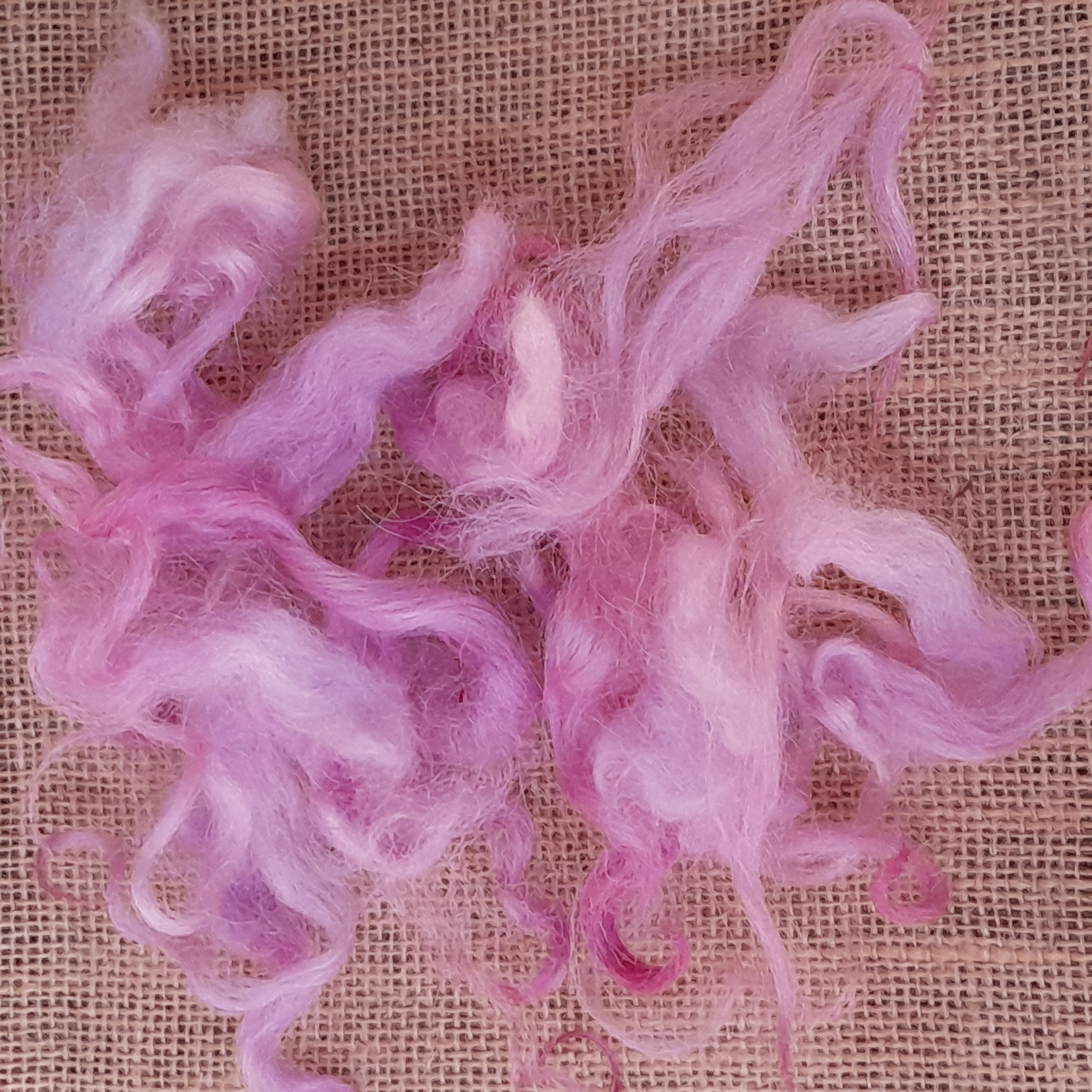 This curly wool has been carefully washed and hand-dyed in a beautiful mixture of varying pink tones, with some purple aspects to depending on the light!