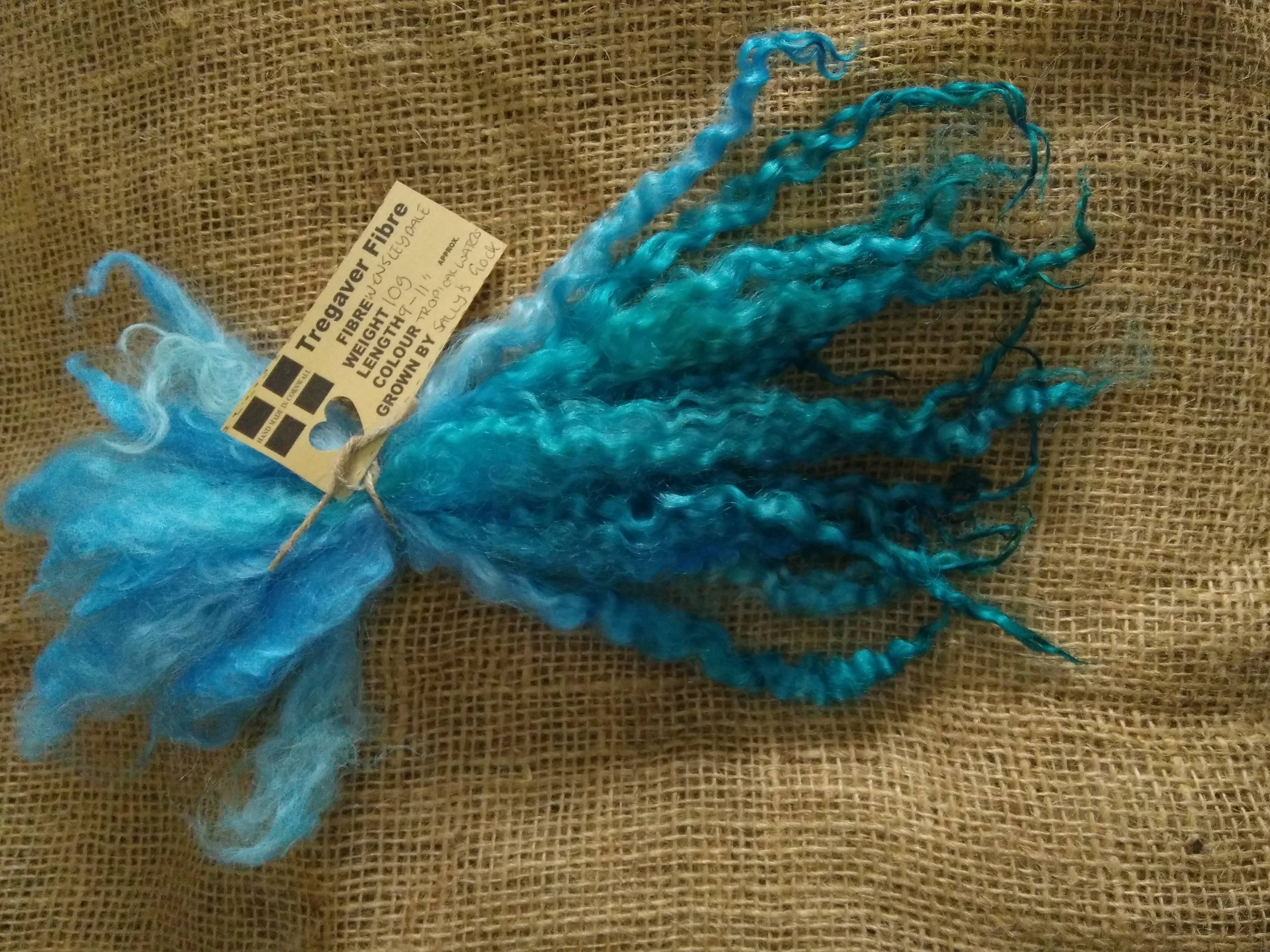 100% hand processed and hand dyed in a wide mixture of blue tones, leading to the name "tropical waters"