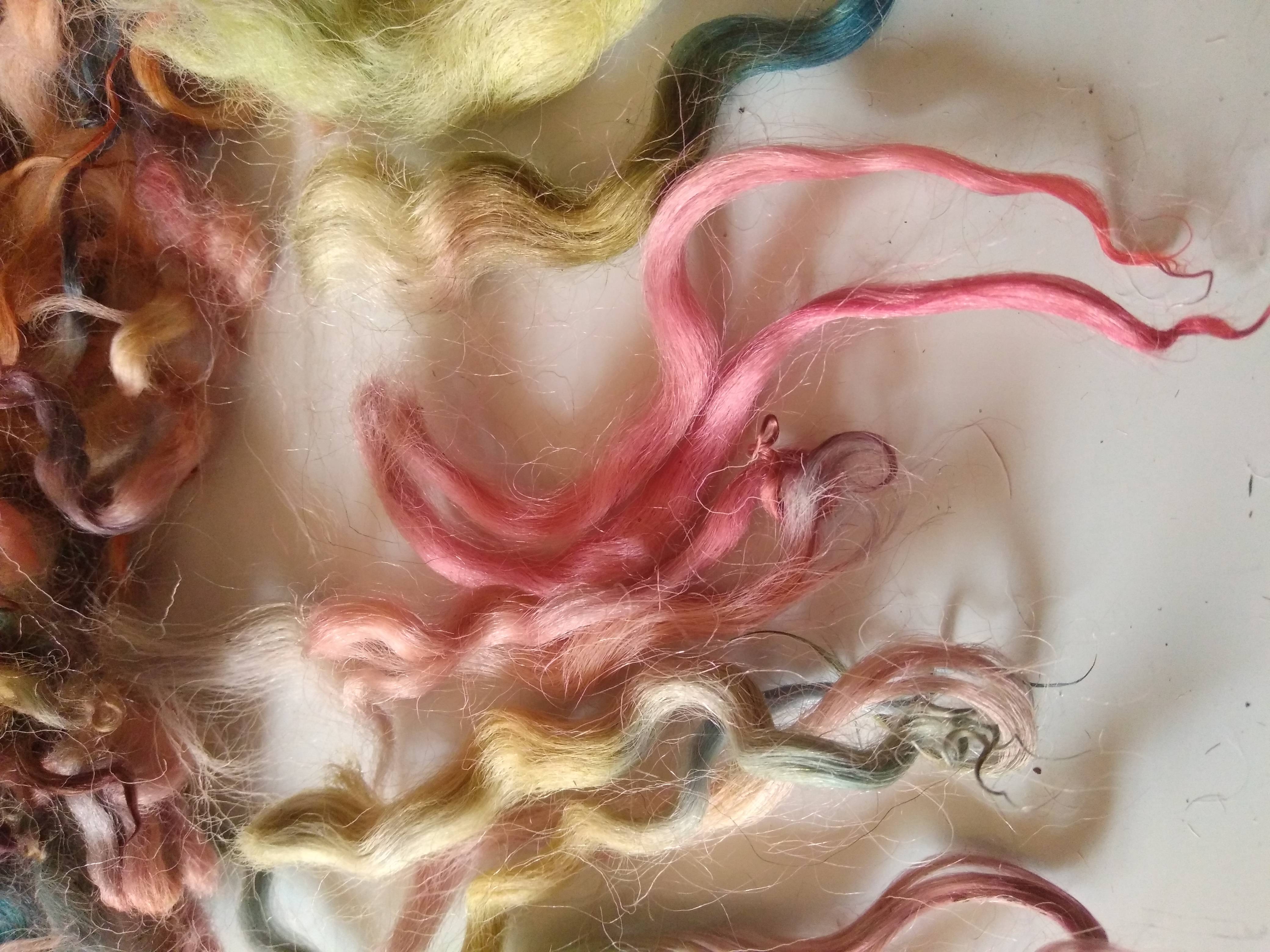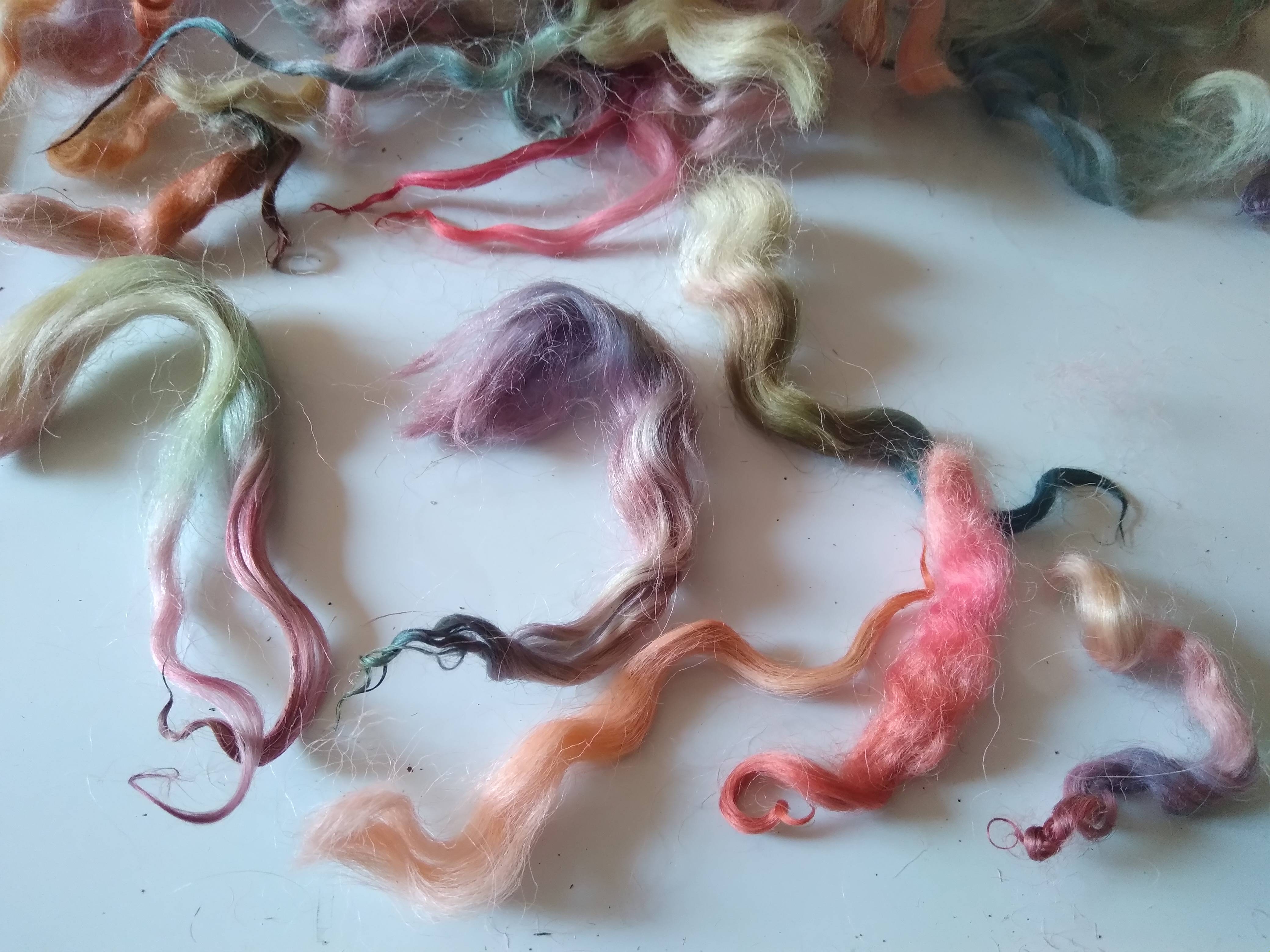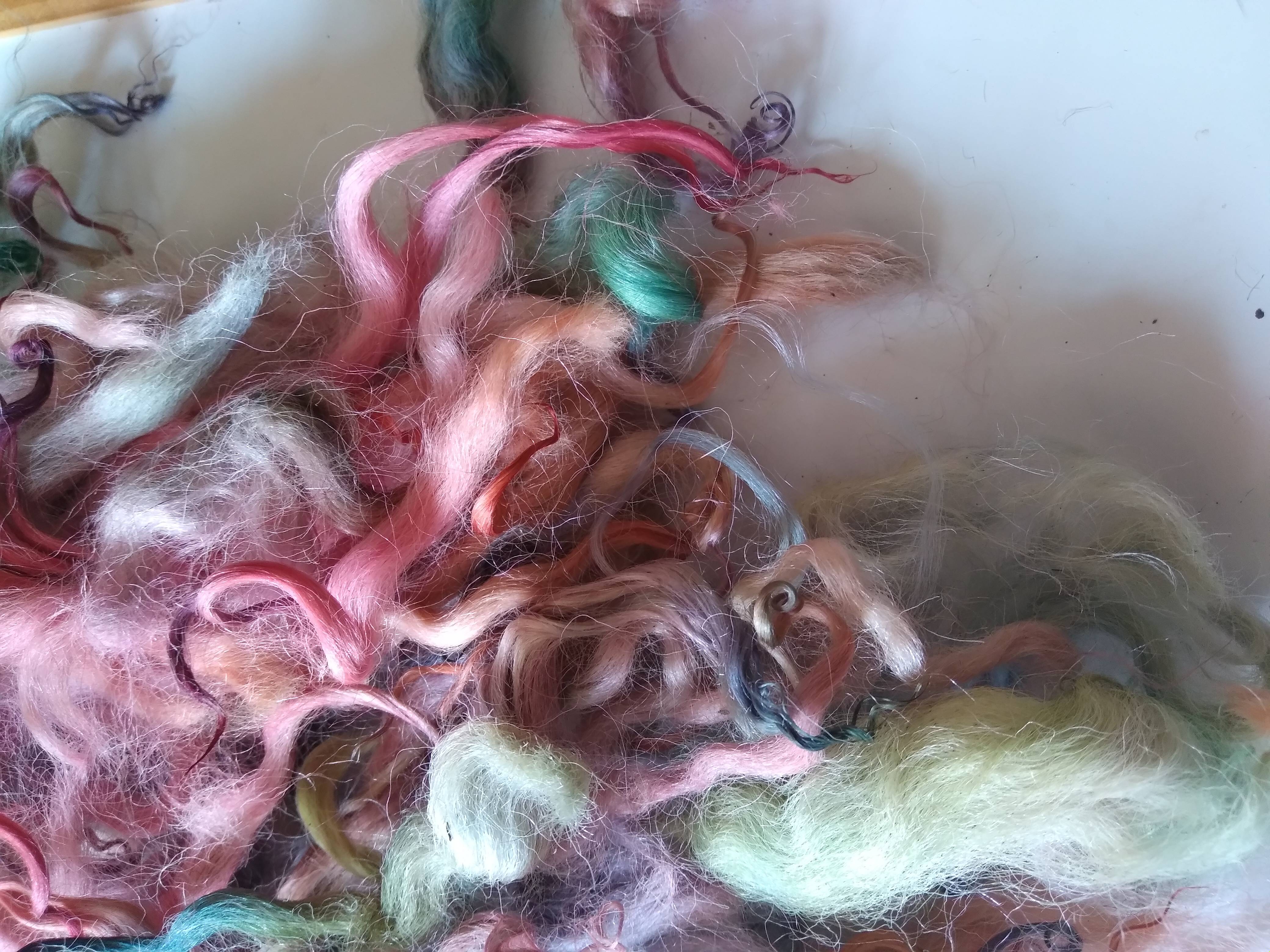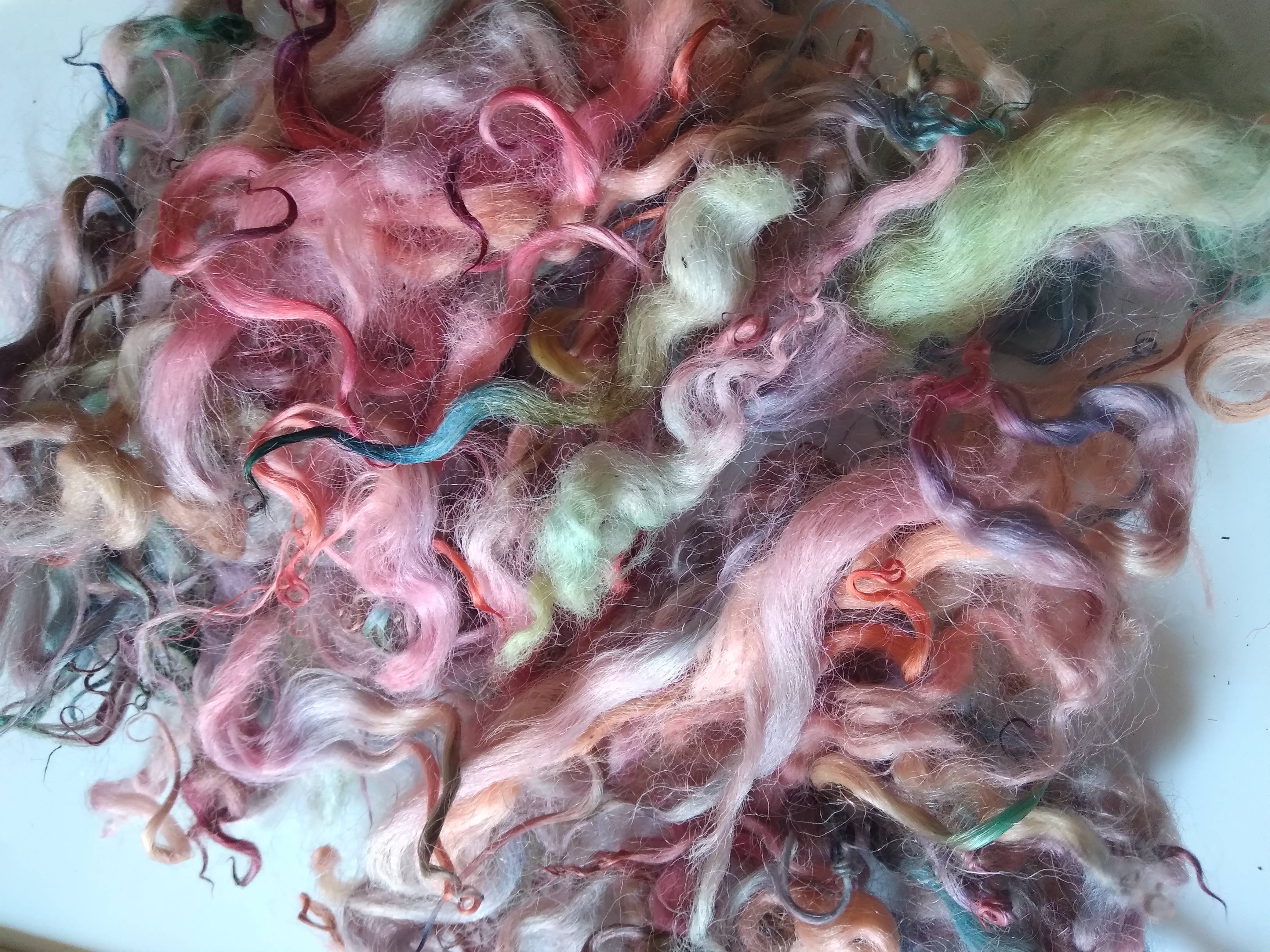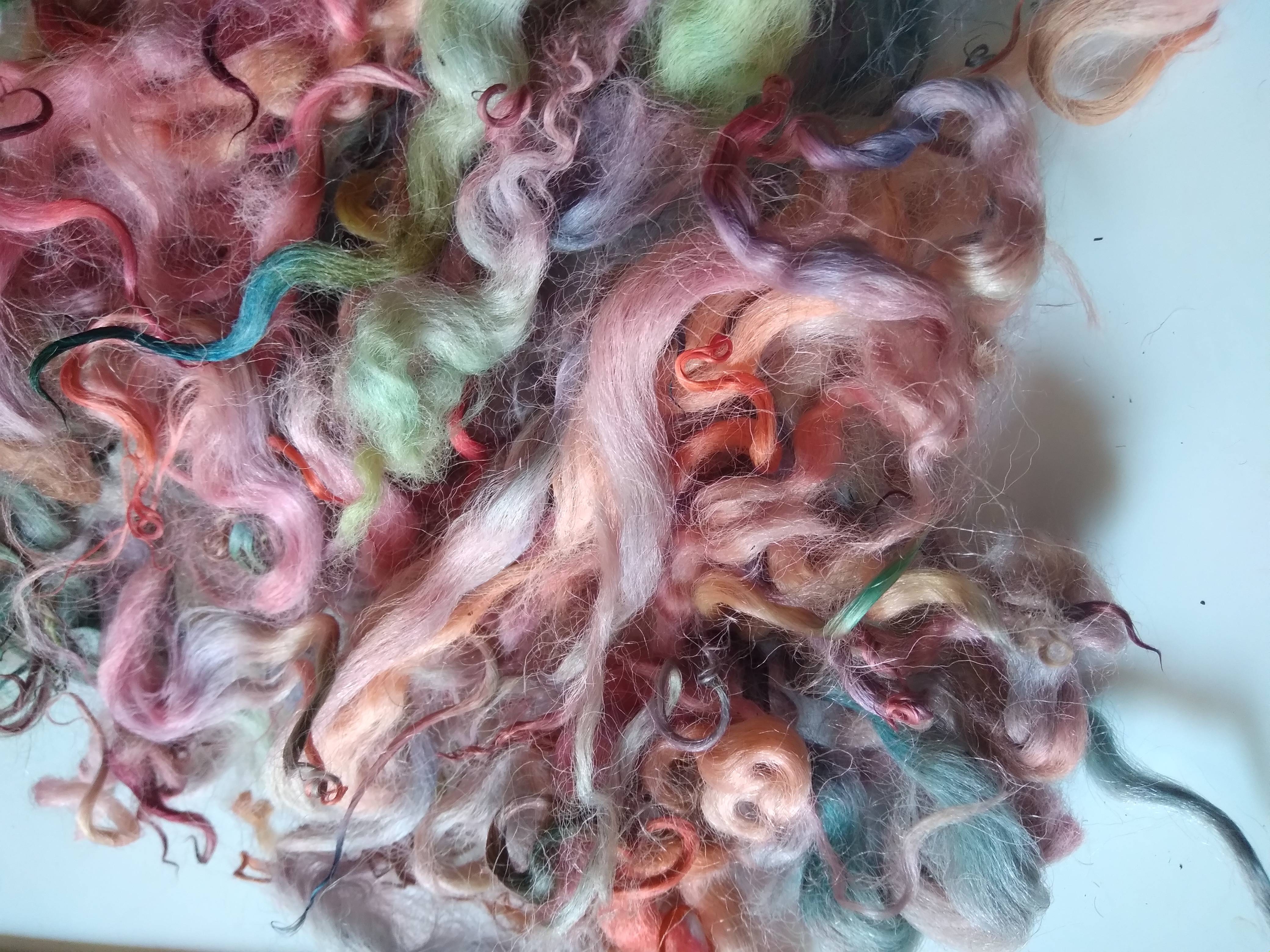 100% hand processed and hand dyed in a themed mixture of bright and light rainbow tones, this is White Faced Dartmoor lamb fibre, with a staple length of around 3 to 6 inches to be found in the batch.
