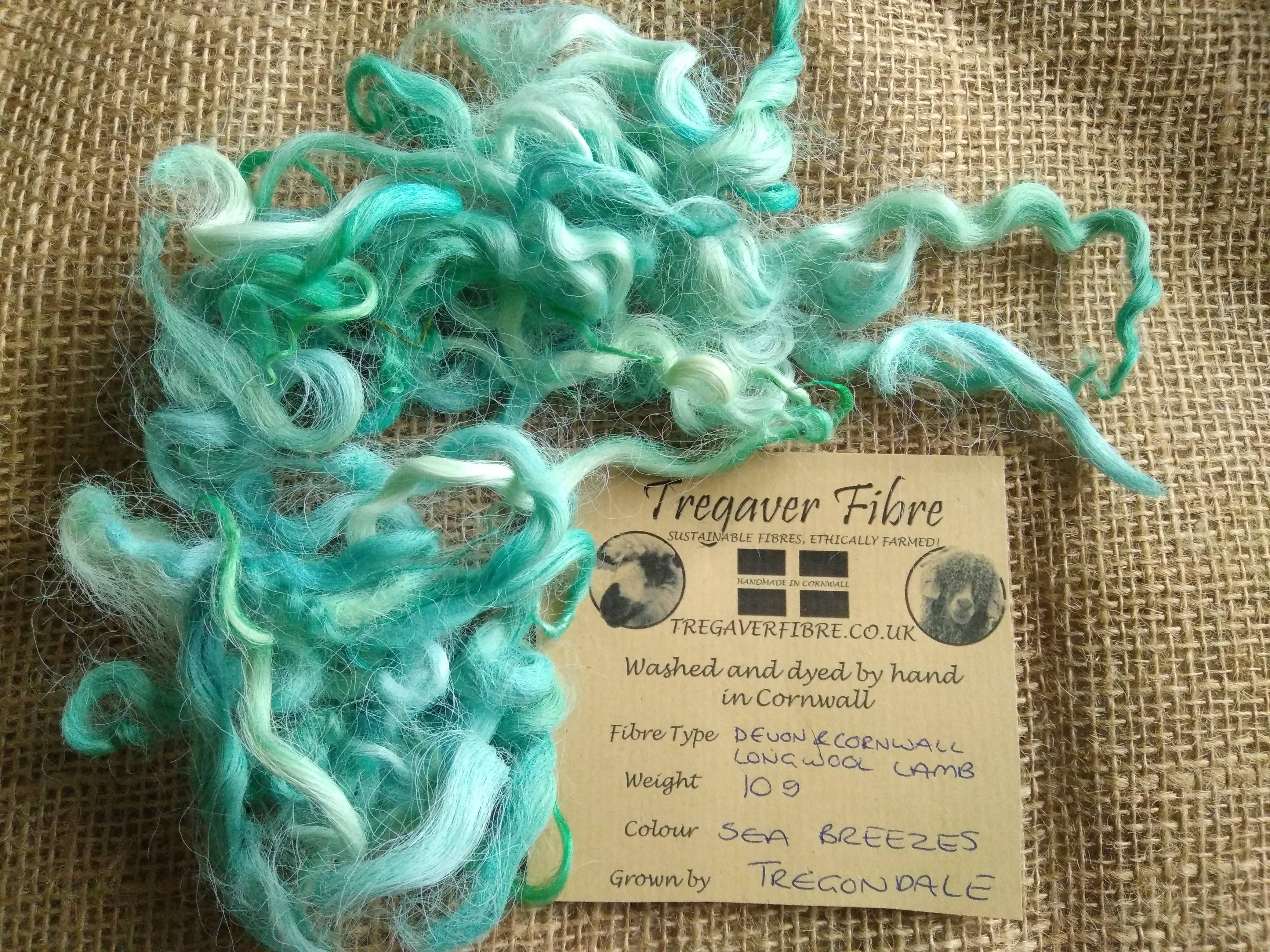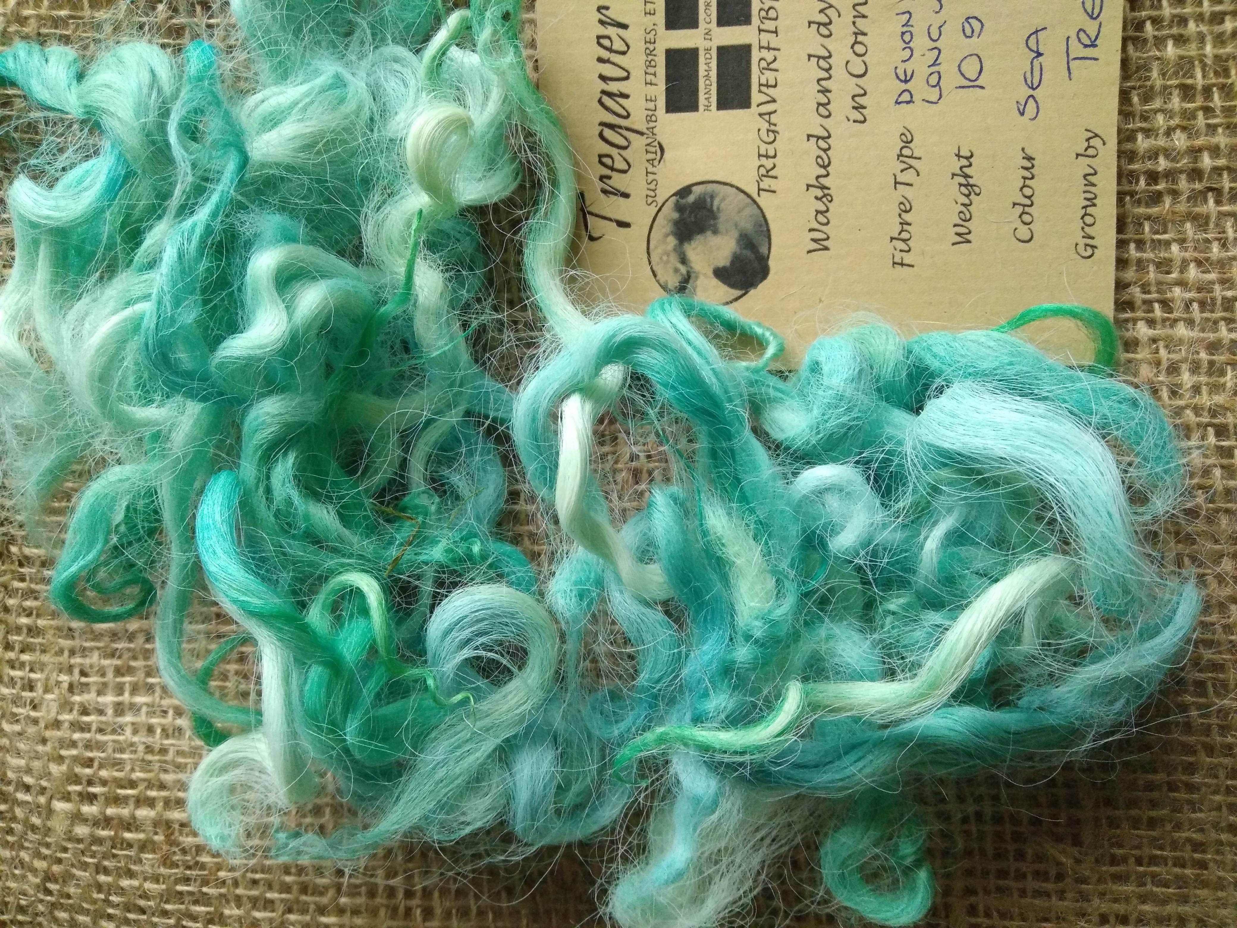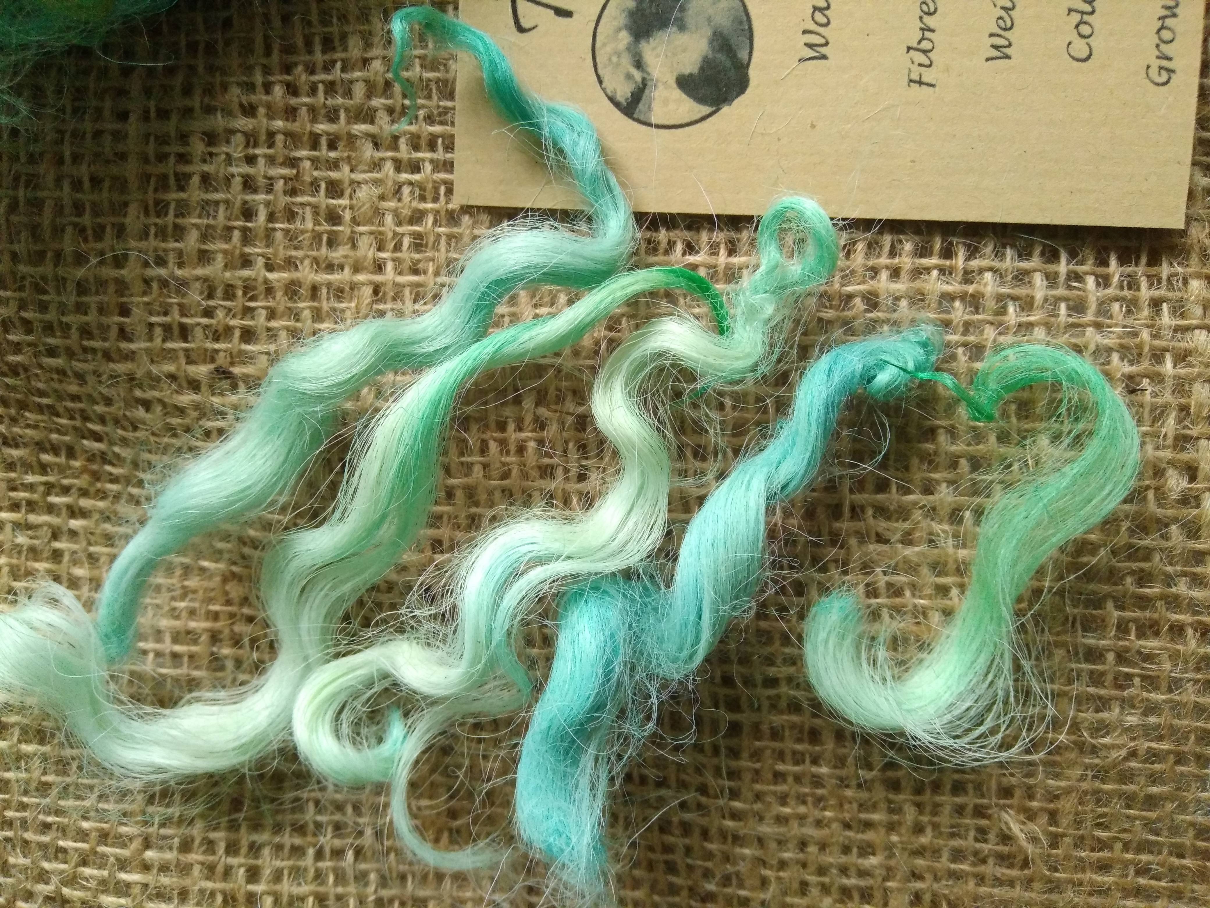 This fibre has been 100% hand processed (very well washed by hand multiple times) and is has been hand dyed in a mixture of blue green and teal/ turquoise tones