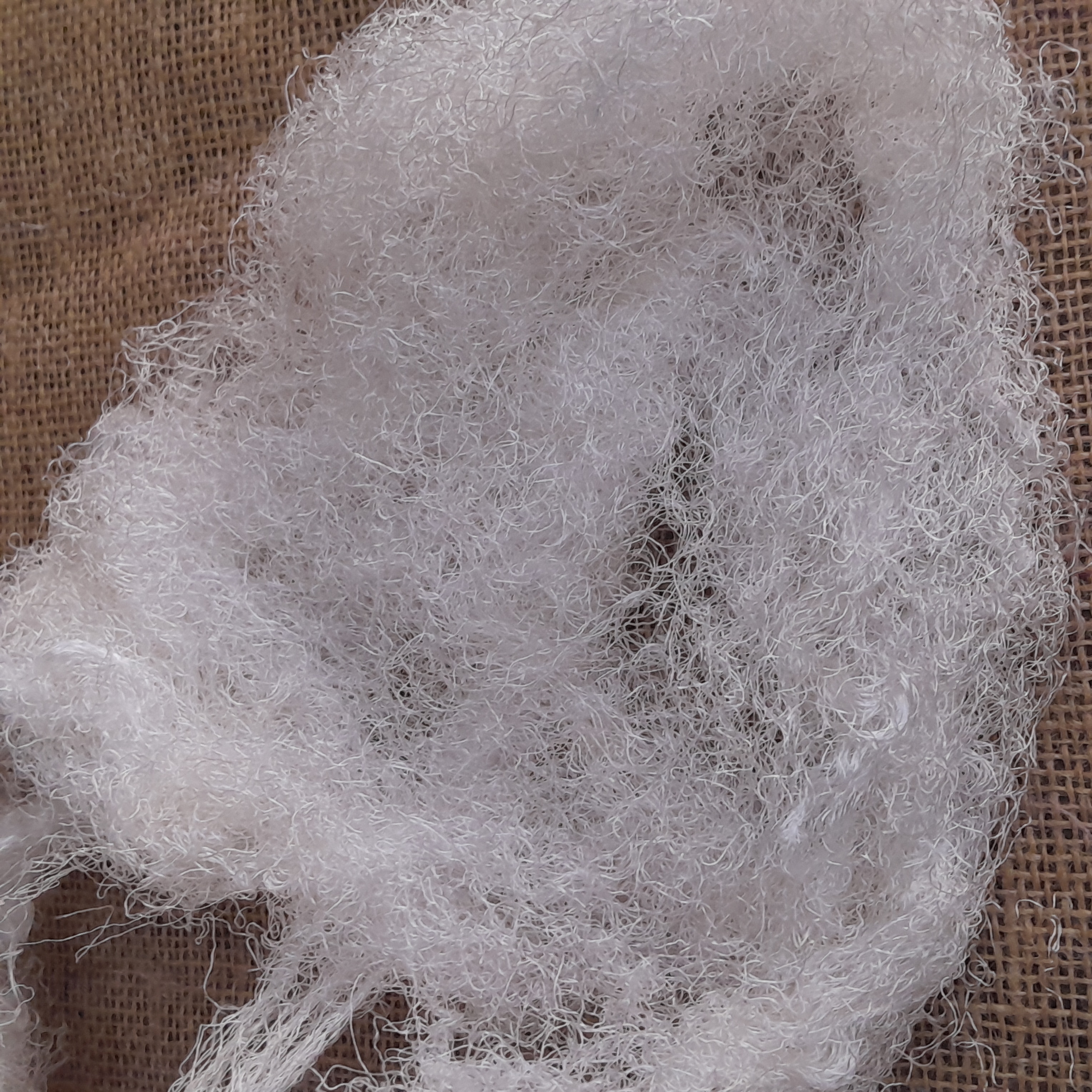 The texture includes varied fibre lengths (staples) and thicknesses - because it's a by prodcut , it is irregular, and the variations in fibre length, texture, and density give it a very desirable characteristic for something a 'bit different'. Perfect for all types of fibre artists who enjoy organic texture and hands-on experimentation.