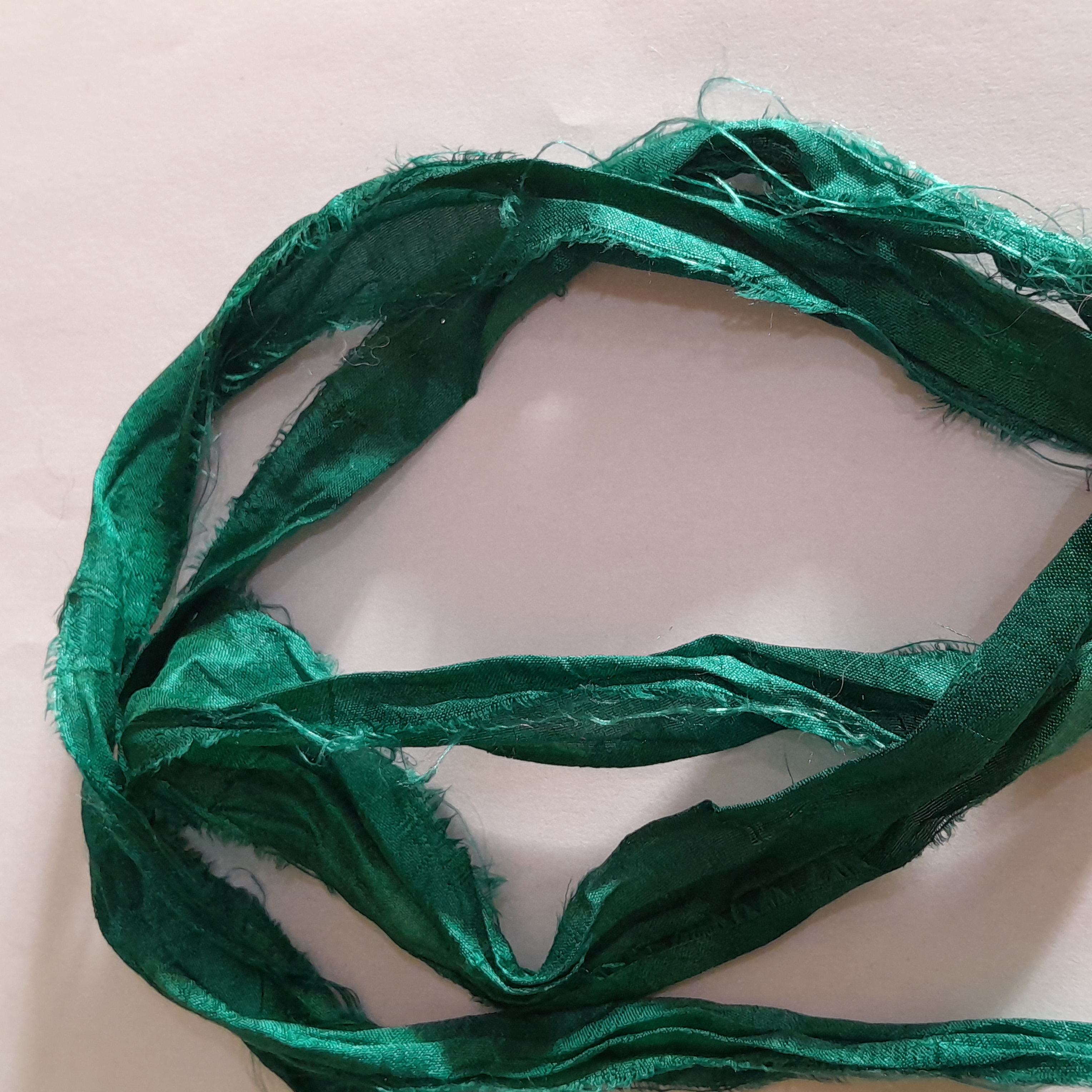 Introducing our stunning Recycled Sari Silk Ribbon, hand-dyed in a beautiful Fern Green with mixed tones that will add a touch of nature to your creative projects!