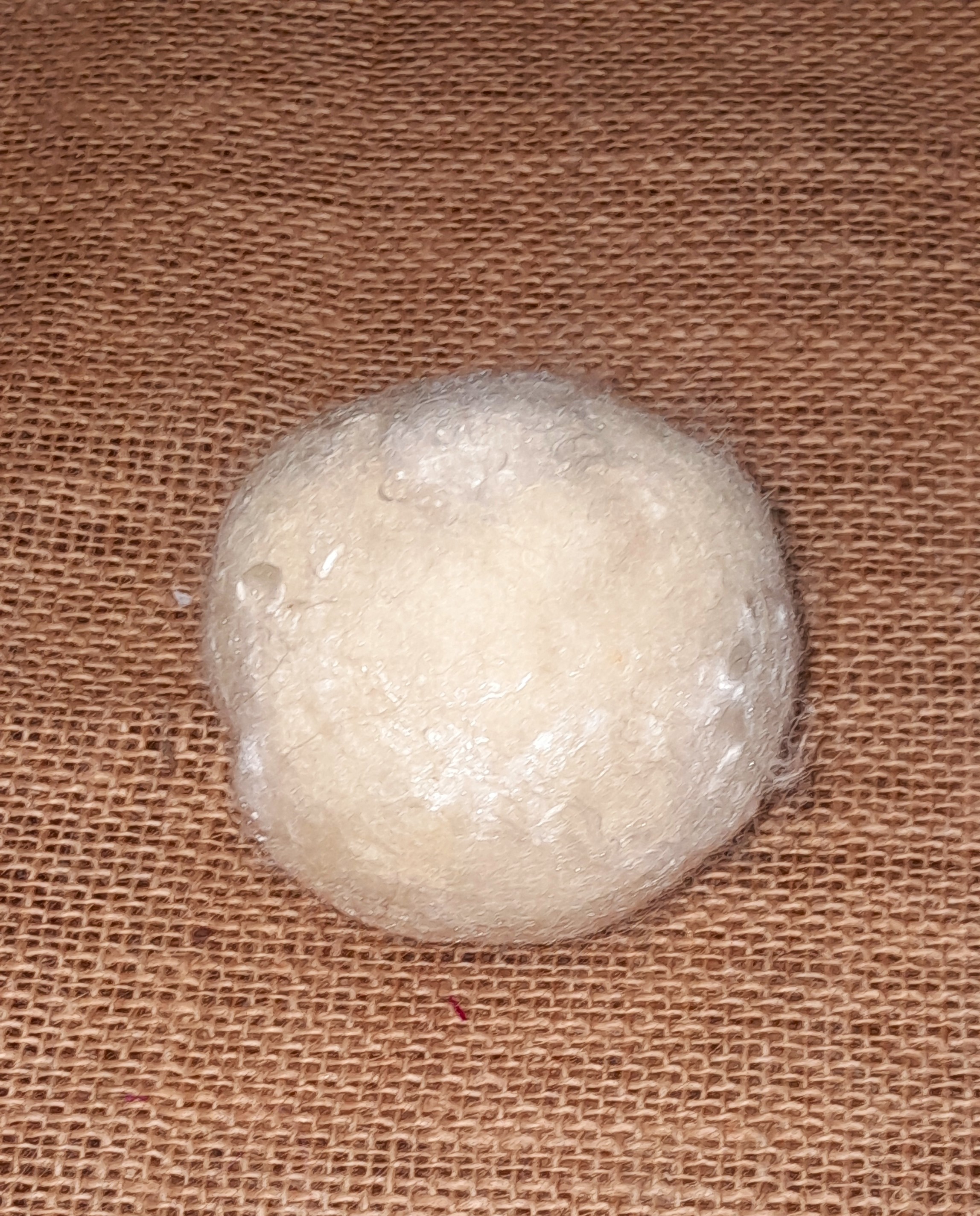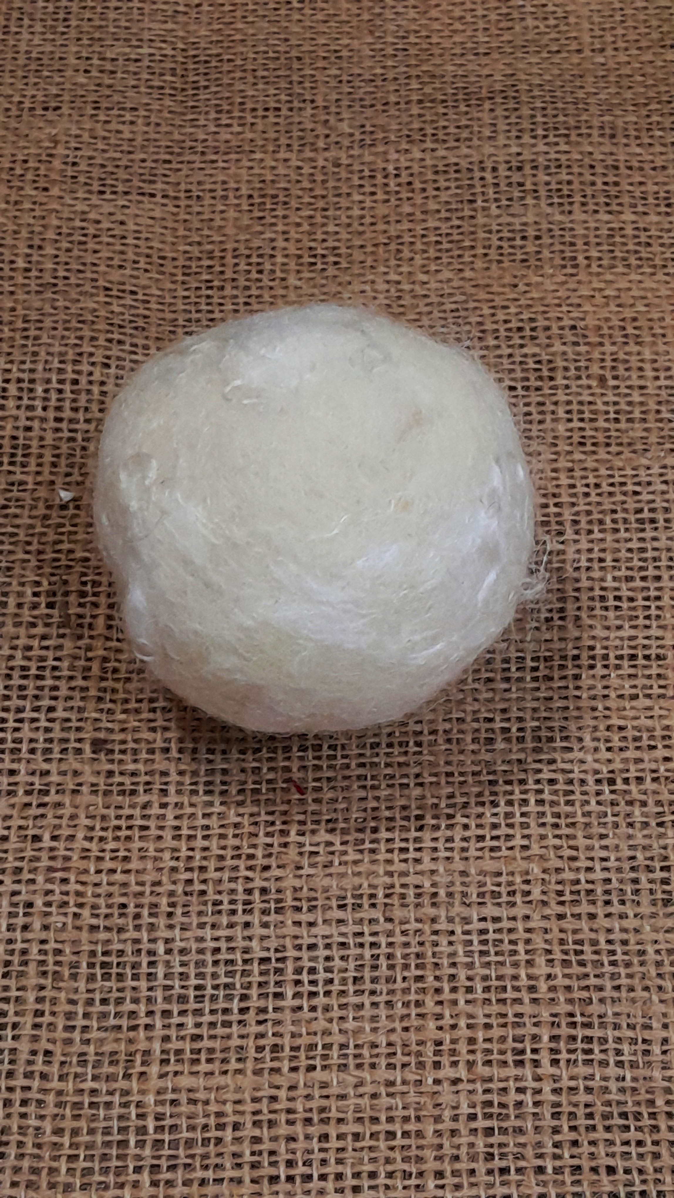 These wool balls are cleaned, rolled and felted here at Tregaver Fibre, with Perendale fibre from our friend Hannah's flock, some of our own Devon and Cornwall Carded Wool, and a touch of lyocell to add a snowy shimmer!