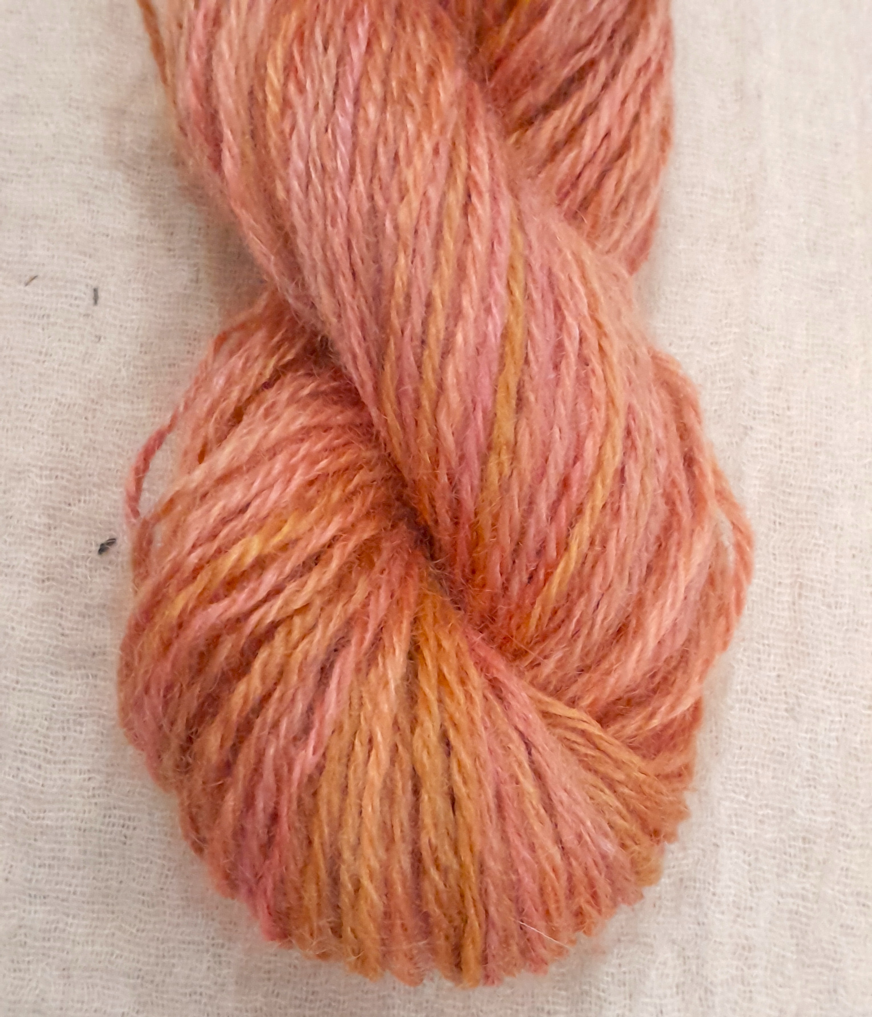 It was then hand dyed in a varied mix of golden peach, orange and pink tones