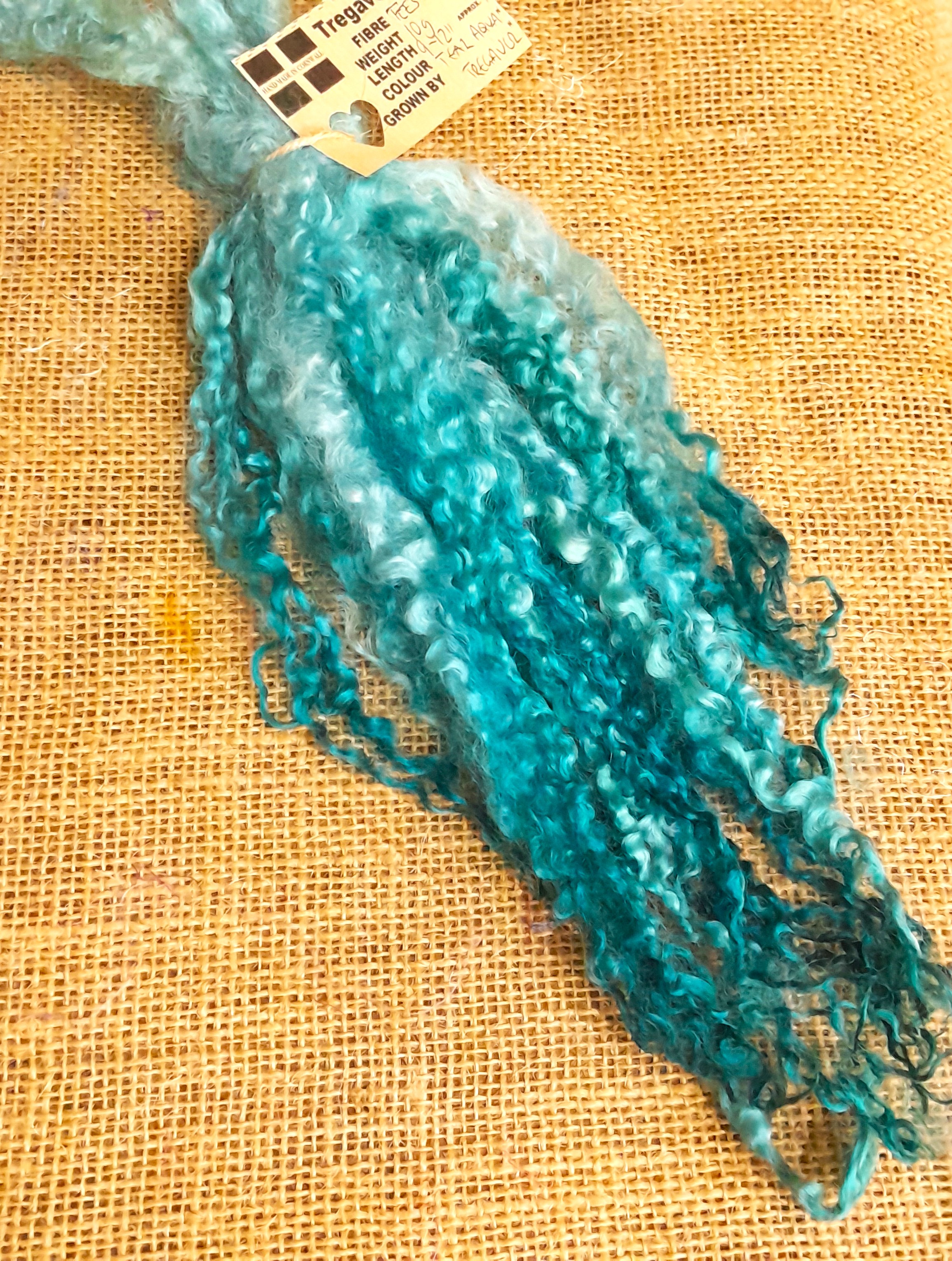 Our Teal and Aqua Teeswater locks come in a 10g bunch of beautifully curly wool, sourced from our own non-slaughter flock.
