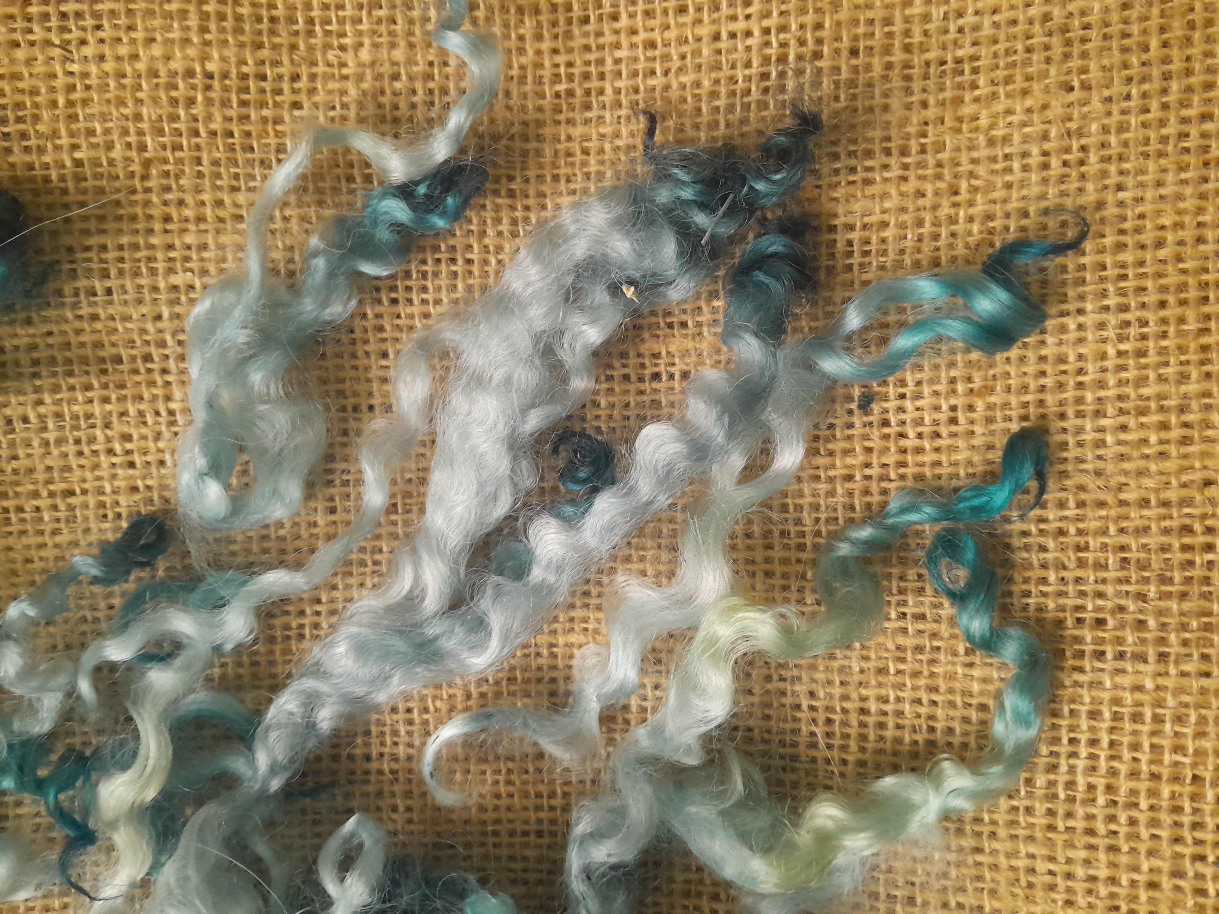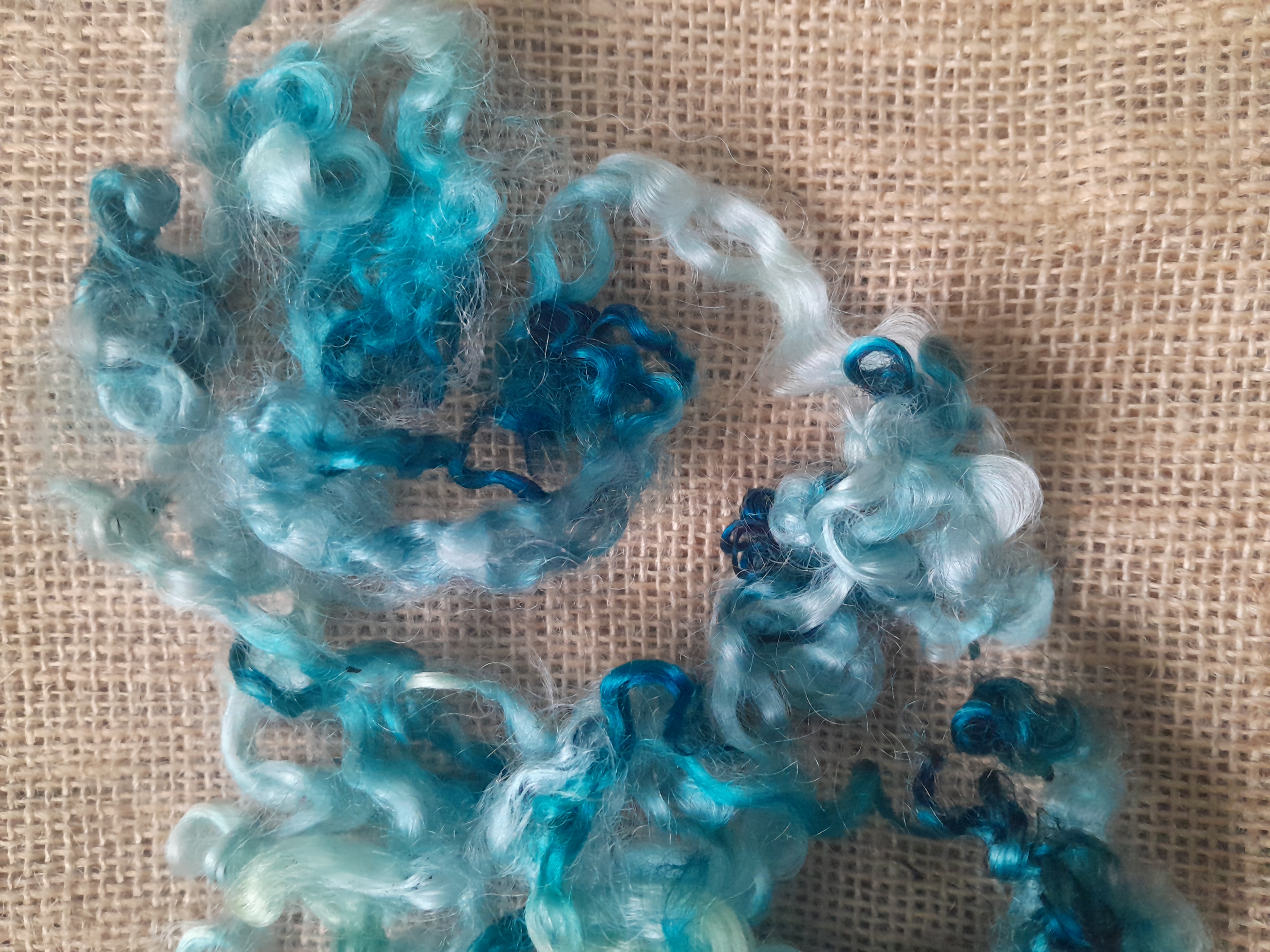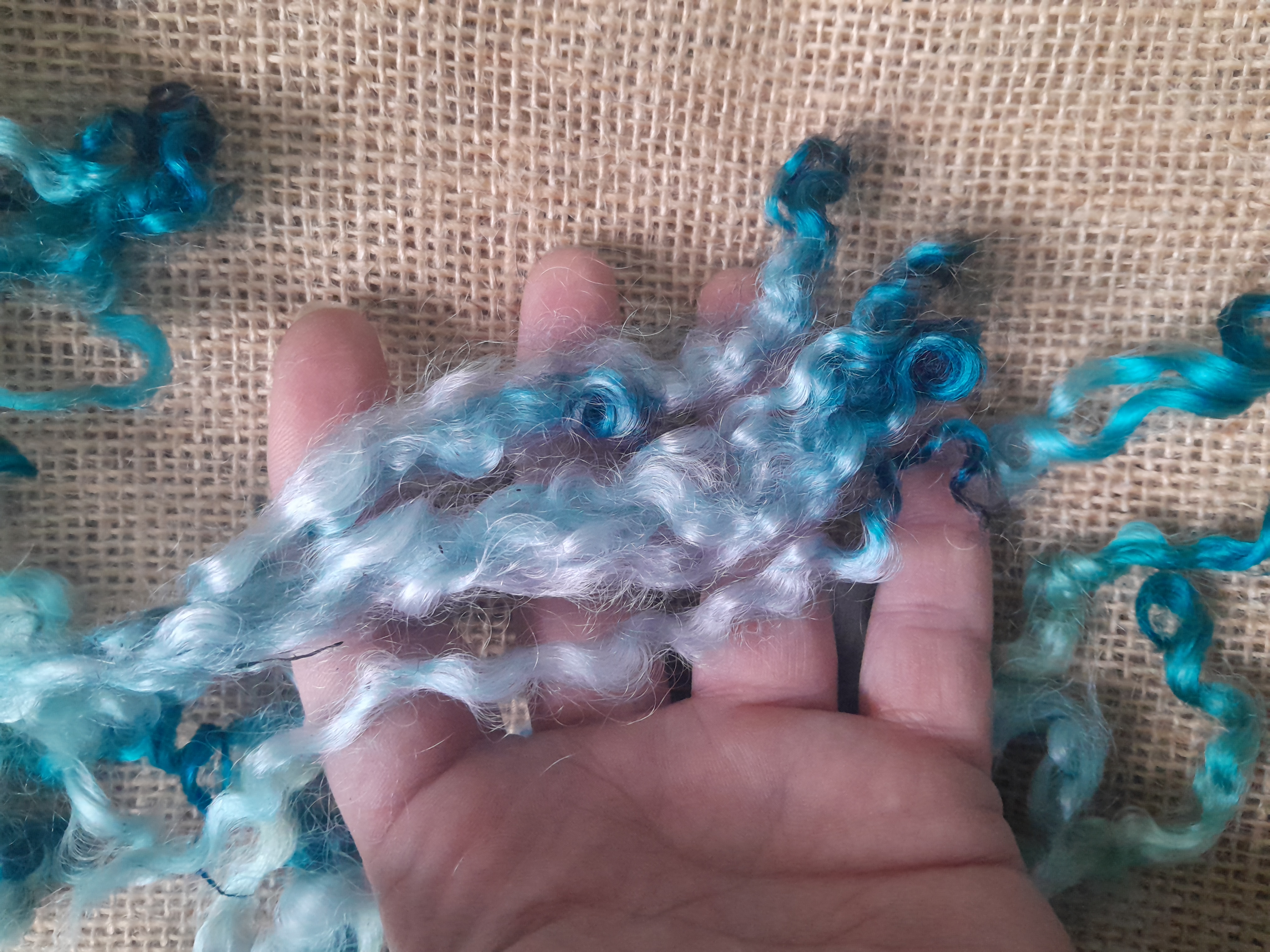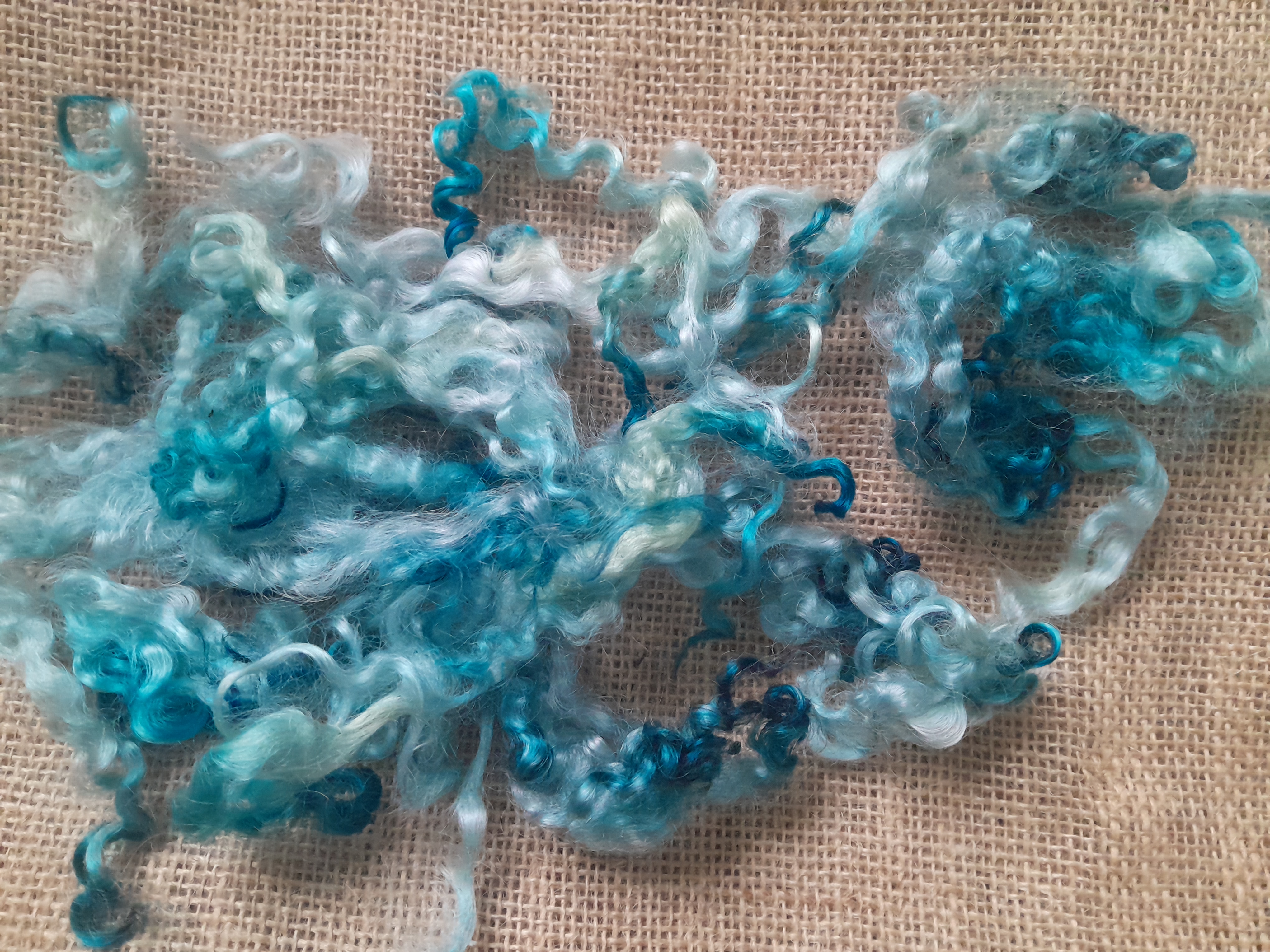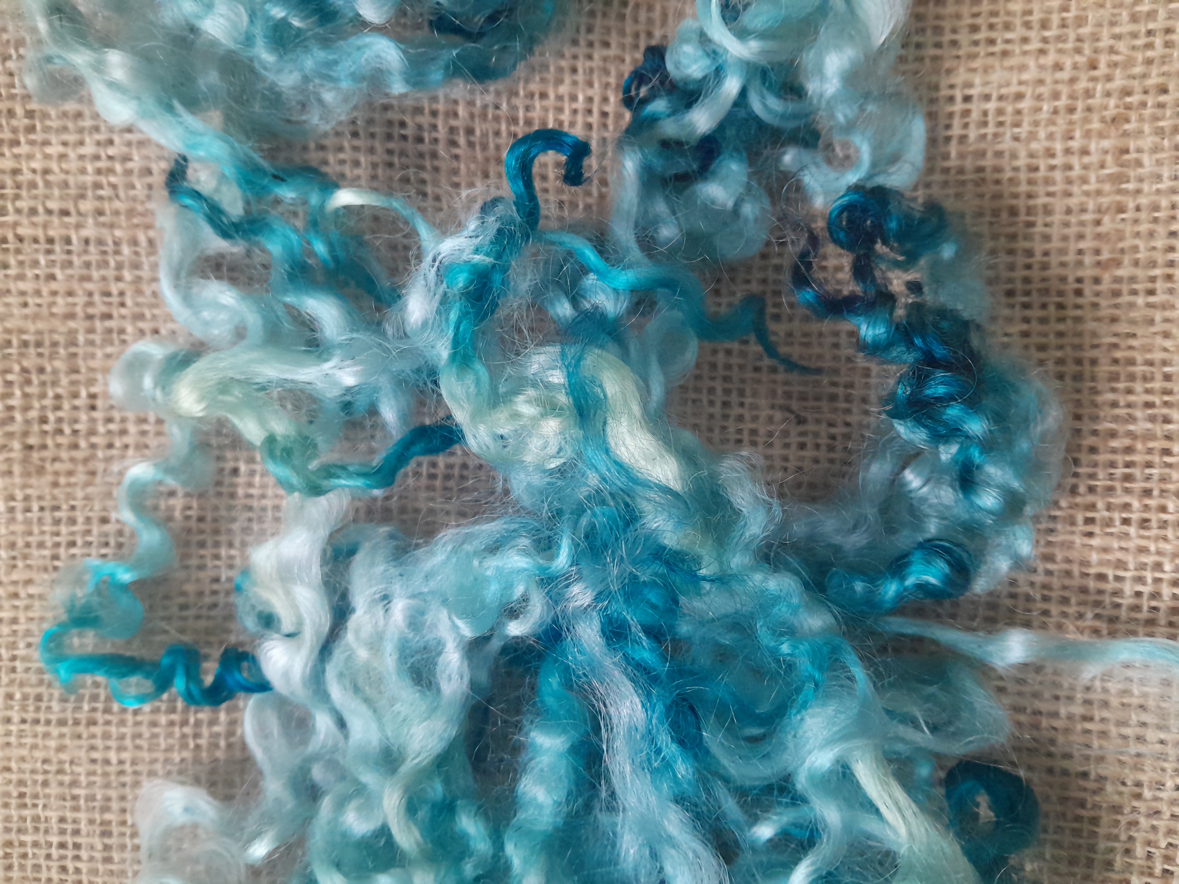 The wool is has been hand dyed in a mixture of teal and aqua tones, with some silvery highlights and some green aspects too