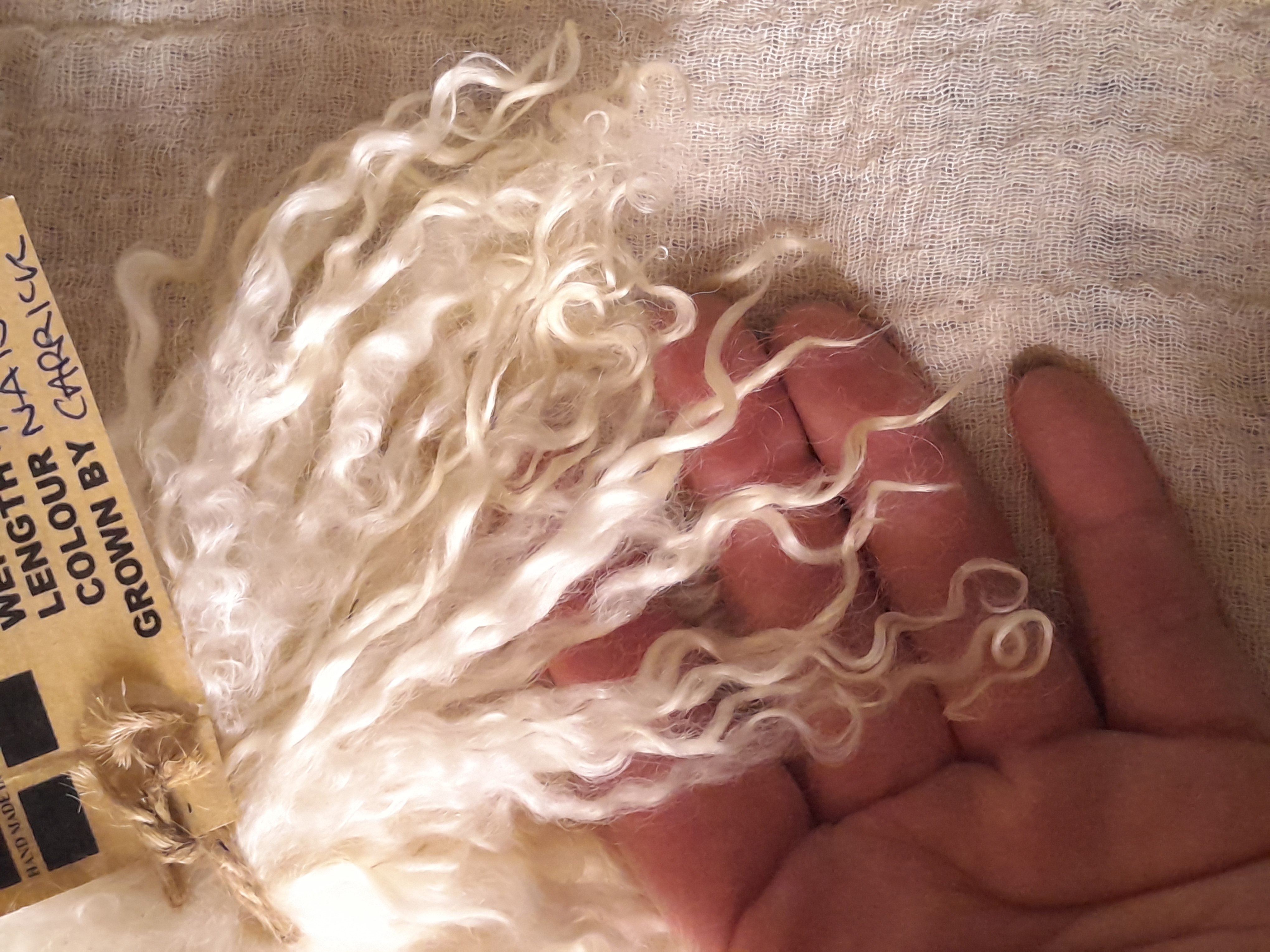 These ringlets are approx 4-6" inches although some may be a touch shorter or longer. This fibre comes from our own flock! Carrick has a shorter, wavier fleece than some of our other flock, so these ringlets have a beautiful wave, rather than a tight curl.