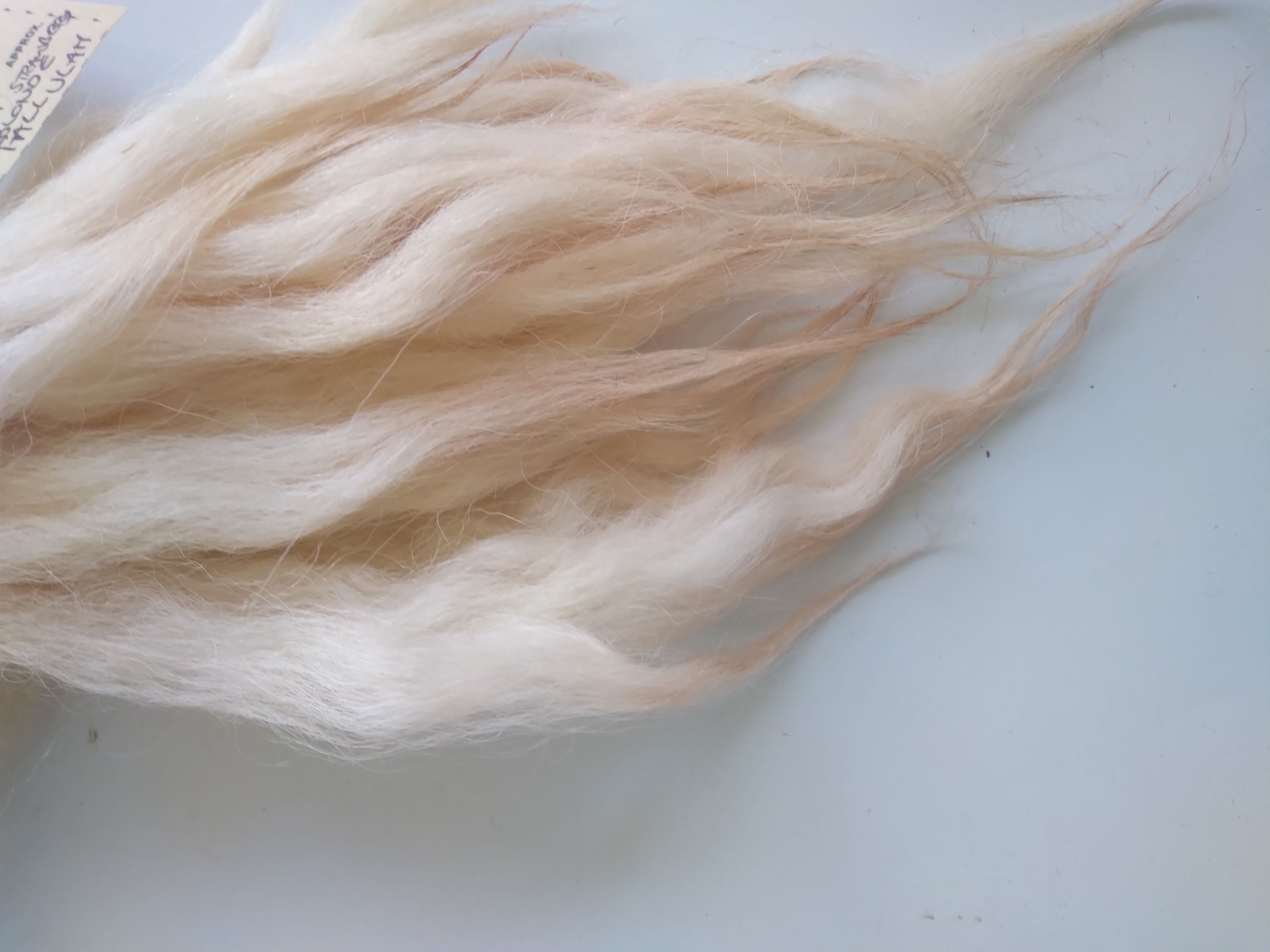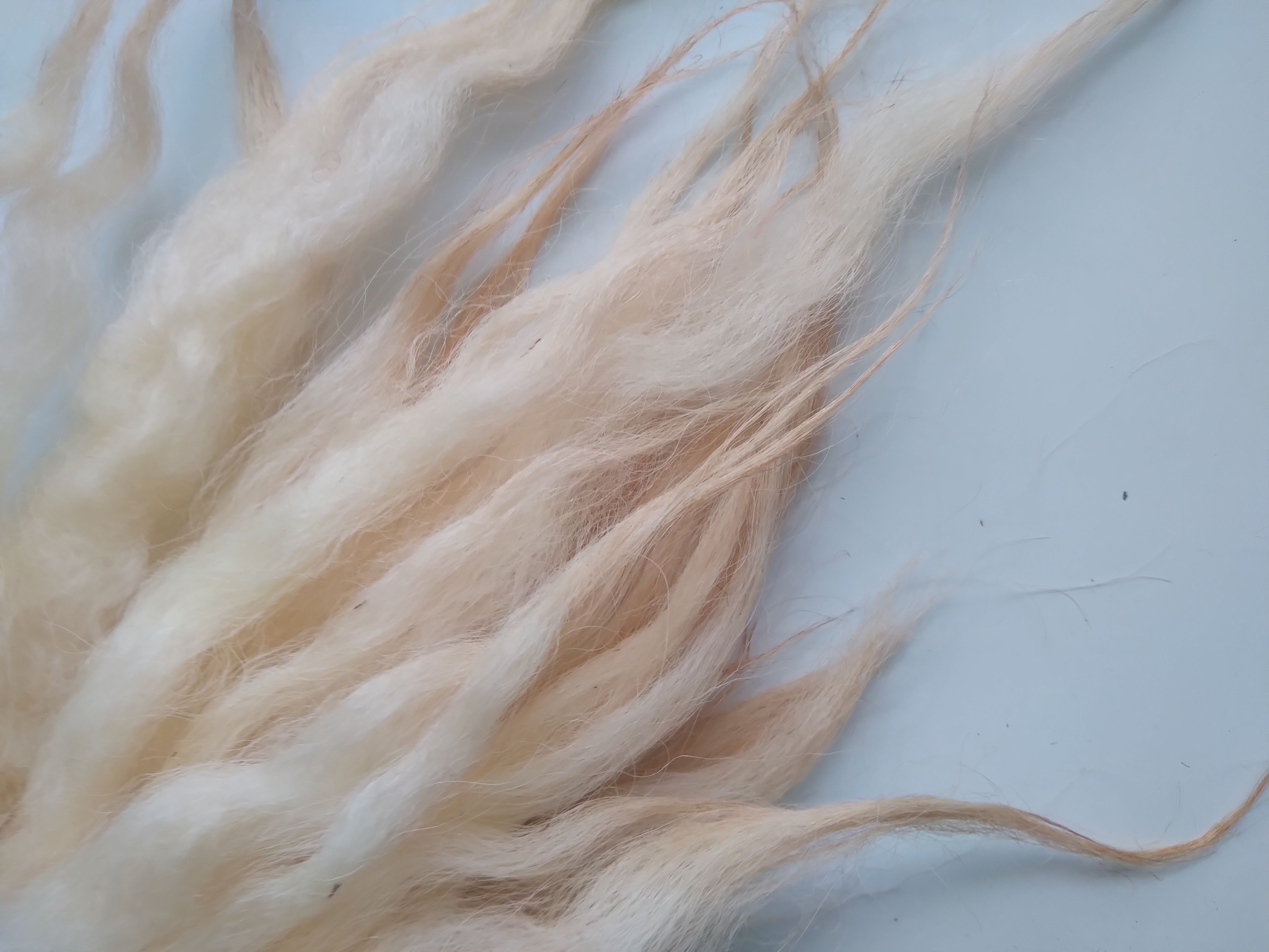 These locks have been very well washed by hand, and the hand dyed in a very pale strawberry blonde tone.